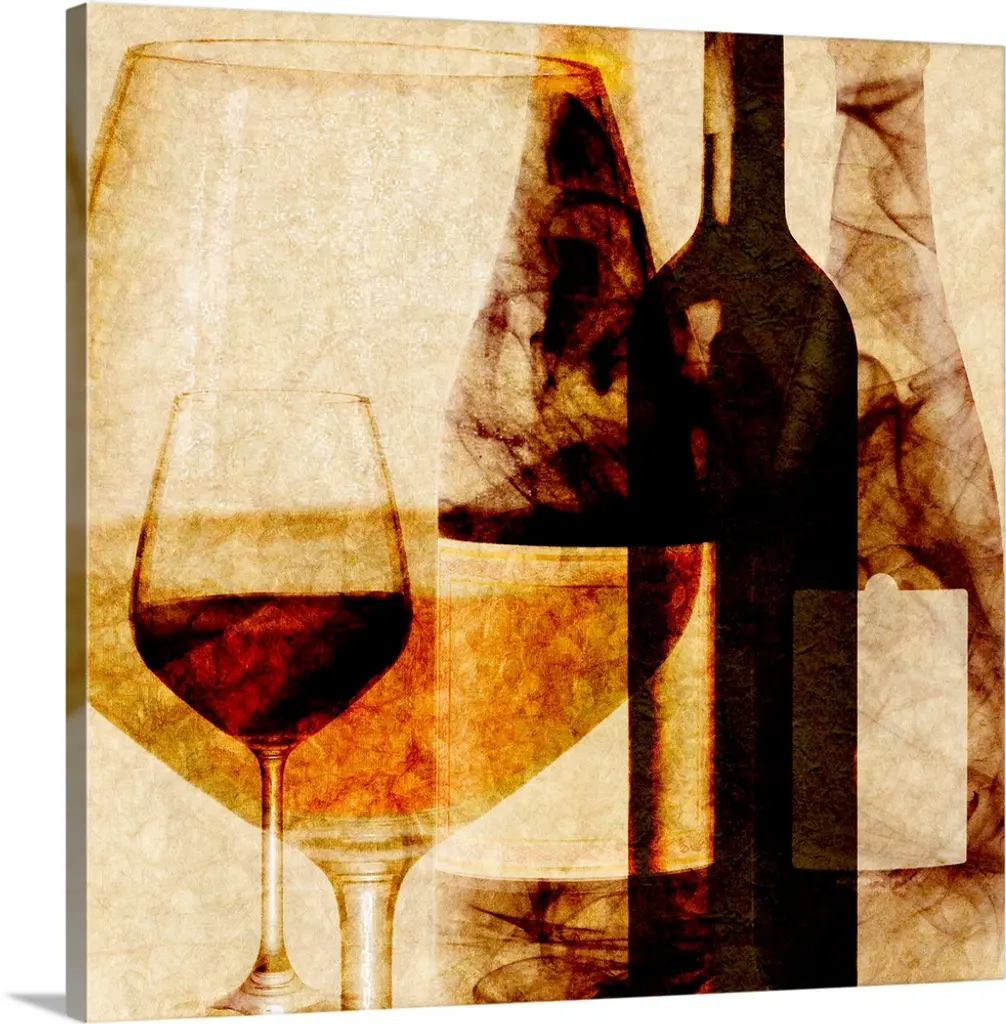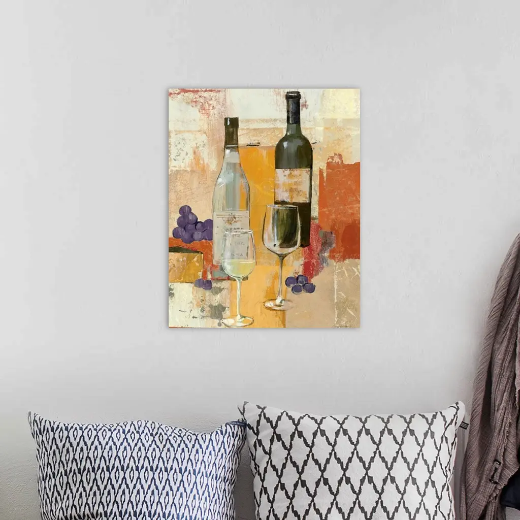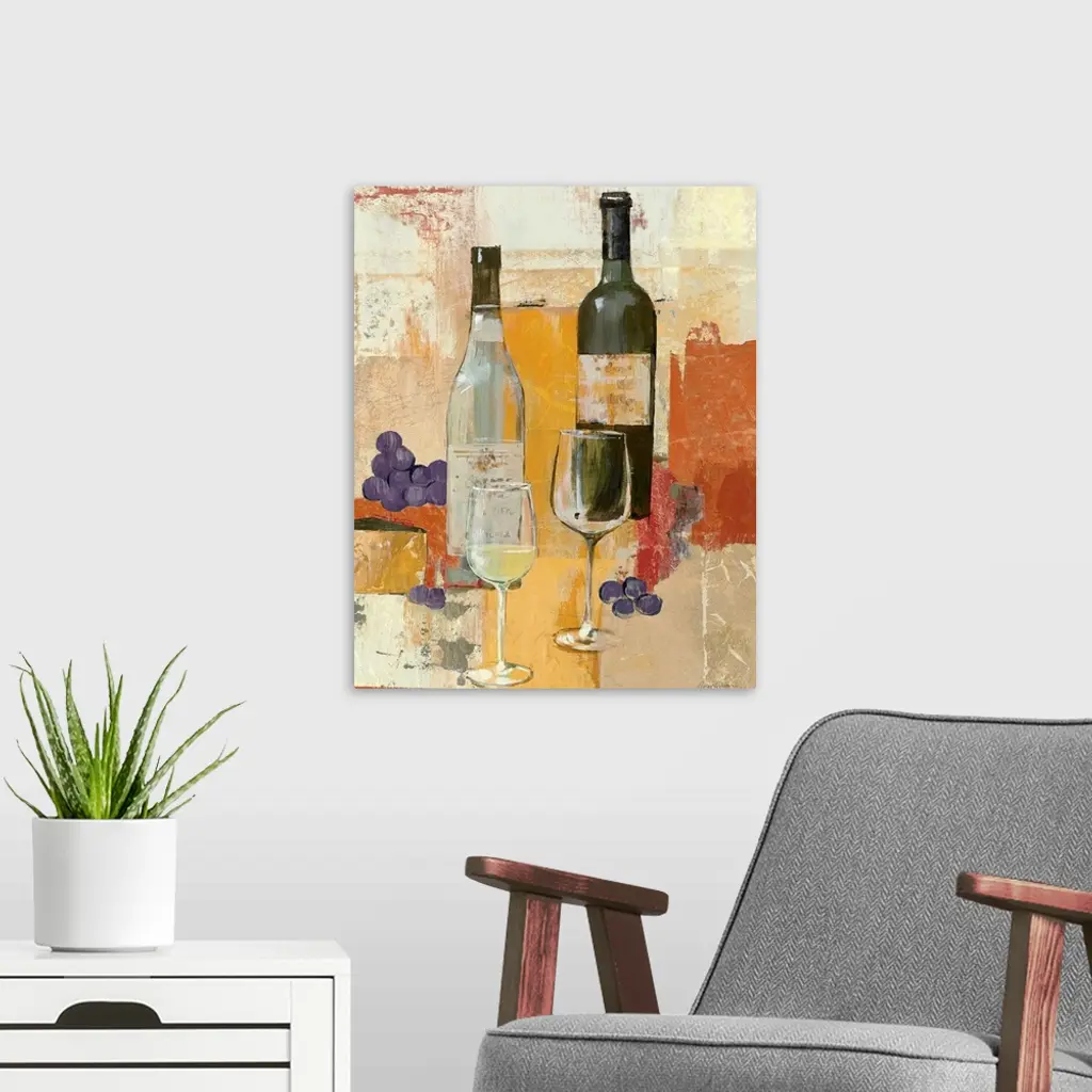 Home docor painting of two wine bottles and glasses with some grapes on the side on a block-style textured background.
