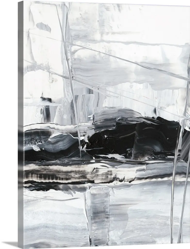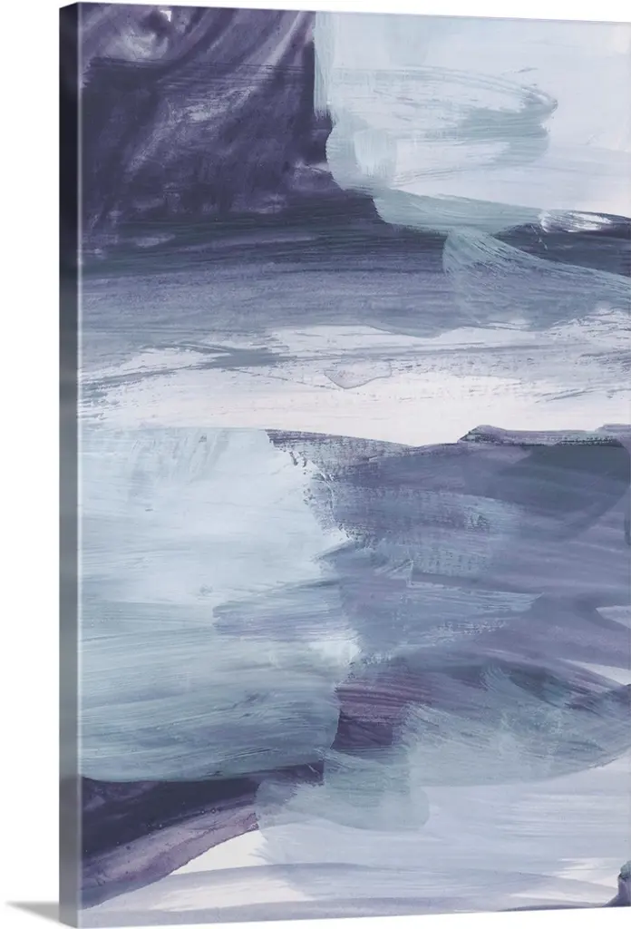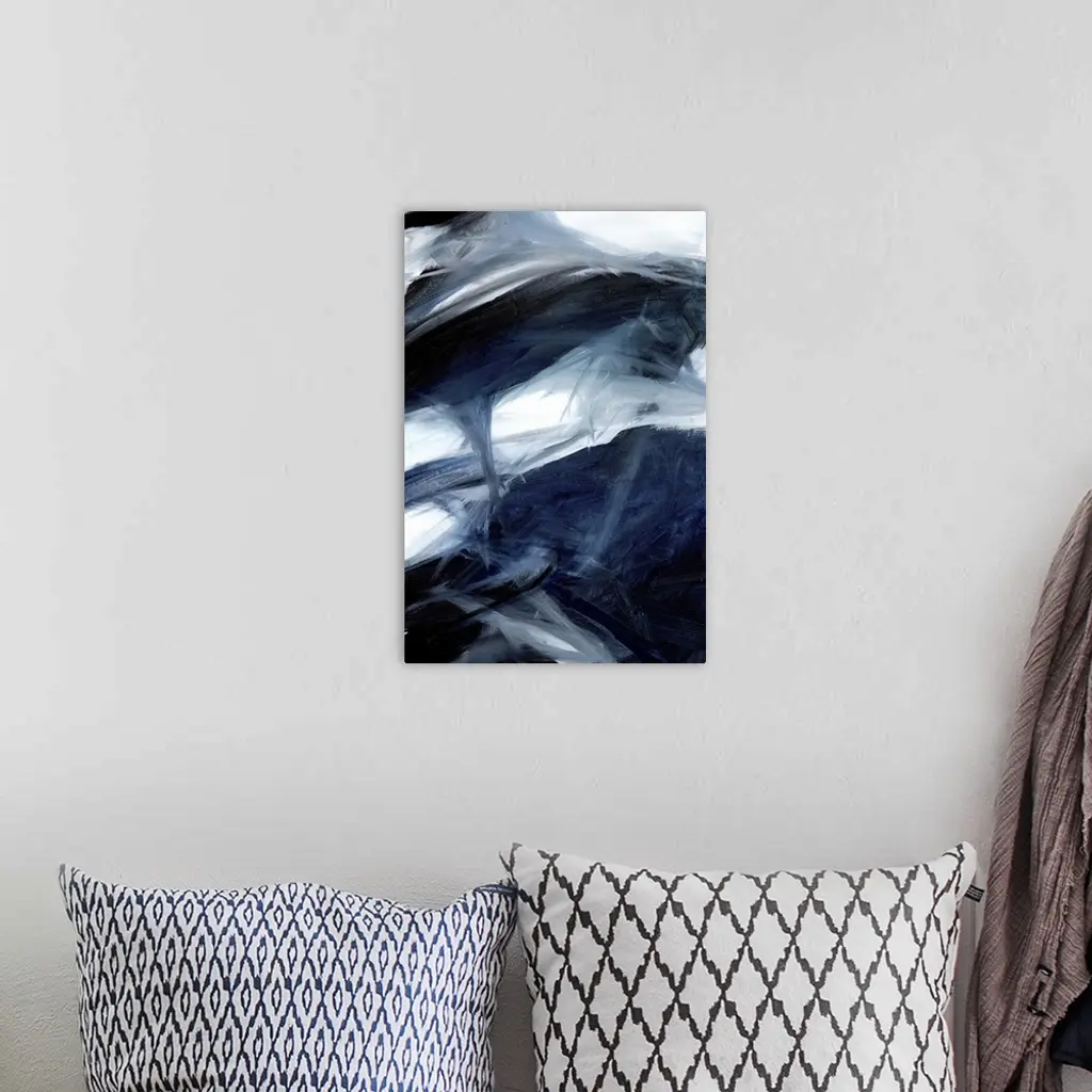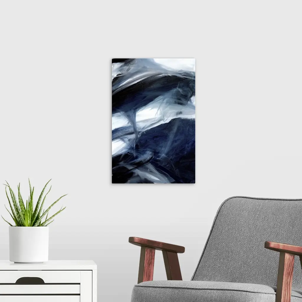 Contemporary abstract artwork in dark shades of grey and blue with small areas of white.