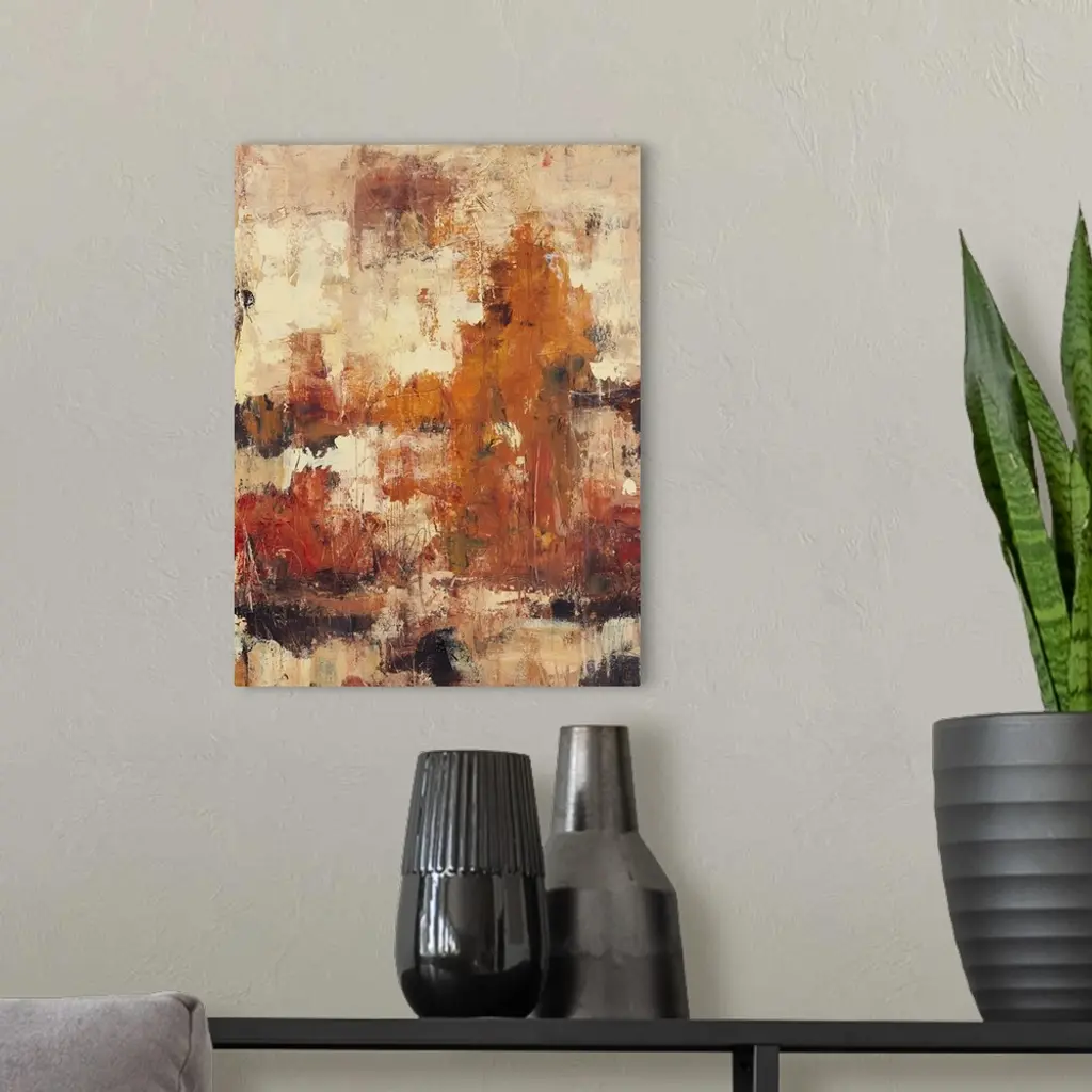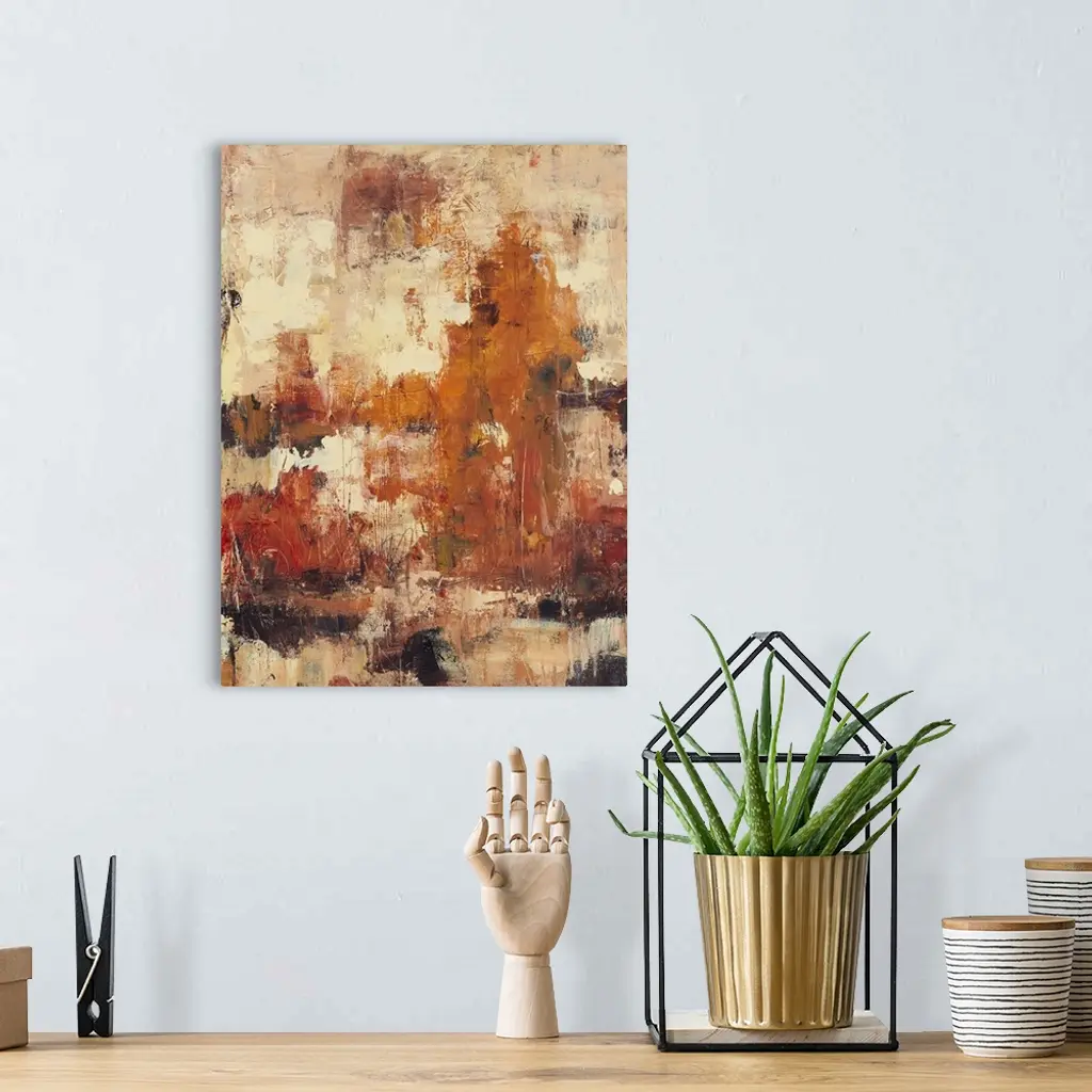 Abstract artwork that uses autumn colors splashed onto a neutral background with a distressed look.