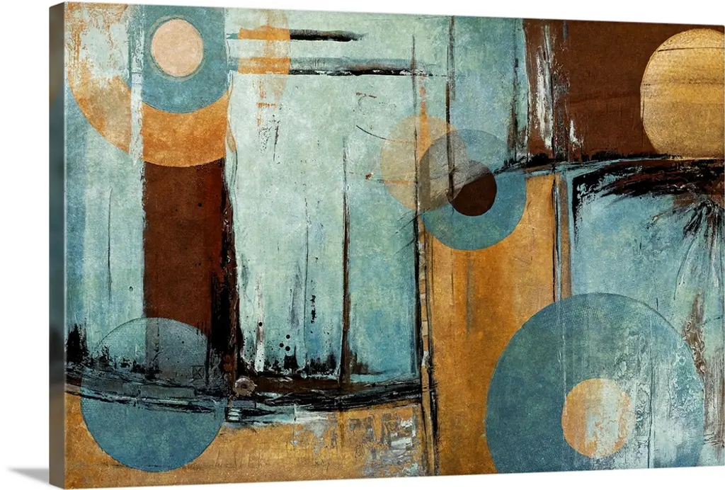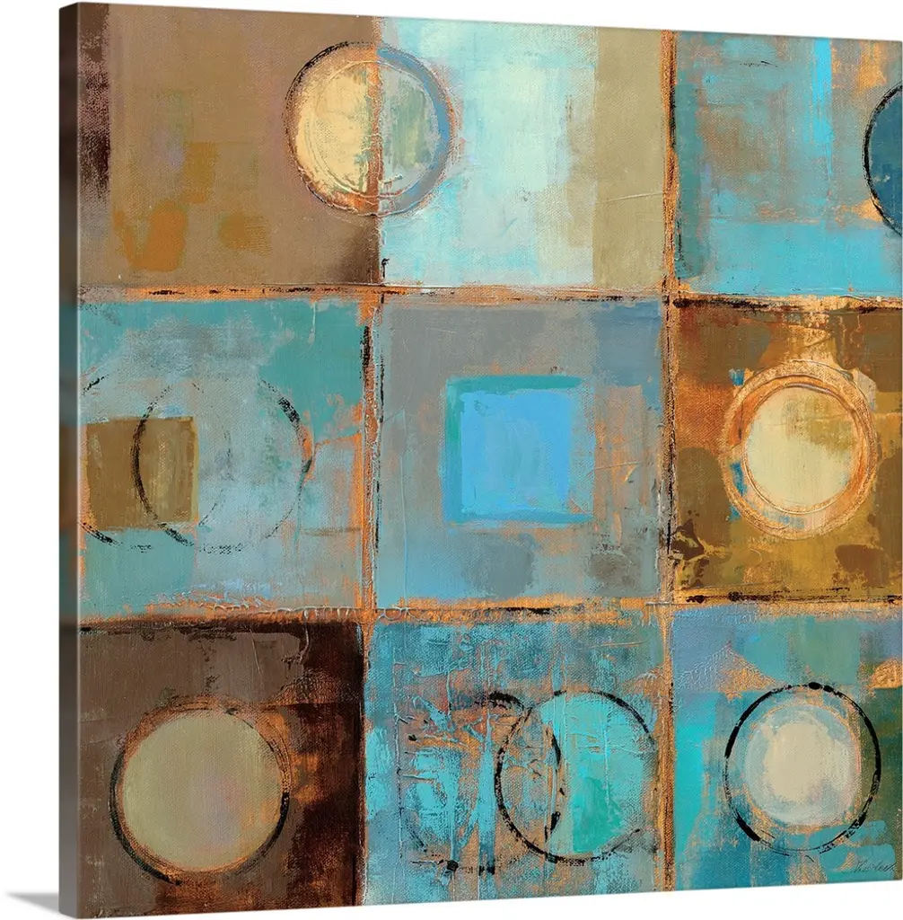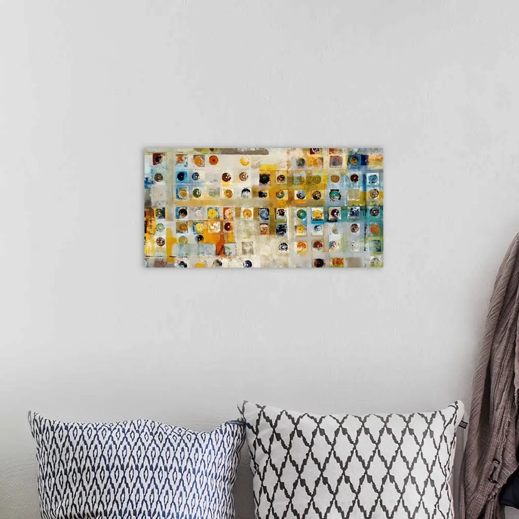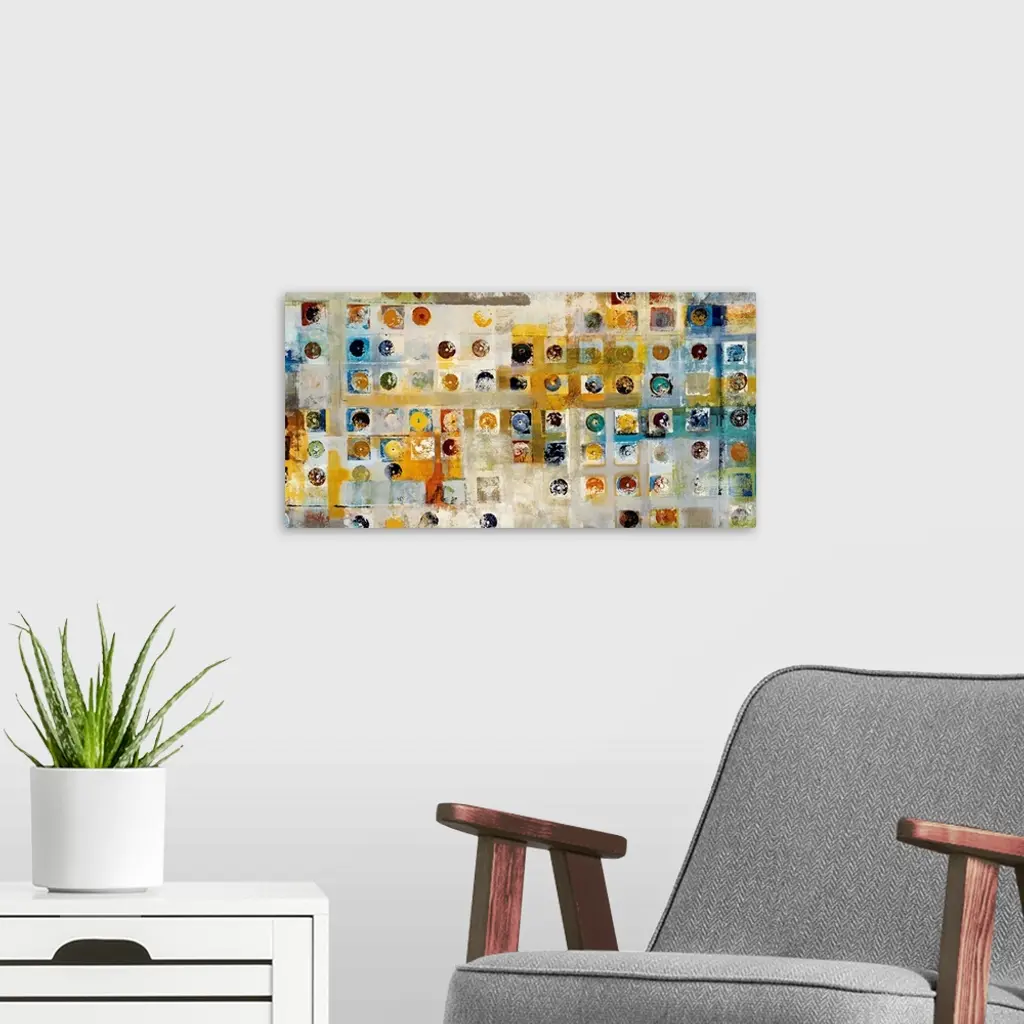 This is a horizontal, abstracting painting of a grid of shapes filled with circles and squares.