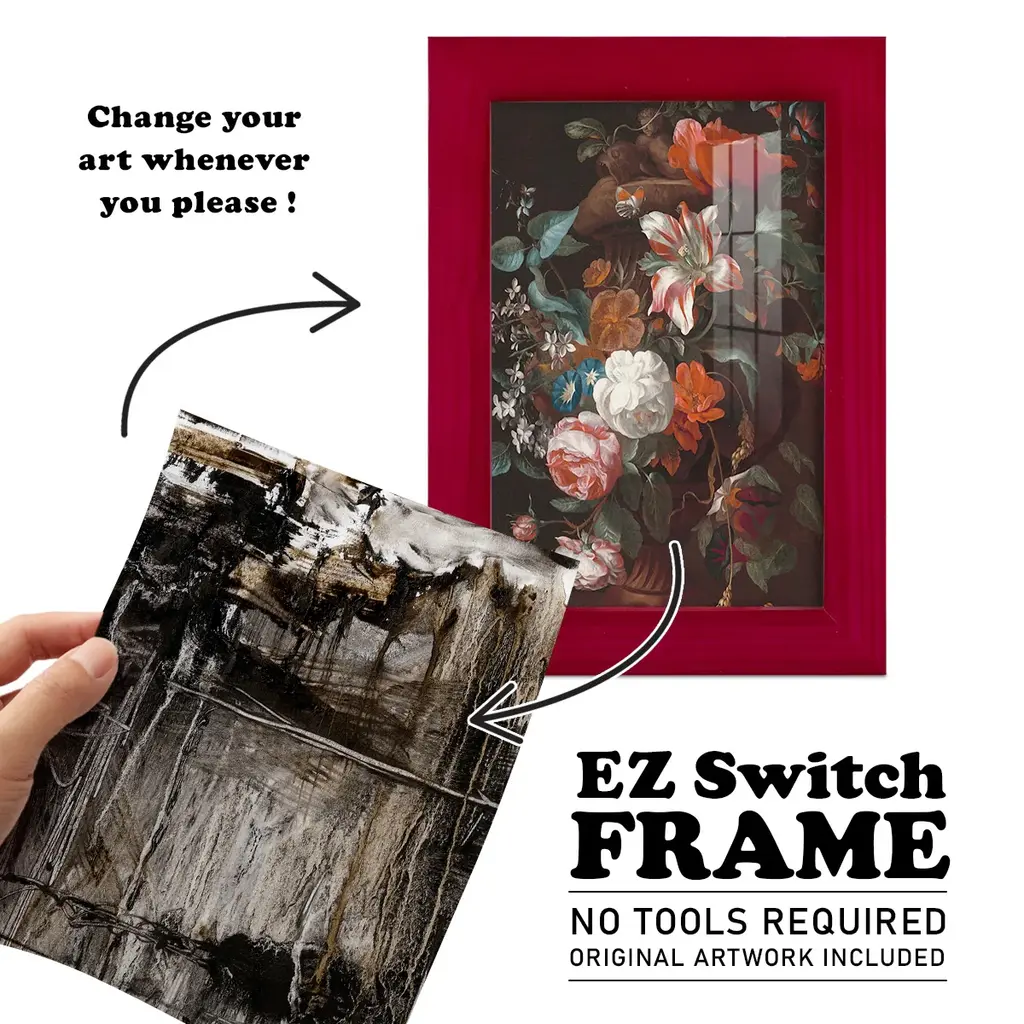 Continuum II -EZ SWITCH Framed Print w/glass-Cherry Red A delightful, framed print. Featuring a solid wood frame with real wood glass. This premium print is giclee quality. In addition, every frame features a removable back and table top stand. This allows you to change your art in the future or to just stand the art on a table for a new look. We are sure you'll enjoy our new series of EZ SWITCH Framed Art. Solid Wood Frame Real Glass Removable / Replaceable Art Built in Tabletop Stand Sizes range from 4x6 up to 12x15 - buy just one or pair them up as sets as you see fit.