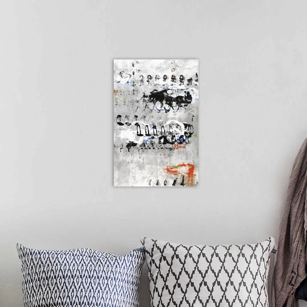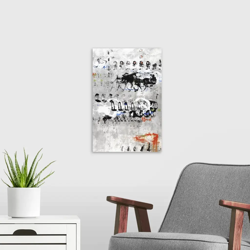 Large abstract painting with a gray and white background and sporadic circular and non-uniform shapes on top in black, orange blue, and green hues.