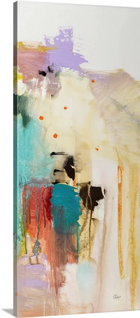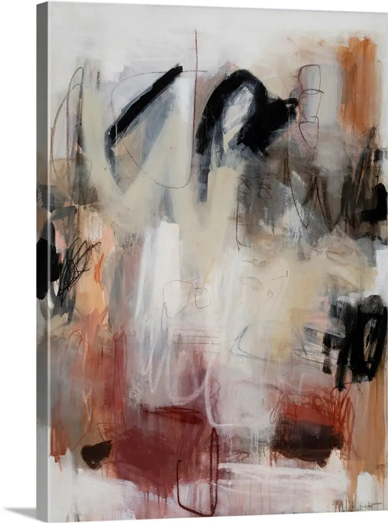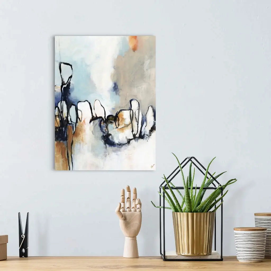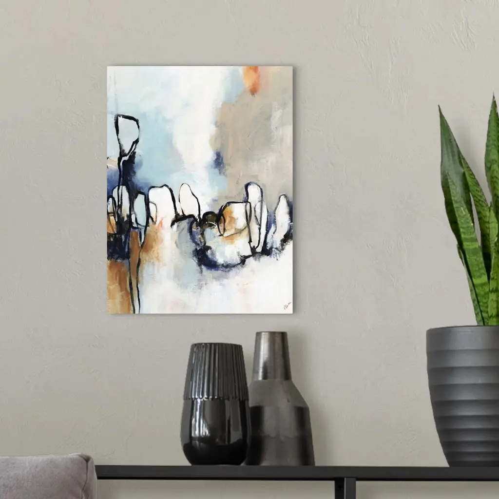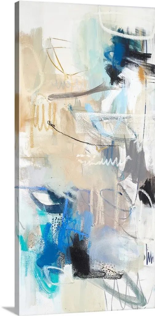 Contemporary abstract painting using dark dripping blue against a neutral background with organic shapes.