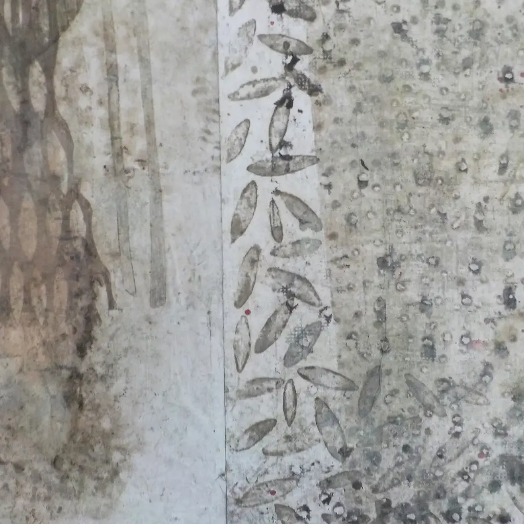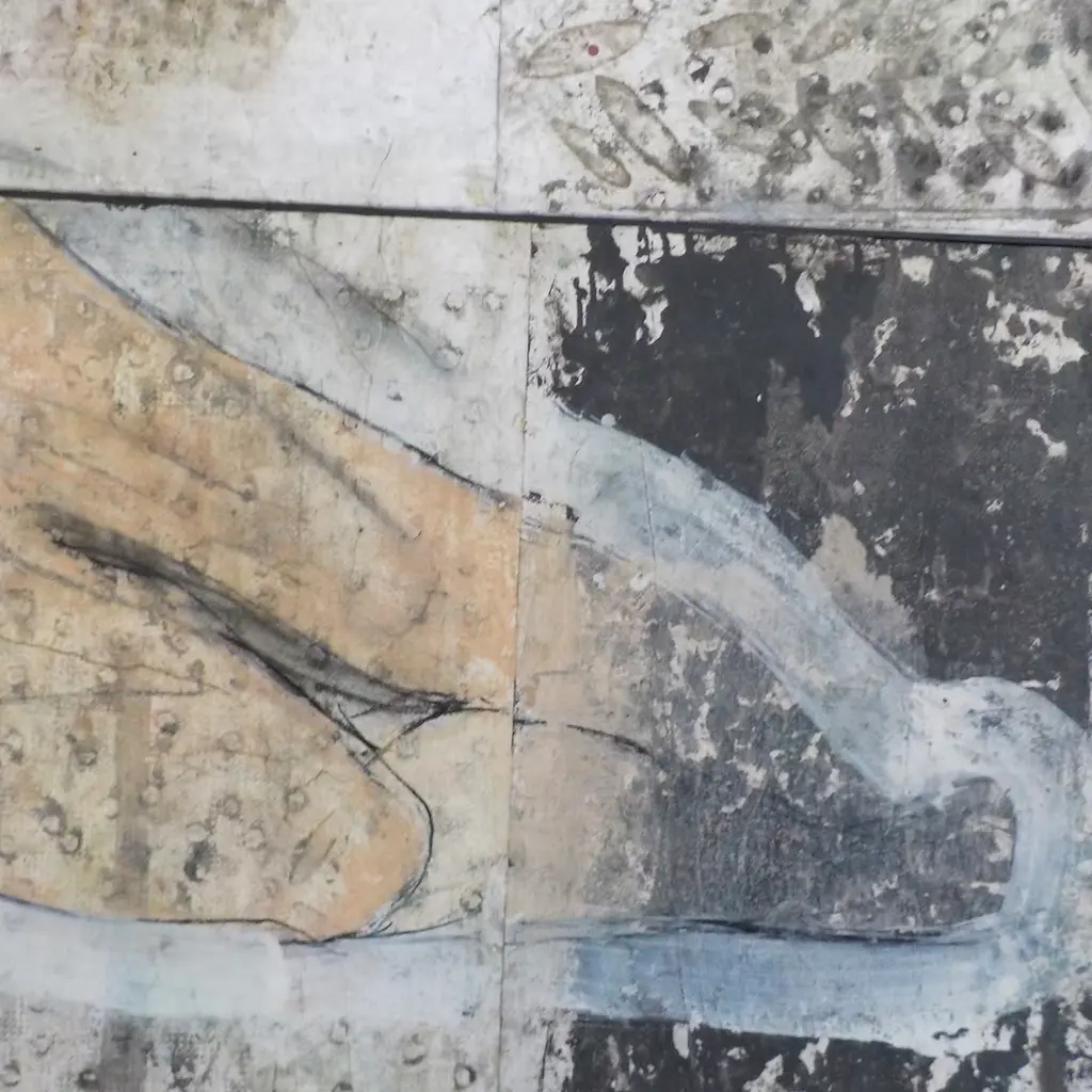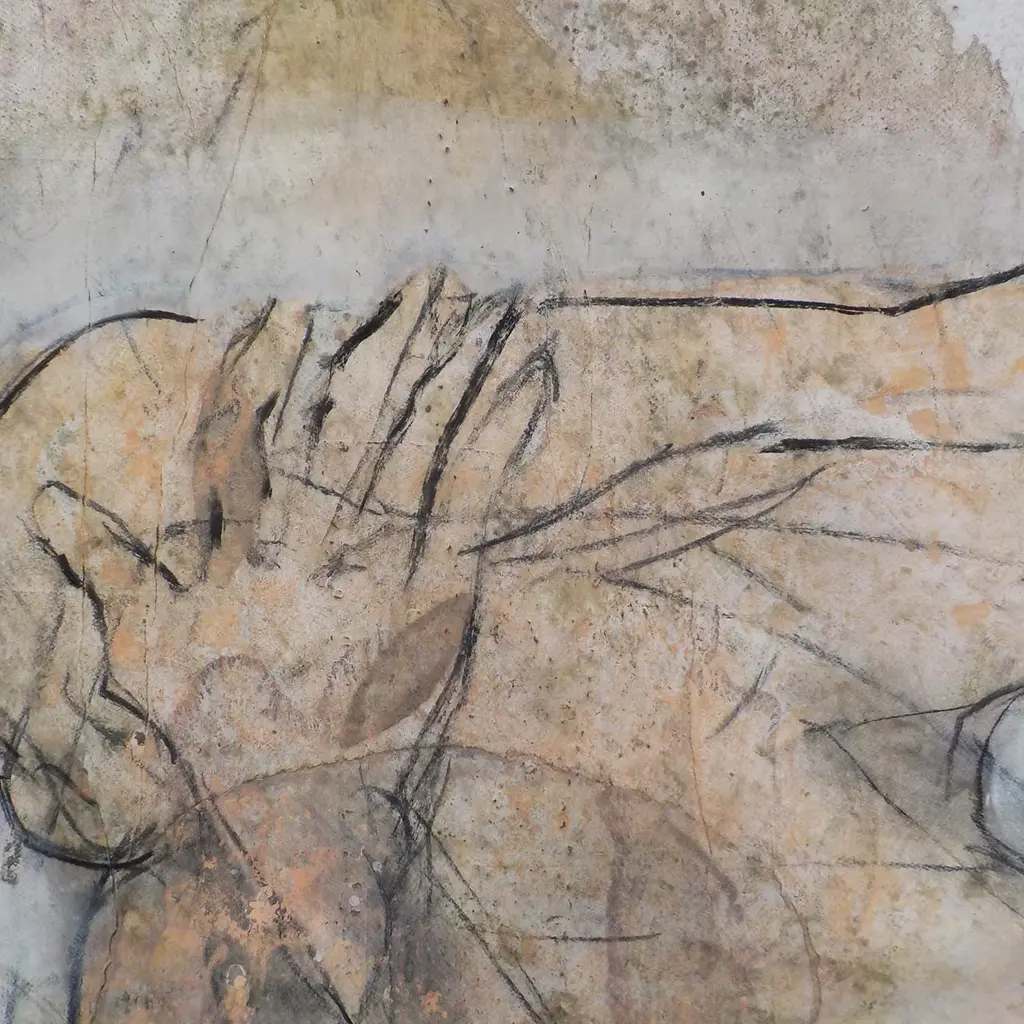 A splendid large-format artwork from an exclusive series that reinterprets Renaissance and Baroque artists with a contemporary flair, this painting depicts details from Caravaggio's 'Conversion of St. Paul'. Created on paper using alcohol colors and pigments, showcasing traces of charcoal drawing, the lines and patterns are made with the use of an intaglio press and firing technique, the artist's signature style.