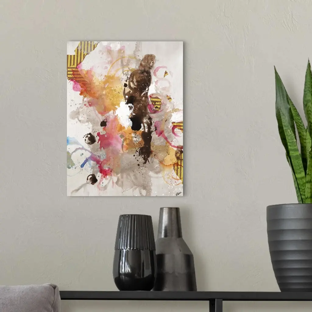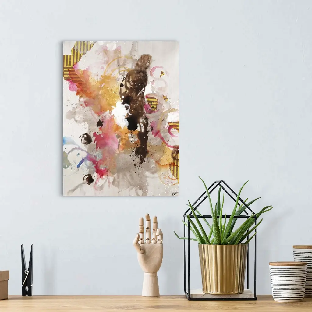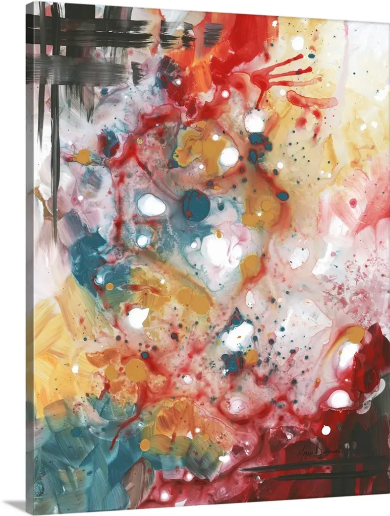 Abstract painting of overlapping splatters, rings, and patches of various colors, including striped areas, on a light, neutral background.