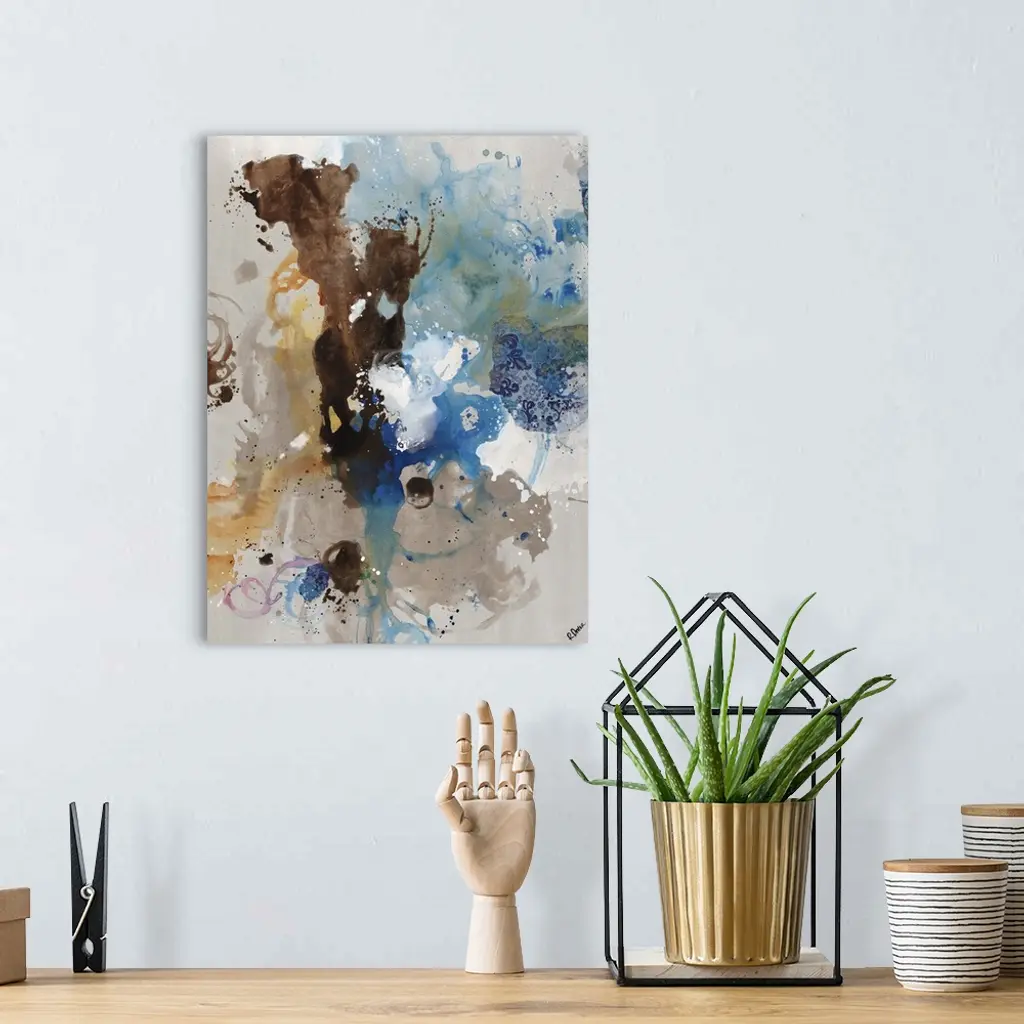 Abstract painting of overlapping splatters, rings, and patches of various colors on a light, neutral background.