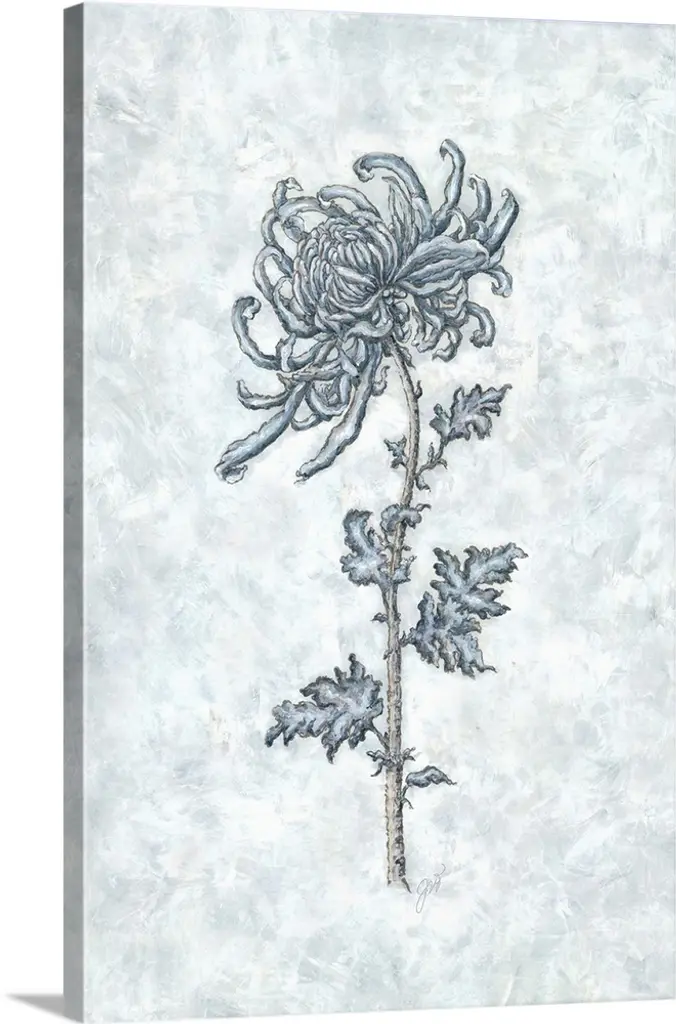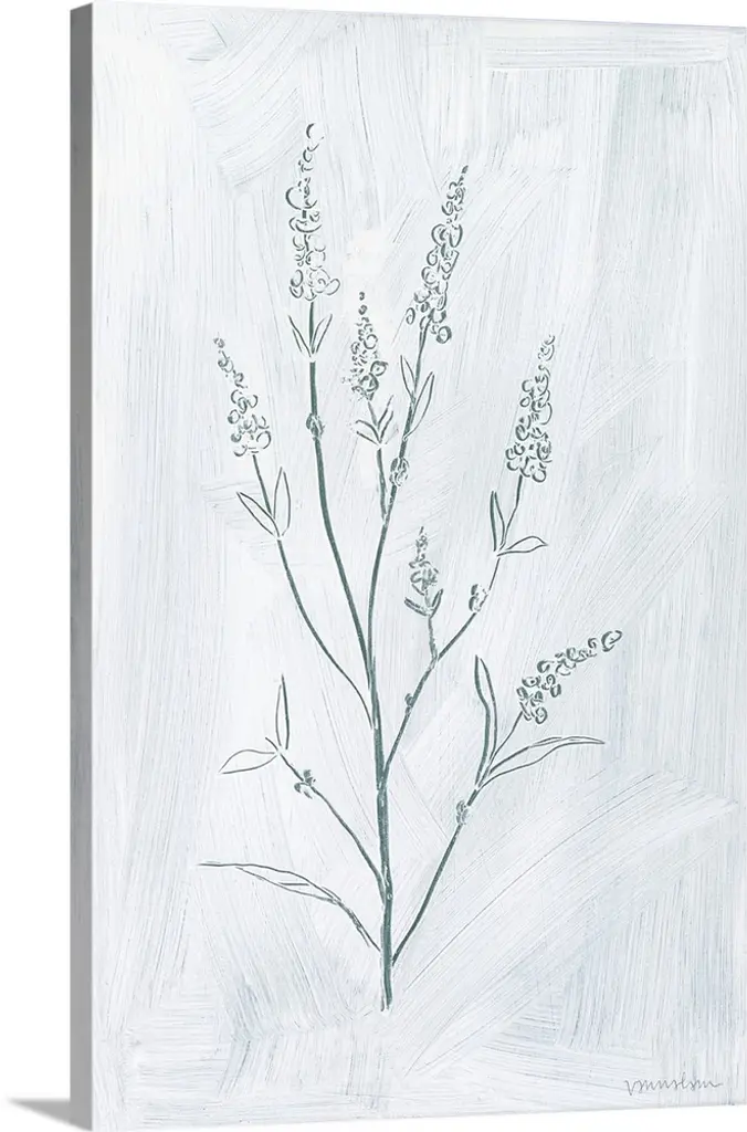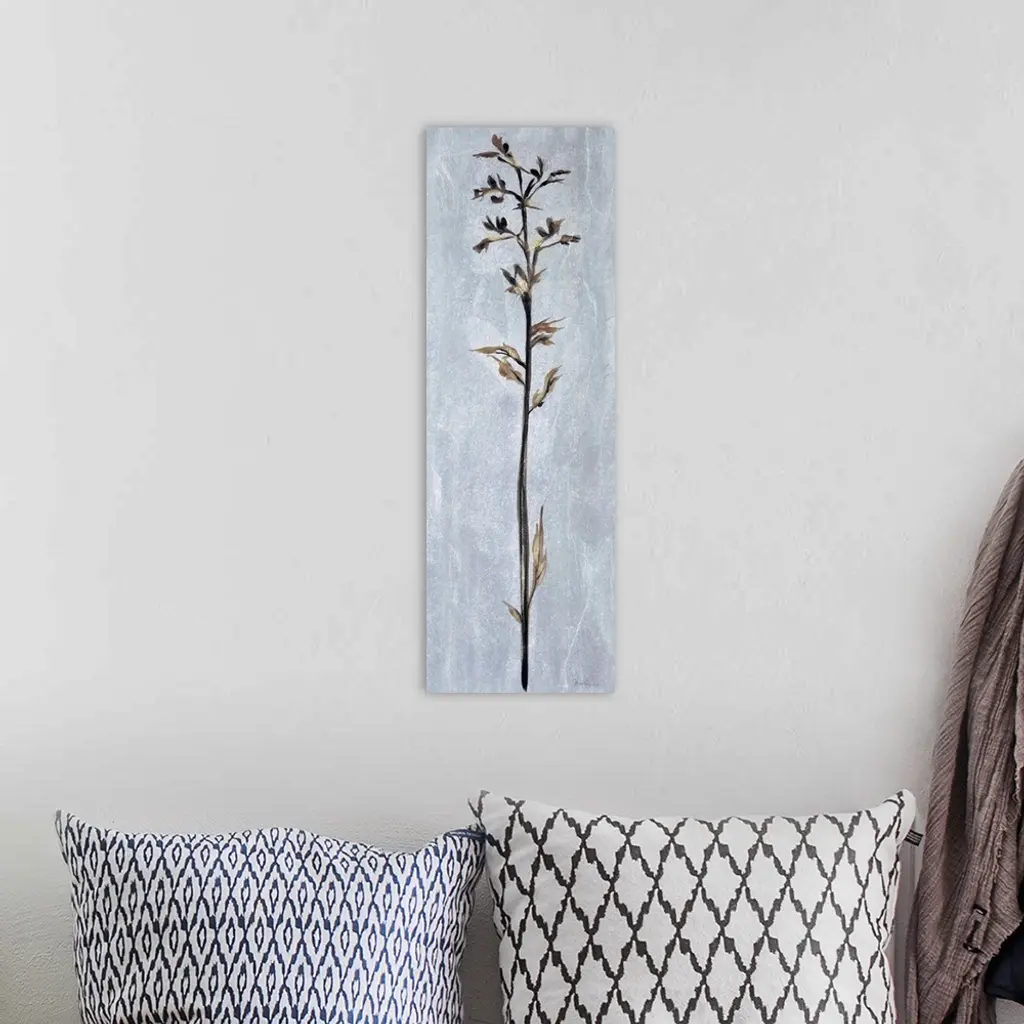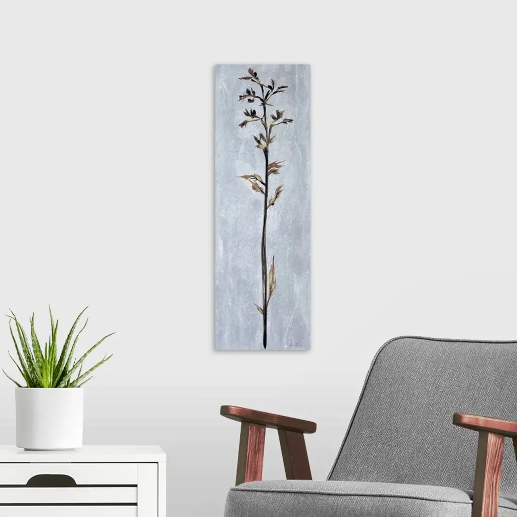 Contemporary painting of a tall thin flower against a pale gray almost like stone.