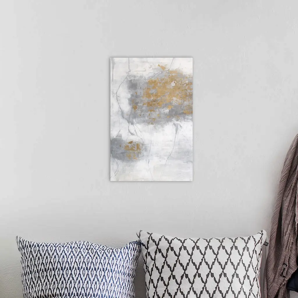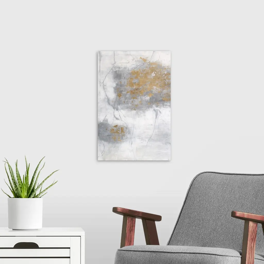 Soft abstract painting with a white background and gray lines on top creating texture, a large splotch of silver on the right and gold flakes scattered around.