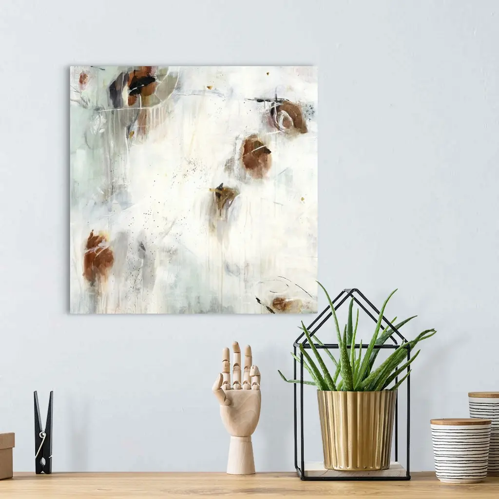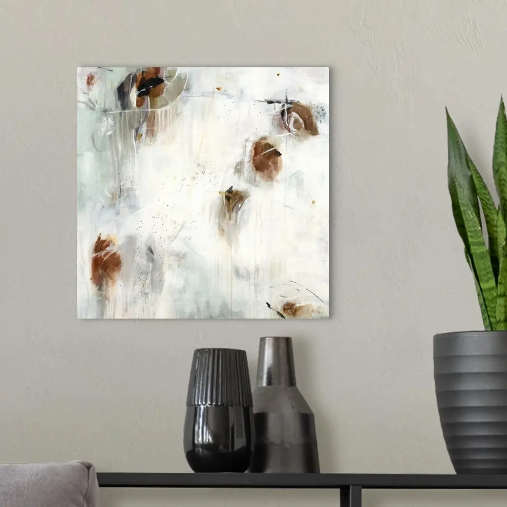 A contemporary abstract painting using splashes of brown against a neutral background.