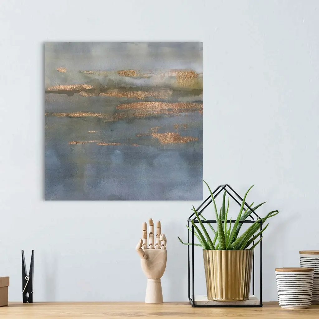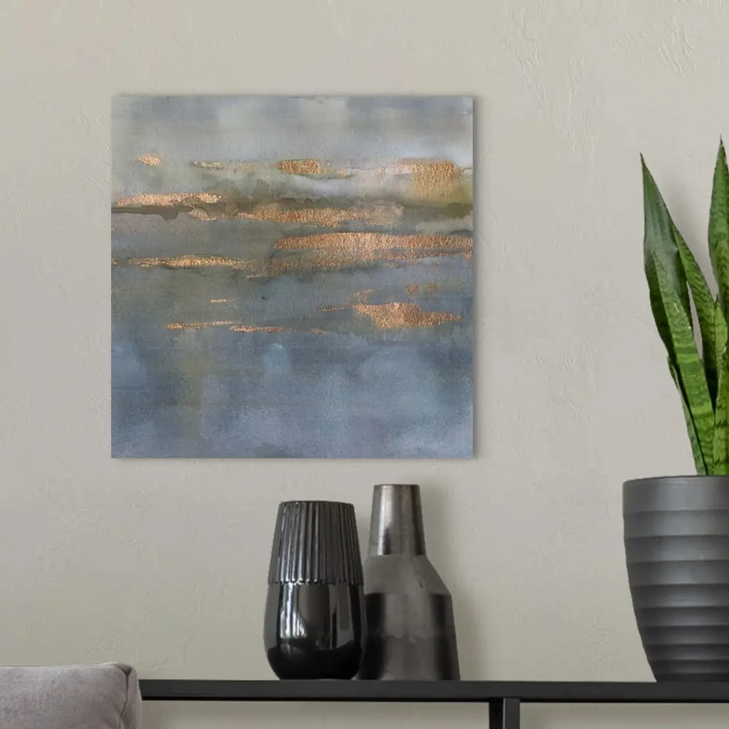 Square abstract painting of horizontal blurred brush strokes in gray tones with hints of metallic copper.