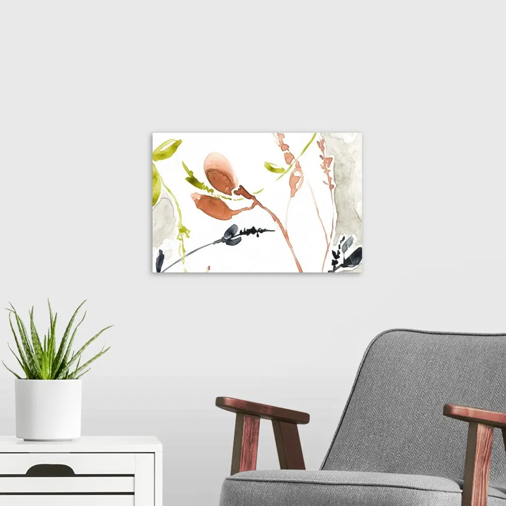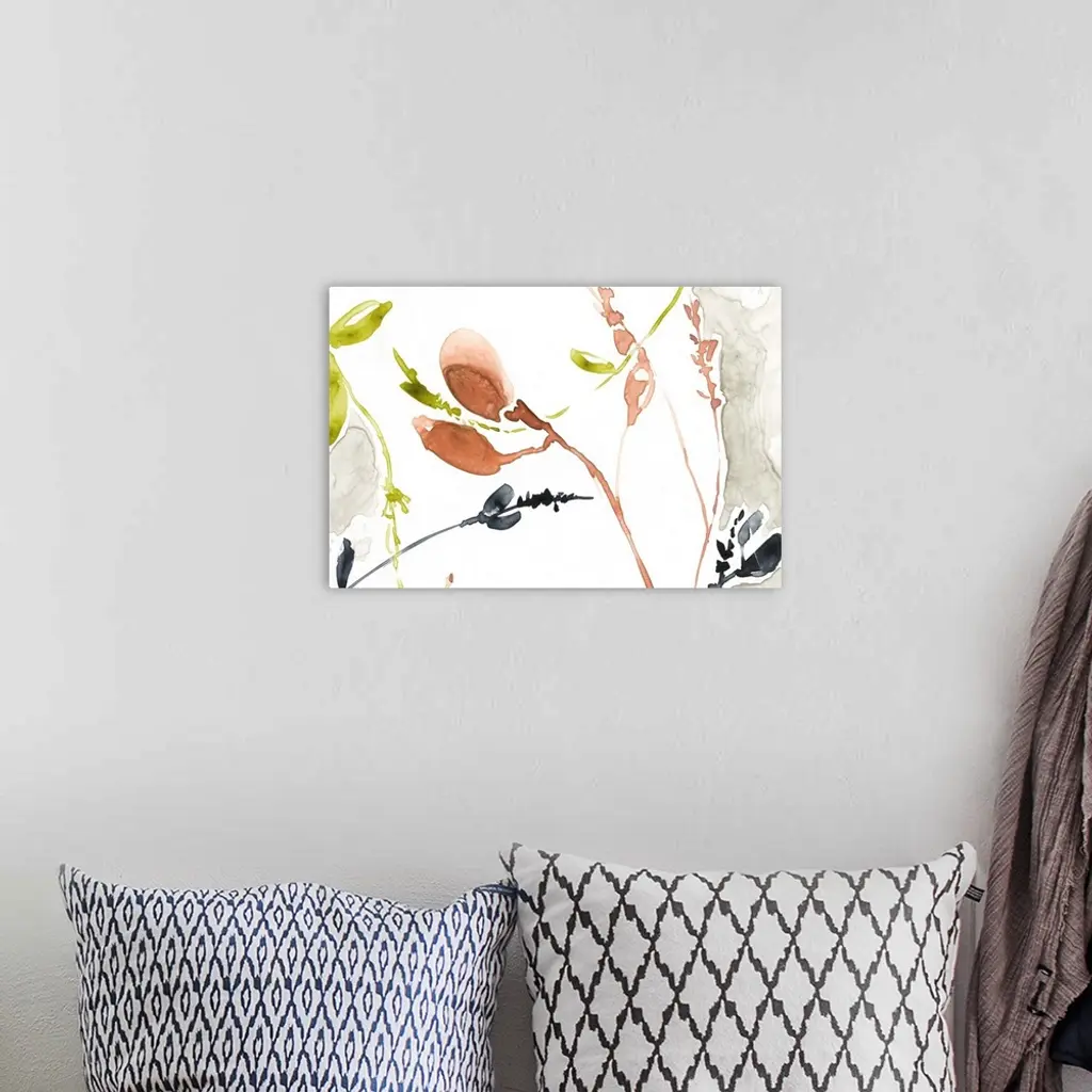 Watercolor painting of flowers and leaves in red, black, and green, on white.