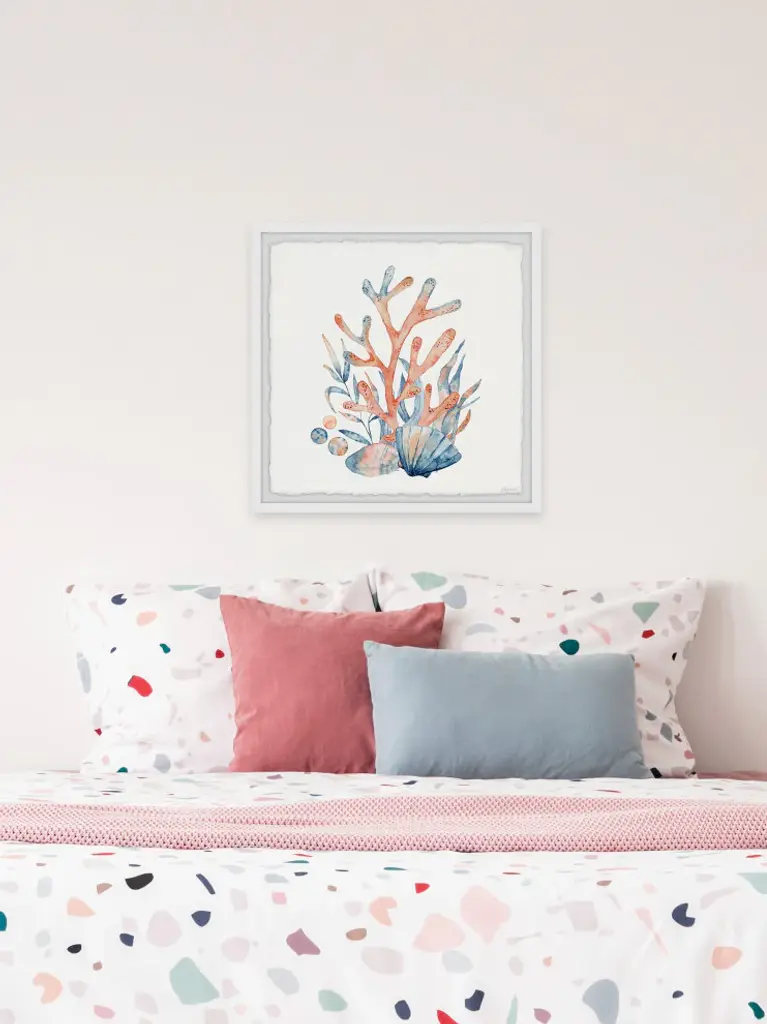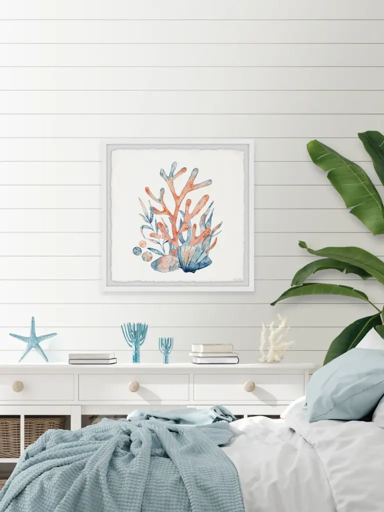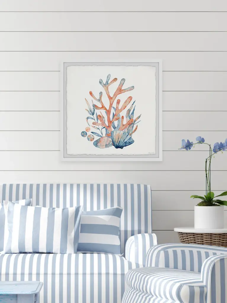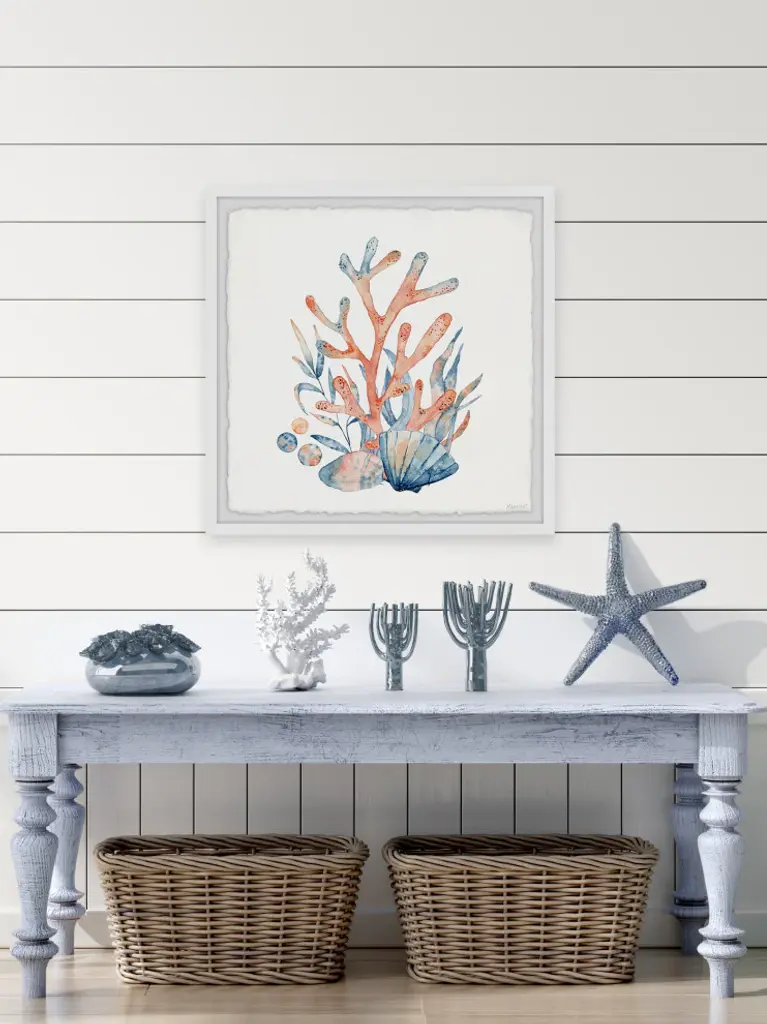 Make your space more calming and aquatic with this watercolor painting print that features a bunch of coral and two clams all in a blue and orange color scheme. Proudly printed in the USA, this piece is printed on high quality archive paper and professionally hand-framed. With wall-mounting hooks included, this artful accent is ready to hang up as soon as it reaches your front door.- Top quality Giclee print on high resolution Archive Paper- Hand cut deckled edges- High quality durable non-warping frame- Finished under shatter resistant plexiglass- Arrives ready to hang- Includes a certificate of authenticity- Printed in the USA