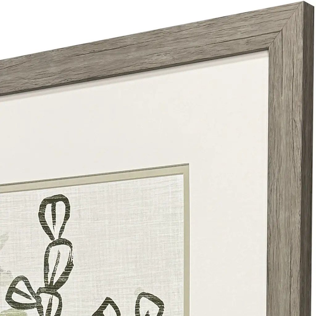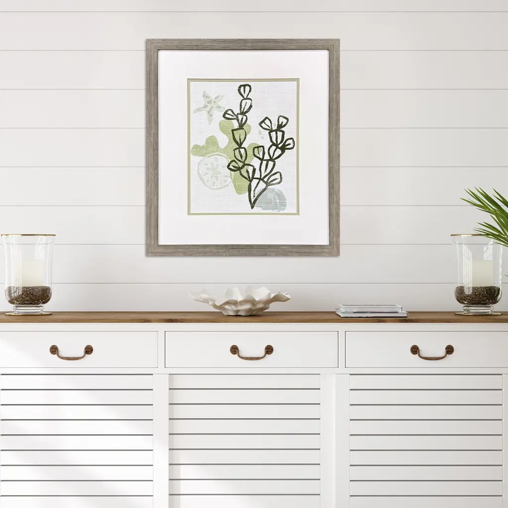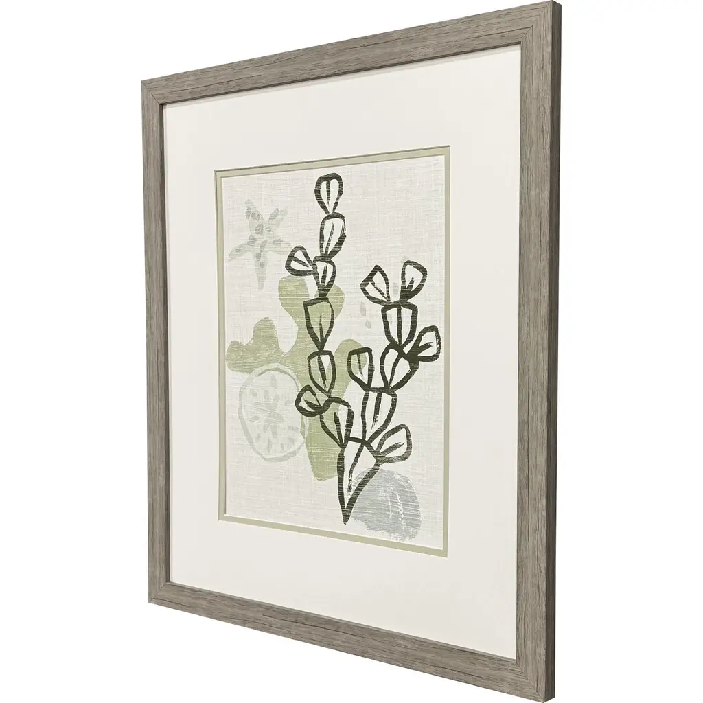 A whimsical coral print series is double matted in white and pale green. Framed in a block profile moulding in a distressed wood finish.