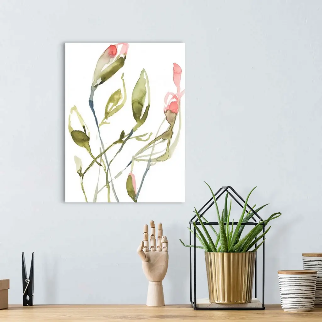 Simple, loose watercolor painting of green plant stems and buds with coral pink flowers