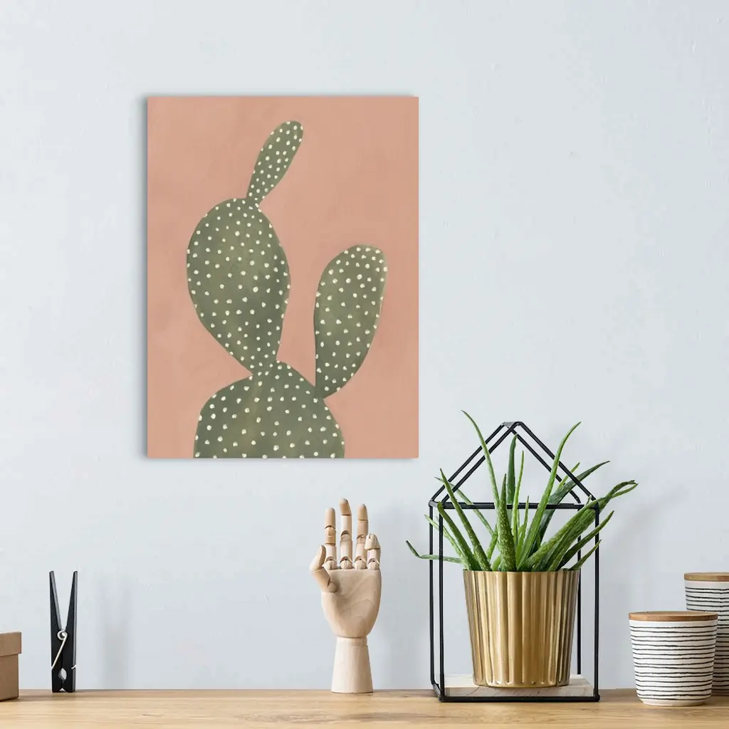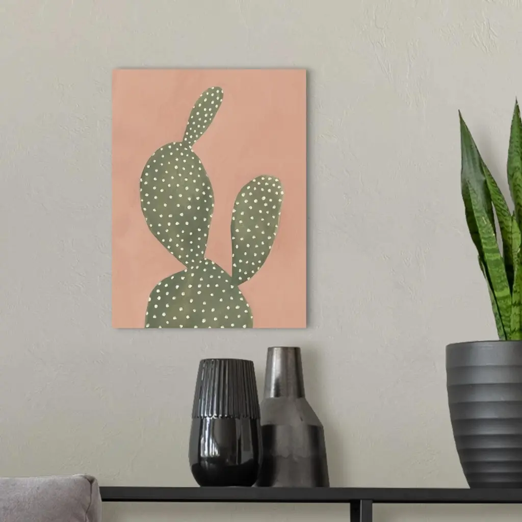 Contemporary painting of a cactus on a coral colored background.