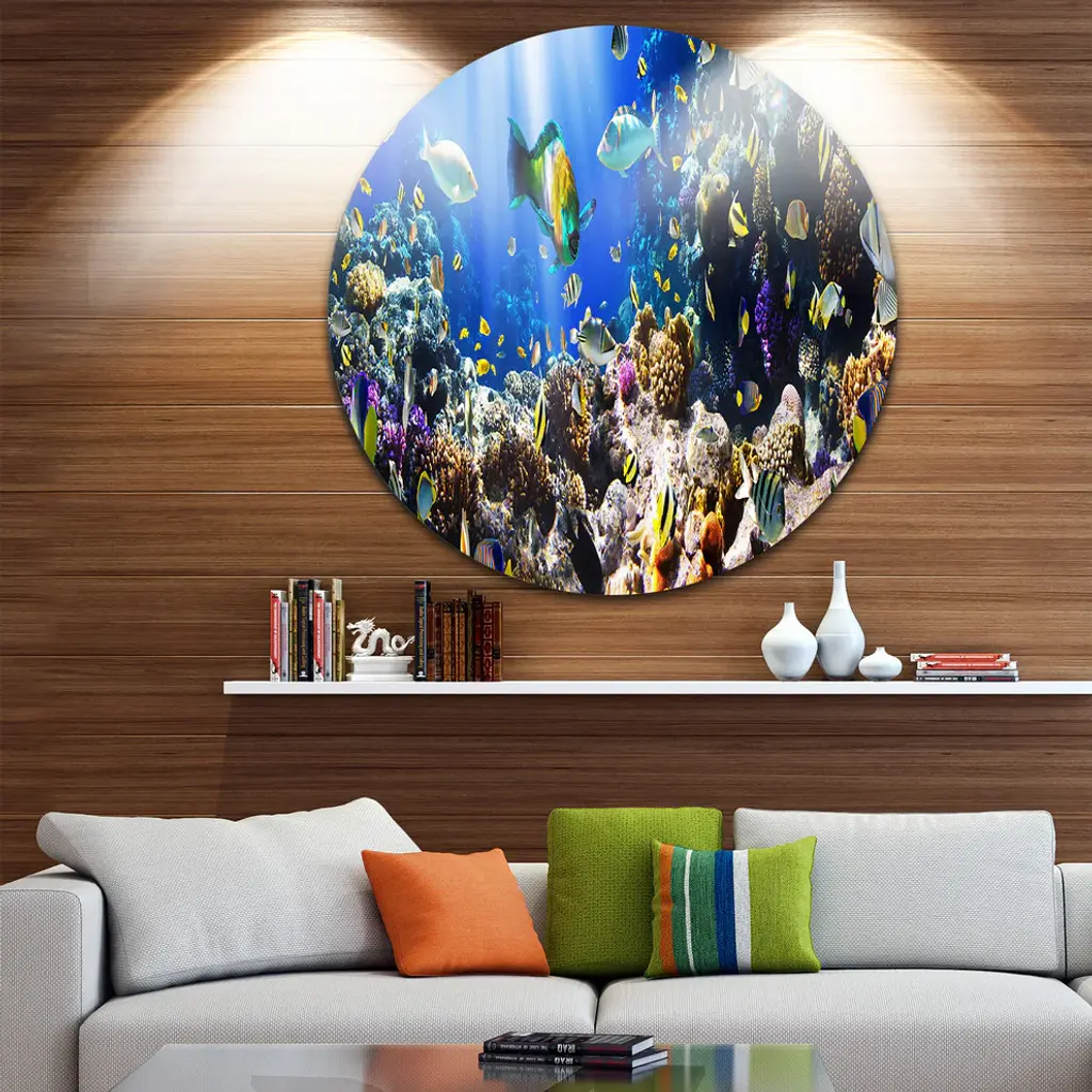 Bring Contemporary Abstraction to your home with this large Circle Metal wall art. This Coral Colony and Coral Fish Metal Artwork makes it the focal point of any room or office. - White Gloss Coating ensures colors are extra vibrant with light reflection.- Aluminum grade Sheet Metal with 1 inch mounting frame on the back giving the illusion that the artwork is floating on the wall..- Mounting Brackets are included along with instructions.- High Quality Digital images are created directly into a glossy aluminum panel producing a stunning and captivating print into the glossy finish of the metal.- Water, Fire and Scratch resistant HD Aluminum panels.- Looks better than any photo paper and guaranteed to last at least 20 years- Easy to clean with a microfiber cloth. Colors are far superior to regular Canvas Art. - Easy to Hang