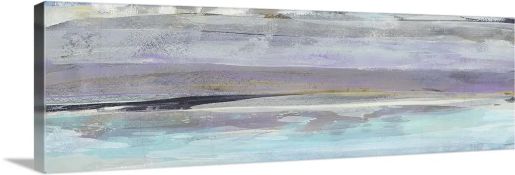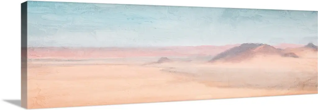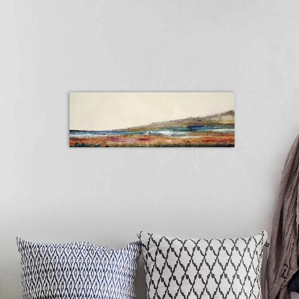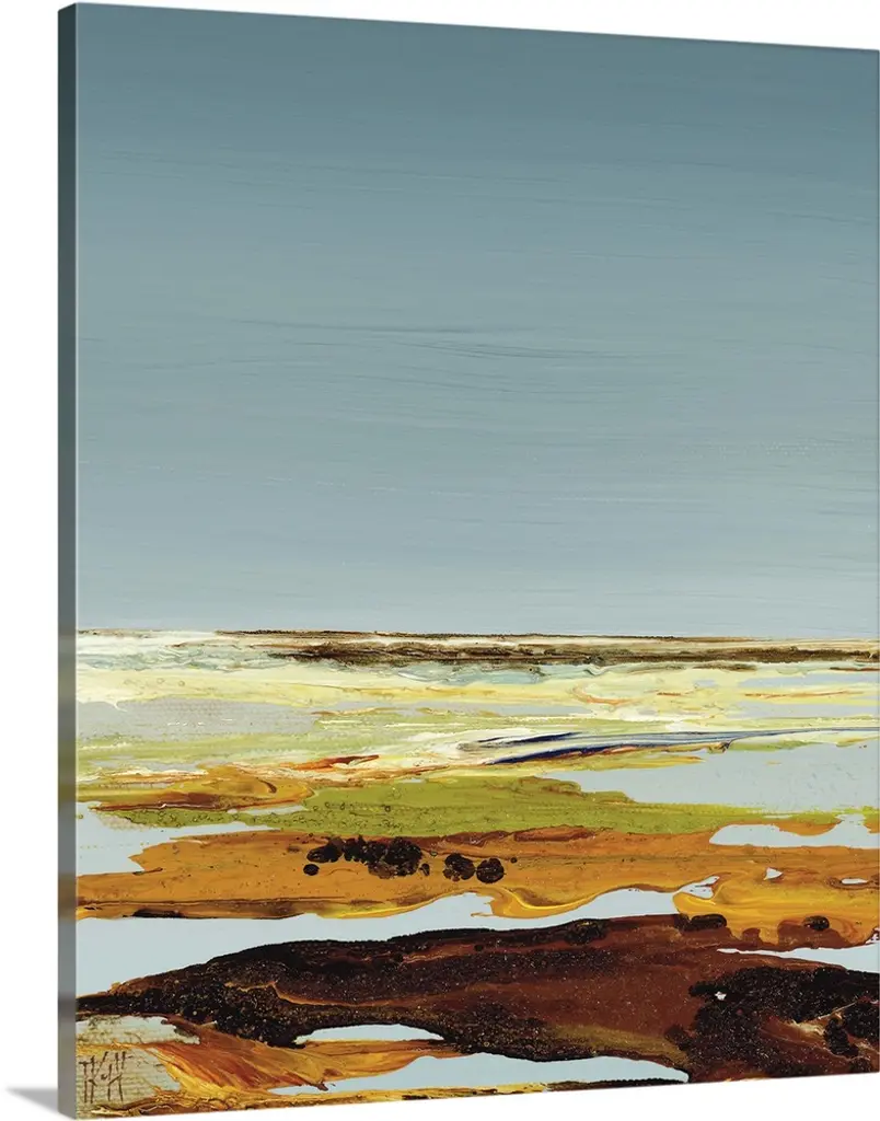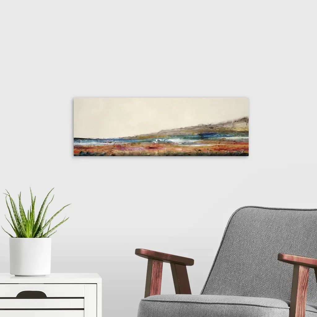 Landscape painting of a vibrantly colored cove surrounding blue waters, beneath a dull cloudless sky.