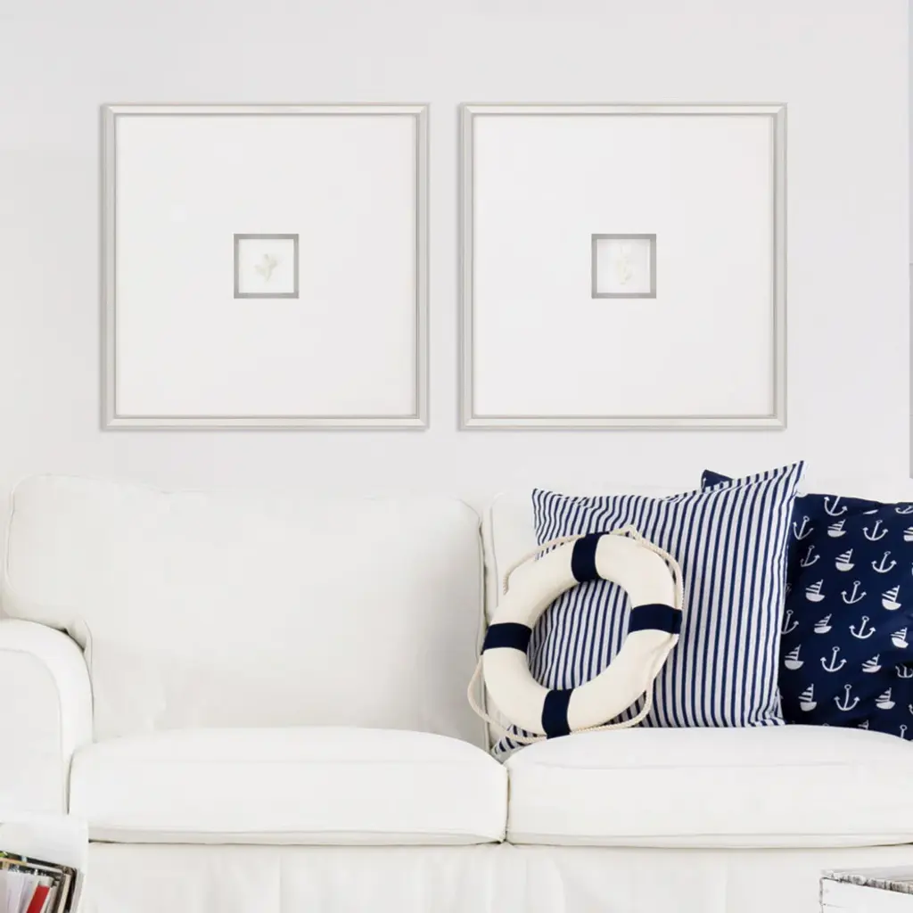 Exclusive hand cast mixed media. Framed in a silver leaf wood shadow box style moulding with gold wash edging and black side.