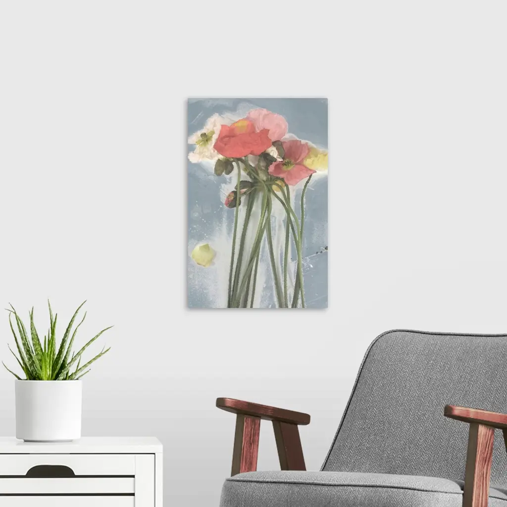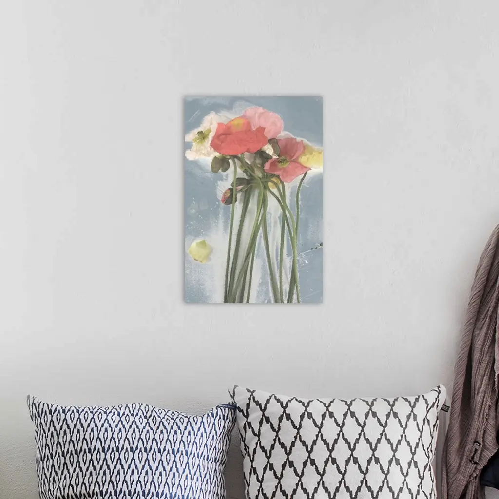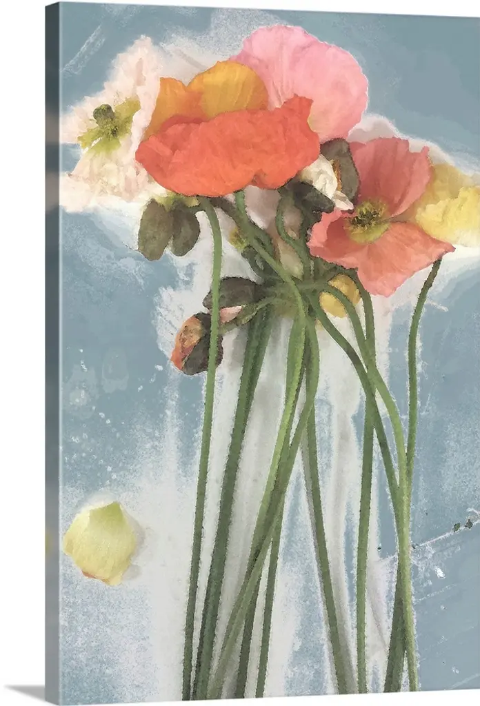 Painting of a bunch of tall-stemmed poppies in shades of coral, peach and yellow against a steel blue background