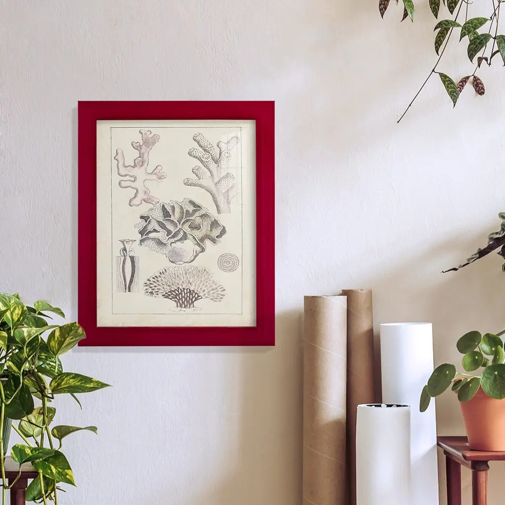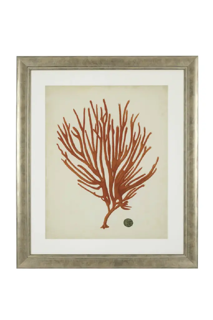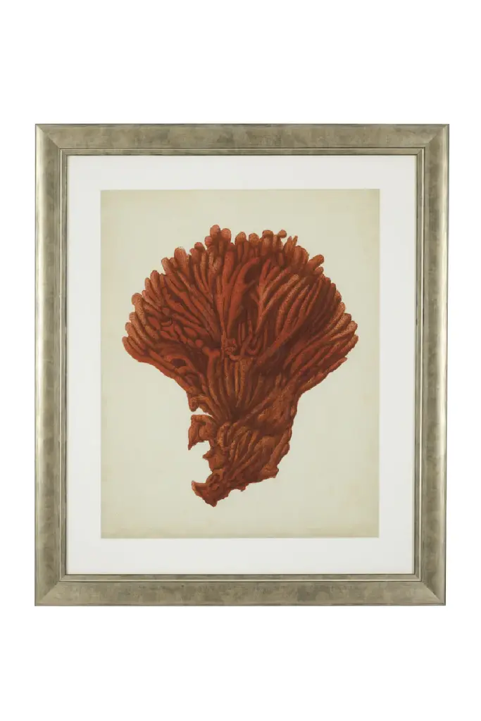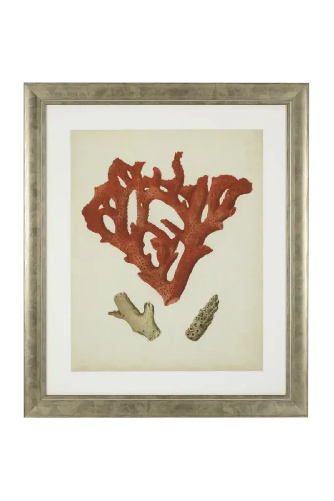 Adorn your home with this stunning set of 6 Antique Red Coral prints. Clockwise: Antique Red Coral I, Antique Red Coral V, Antique Red Coral III, Antique Red Coral IV, Antique Red Coral VI and Antique Red Coral II. All prints come in an antique silver frame with clear glass. Red corals grow on rocky seabottom, in dark caverns or crevices, at depths from 4 to 1500 meters below sea level. They look like small leafless bushes and can grow up to a meter in height.