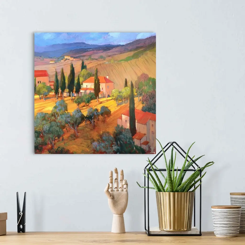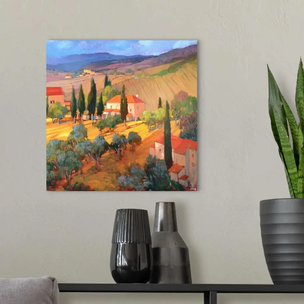 A contemporary painting of a Tuscany countryside, with rolling hills and houses.
