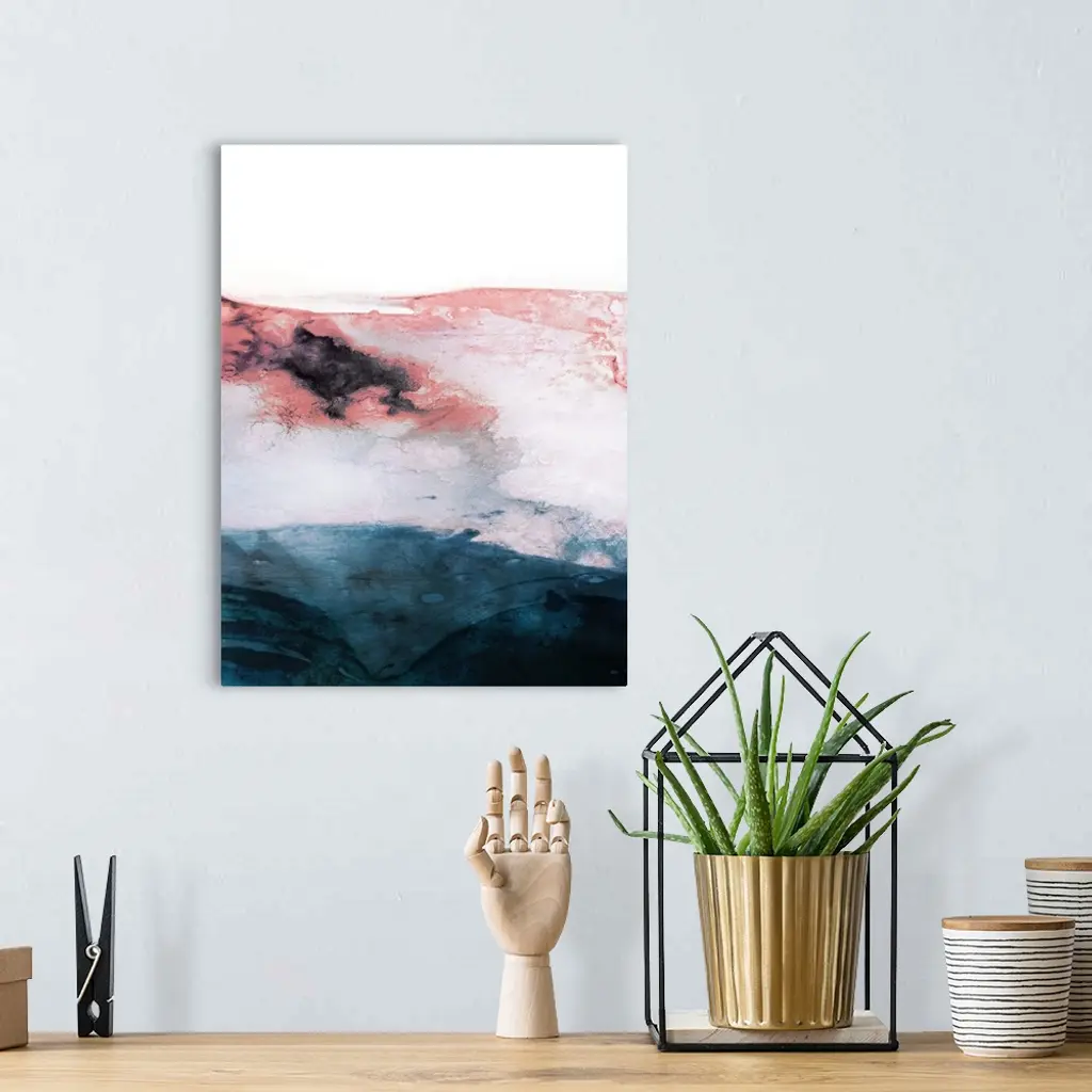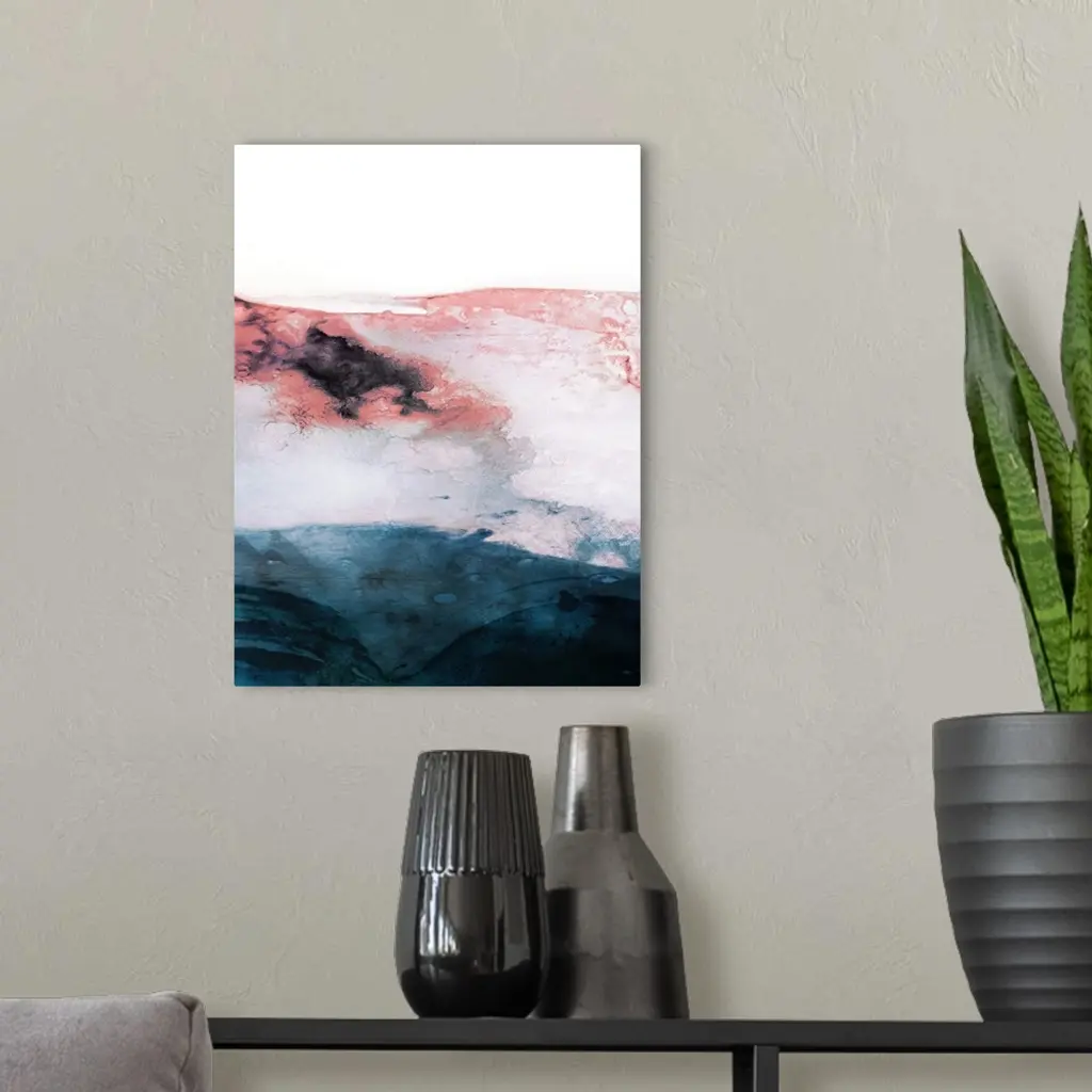 Watercolor abstract painting reminiscent of a landscape in shades of coral, pink, white and a dark teal blue