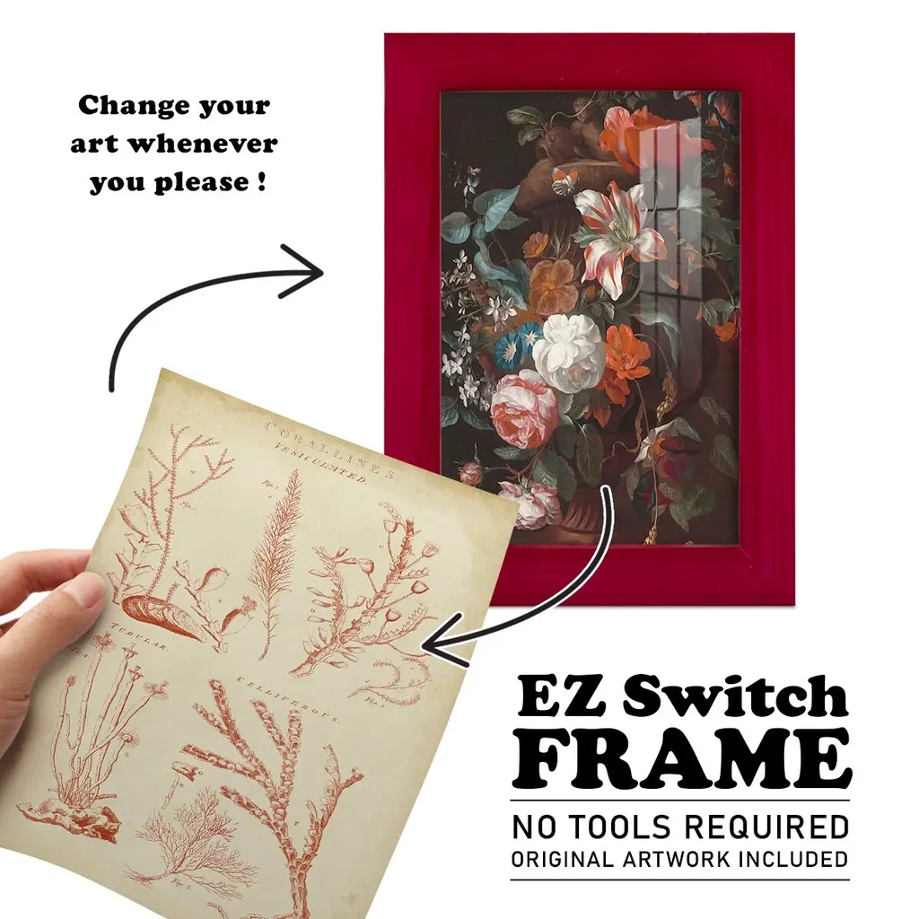 Coralline II -EZ SWITCH Framed Print w/glass-Cherry Red A delightful, framed print. Featuring a solid wood frame with real wood glass. This premium print is giclee quality. In addition, every frame features a removable back and table top stand. This allows you to change your art in the future or to just stand the art on a table for a new look. We are sure you'll enjoy our new series of EZ SWITCH Framed Art. Solid Wood Frame Real Glass Removable / Replaceable Art Built in Tabletop Stand Sizes range from 4x6 up to 12x15 - buy just one or pair them up as sets as you see fit.