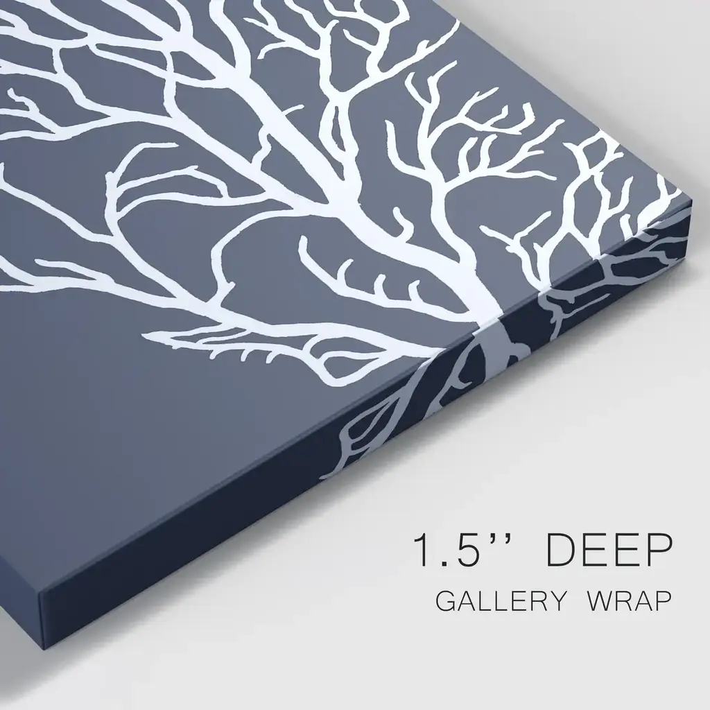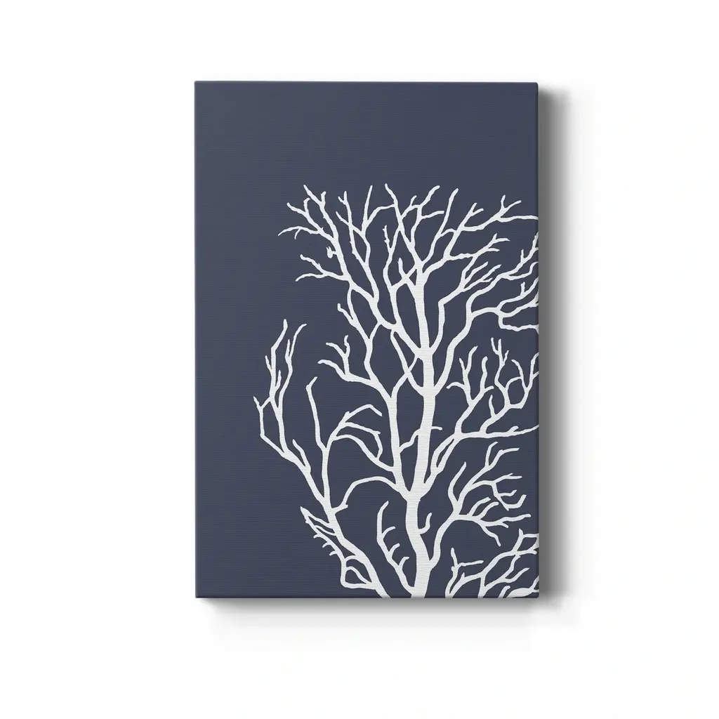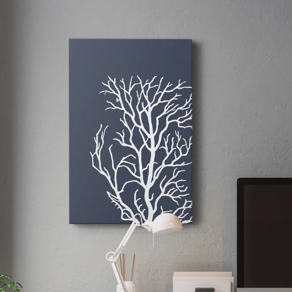 Corals White on Indigo Blue c Premium Gallery Wrapped Canvas - Ready to Hang A premium hand stretched gallery wrapped canvas print created to last. Featuring a beveled a solid wood stretcher bar, each piece comes ready to hand 6 SIZES AVAILABLE 8''X12'' - Overall Size 12''X18'' - Overall Size 18''X27'' - Overall Size 24''x36'' - Overall Size 32''x48'' - Overall Size 40''x60'' - Overall Size Each piece is made to order. Built to Last Each piece comes ready to hang Solid wood stretcher Fade and Water resistant Made domestically