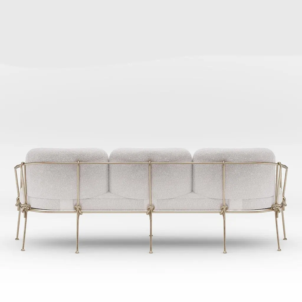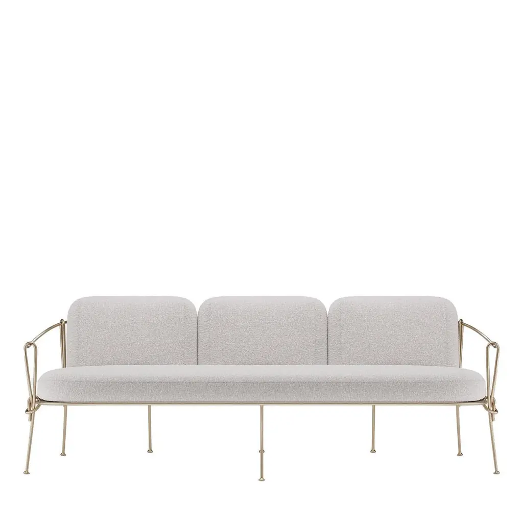 The Corda 3-Seater Outdoor Sofa by Zanellato&Bortotto elegantly combines sophisticated design with durability, making it an ideal addition to outdoor spaces. Crafted from forged iron, this robust piece features a stunning champagne finish achieved through hot zinc plating and painting, ensuring longevity and resistance to the elements. This outdoor sofa showcases a sleek and contemporary aesthetic, perfect for enhancing terraces, gardens, or patios. The inviting Snow fabric upholstery adds a touch of luxury, providing comfort without compromising style. Designed to accommodate three individuals, the Corda sofa offers ample seating while maintaining a streamlined silhouette. Its refined lines and graceful structure create an atmosphere of relaxed elegance, making it a centerpiece for alfresco gatherings.