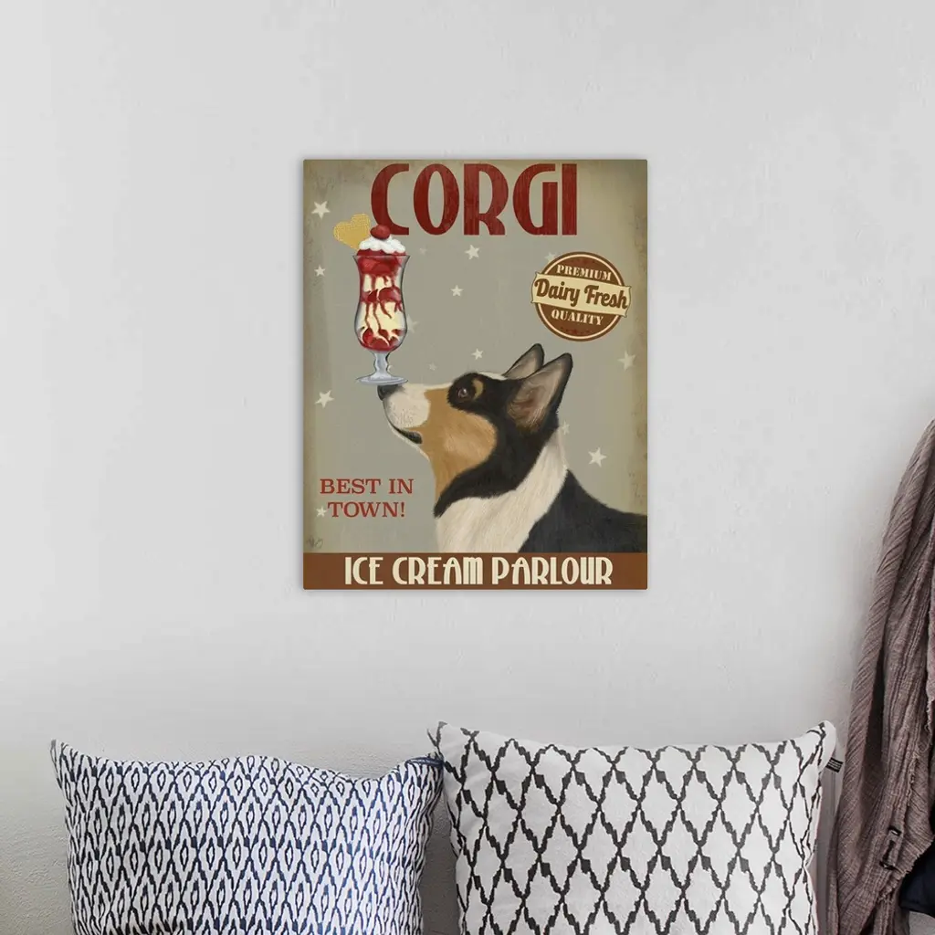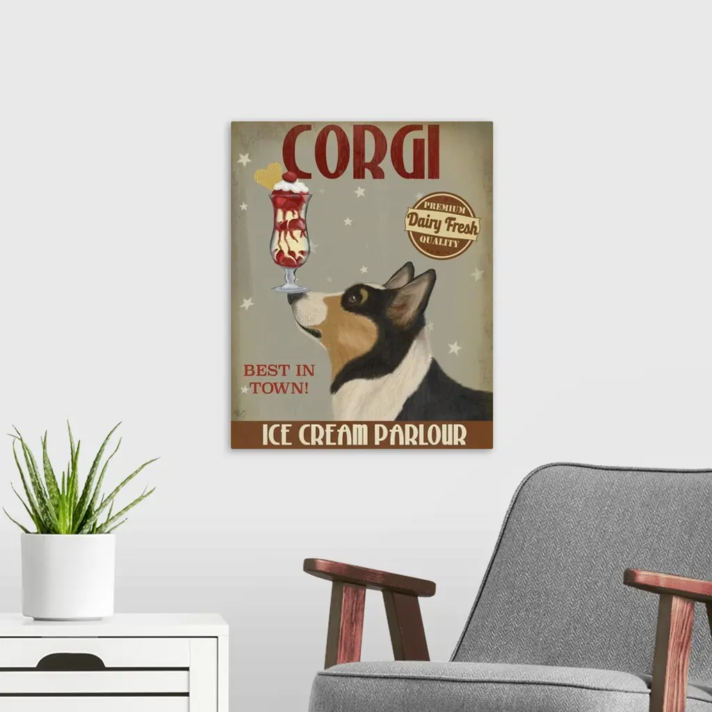 Decorative artwork of a Corgi balancing an ice cream sundae on its nose in an advertisement for an ice cream parlour.