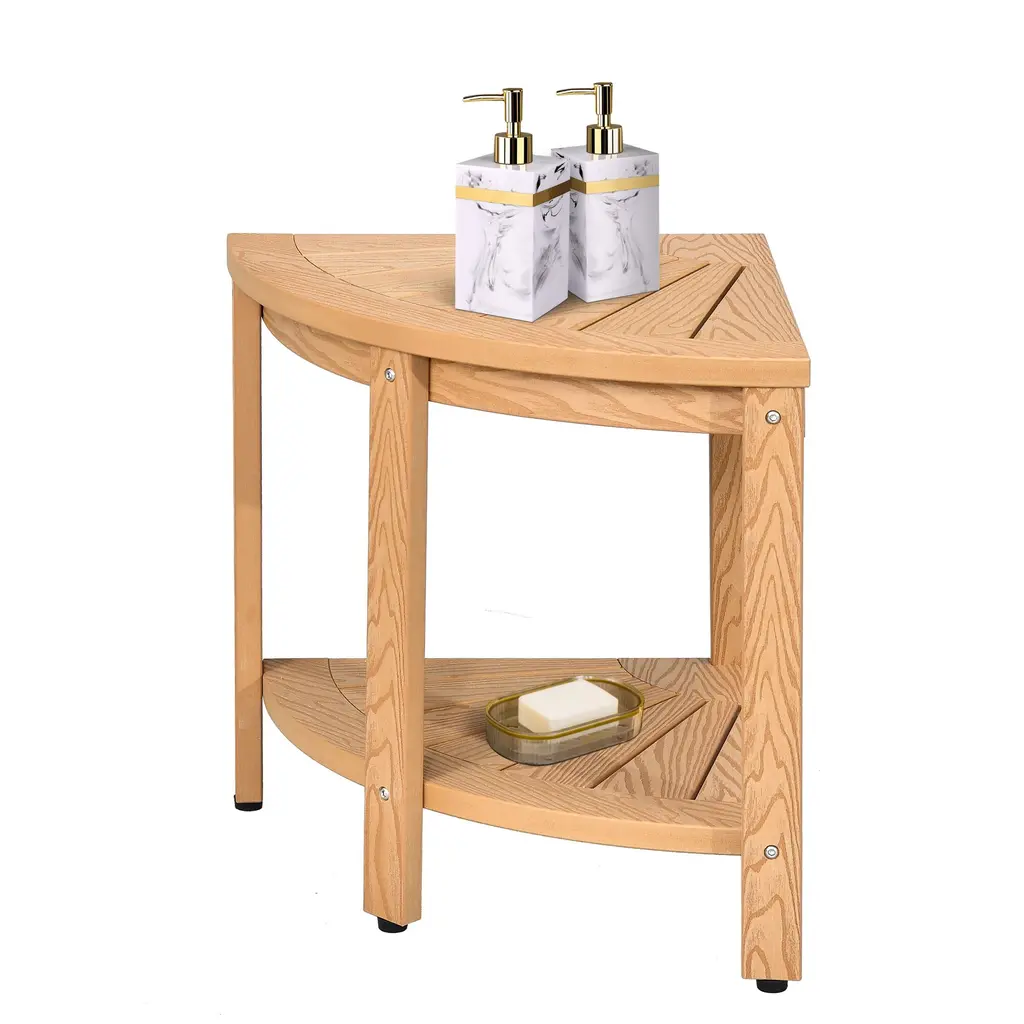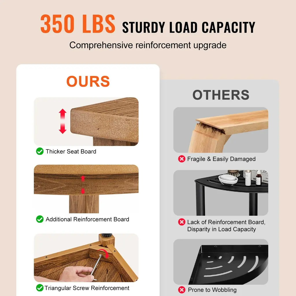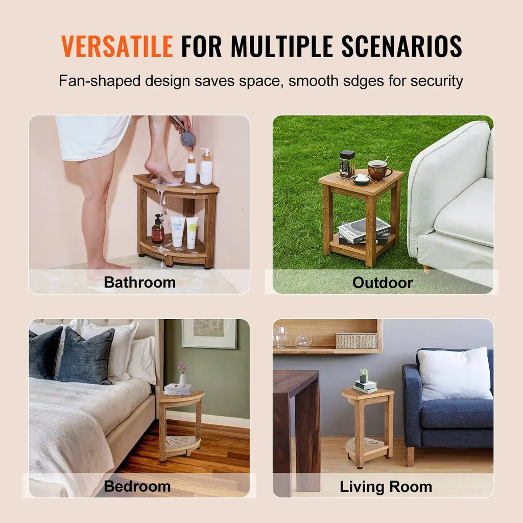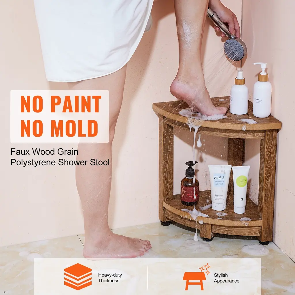 100% Teak Wood Material (for wood option): Constructed from 100% solid teak wood, treated with paint on both sides and the bottom surface. Ideal for use in where like showers. Waterproof Plastic Material (for plastic option): Crafted entirely from polystyrene material, perfect for use in where like showers. Requires no painting or maintenance, features an attractive faux wood grain design. 500LBS (Wood 18.5" Height option) / 300LBS (Wood 17" Height option)/ 350LBS (for Plastic option) Multiple Reinforcements: Thickened seat board and solid stool legs provide robust support, upgraded with reinforcement plates and bottom triangular screws to significantly enhance stability, minimizing wobbling even when used with a single foot support. Adjustable Anti-slip Foot Pads: Adjustable rubber foot pads at the bottom of the stool adapt to uneven surfaces. Stainless steel screws make it a longer lifespan. Enhanced gripping power of rubber foot pads prevents scratching on tile floors. Multiple Drainage Holes: Specially designed radial drainage holes on the seat board facilitate rapid water drainage and ventilation, preventing water accumulation even in shower use, ensuring quick drying and prolonging the durability of the shower stool. Versatile: Double-layered design increases storage space, suitable for storing towels, shower gel, and other items, serving as a footrest or storage stool for convenient foot care and showering. Fan-shaped design fits snugly against walls, making efficient use of corner space. Suitable for use in bathrooms, outdoors, bedrooms, living rooms, and more. Wood 18.5" Height Package Content 5+1 × Screw M6×60 5 × Nut M6 5 × Flat Washer 6 1 × Open-end Wrench 4+2 × Stainless Steel Rubber Foot 5+1 × Self-tapping Screw M4×30 1 × Seat Board 1 × Reinforcement Plate 1 × Storage Board 4 × Chair Leg 1 × Instruction Manual Wood 17" Height Package Content 6+1 × Screw M6×60 6 × Nut M6 6 × Flat Washer 1 × Open-end Wrench 4+2 × Stainless Steel Rubber Foot 1+1 × Self-tapping Screw M4×25 1 × Seat Board 1 × Storage Board 3 × Bench Leg 1 × Stool Leg 1 × Instruction Manual Plastic 18.5" Package Content 4+2 × Foot Pad M6×23 8+2 × Stainless Steel Screw M6×50 1 × L-shaped Allen Wrench 4 × Legs 1 × Seat Board 1 × Storage Board 1 × Instruction Manual Plastic 16.5" Height Package Content 4+2 × Foot Pads M6×23 6+2 × Stainless Steel Screws M6×55 1 × L-shaped Hex Wrench 3 × Legs 1 × Seat Board 1 × Storage Shelf 1 × Instruction Manual
