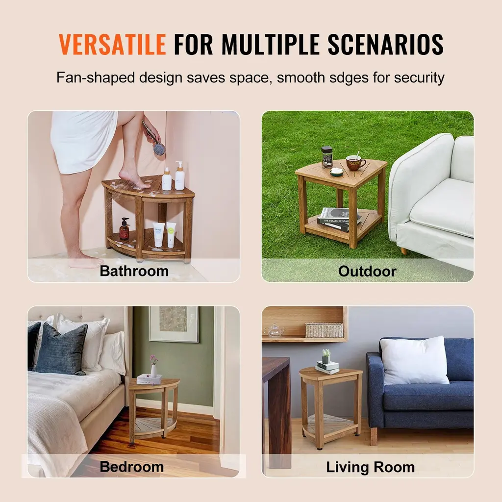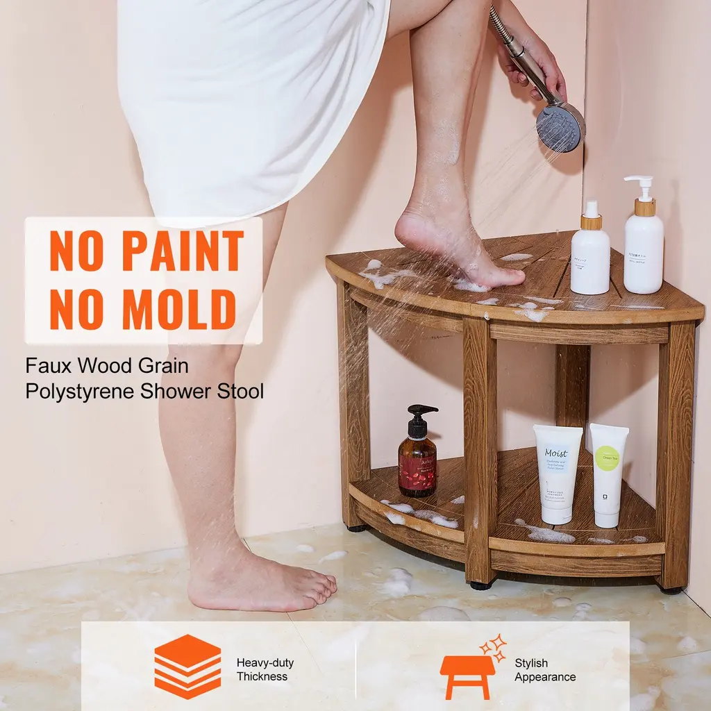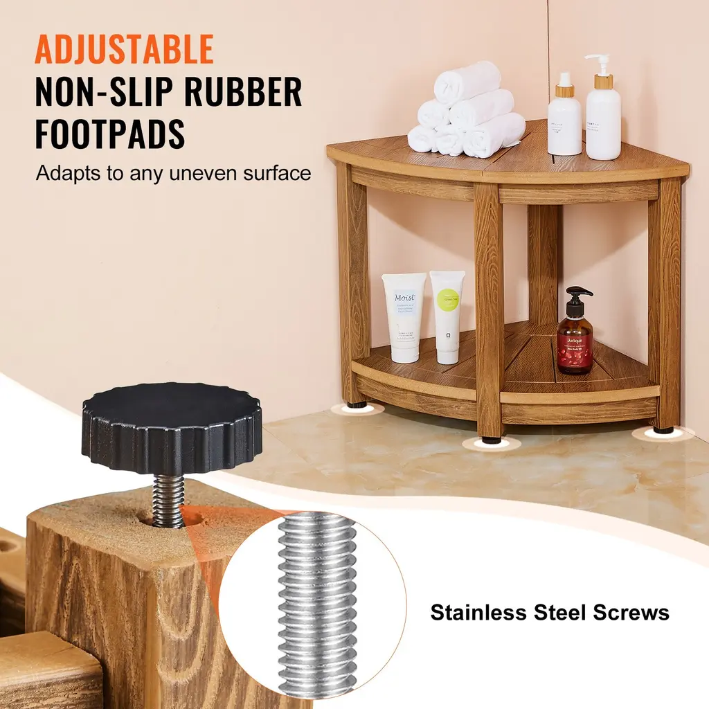 100% Teak Wood Material (for wood option): Constructed from 100% solid teak wood, treated with paint on both sides and the bottom surface. Ideal for use in where like showers. Waterproof Plastic Material (for plastic option): Crafted entirely from polystyrene material, perfect for use in where like showers. Requires no painting or maintenance, features an attractive faux wood grain design. 500LBS (Wood 18.5" Height option) / 300LBS (Wood 17" Height option)/ 350LBS (for Plastic option) Multiple Reinforcements: Thickened seat board and solid stool legs provide robust support, upgraded with reinforcement plates and bottom triangular screws to significantly enhance stability, minimizing wobbling even when used with a single foot support. Adjustable Anti-slip Foot Pads: Adjustable rubber foot pads at the bottom of the stool adapt to uneven surfaces. Stainless steel screws make it a longer lifespan. Enhanced gripping power of rubber foot pads prevents scratching on tile floors. Multiple Drainage Holes: Specially designed radial drainage holes on the seat board facilitate rapid water drainage and ventilation, preventing water accumulation even in shower use, ensuring quick drying and prolonging the durability of the shower stool. Versatile: Double-layered design increases storage space, suitable for storing towels, shower gel, and other items, serving as a footrest or storage stool for convenient foot care and showering. Fan-shaped design fits snugly against walls, making efficient use of corner space. Suitable for use in bathrooms, outdoors, bedrooms, living rooms, and more. Wood 18.5" Height Package Content 5+1 × Screw M6×60 5 × Nut M6 5 × Flat Washer 6 1 × Open-end Wrench 4+2 × Stainless Steel Rubber Foot 5+1 × Self-tapping Screw M4×30 1 × Seat Board 1 × Reinforcement Plate 1 × Storage Board 4 × Chair Leg 1 × Instruction Manual Wood 17" Height Package Content 6+1 × Screw M6×60 6 × Nut M6 6 × Flat Washer 1 × Open-end Wrench 4+2 × Stainless Steel Rubber Foot 1+1 × Self-tapping Screw M4×25 1 × Seat Board 1 × Storage Board 3 × Bench Leg 1 × Stool Leg 1 × Instruction Manual Plastic 18.5" Package Content 4+2 × Foot Pad M6×23 8+2 × Stainless Steel Screw M6×50 1 × L-shaped Allen Wrench 4 × Legs 1 × Seat Board 1 × Storage Board 1 × Instruction Manual Plastic 16.5" Height Package Content 4+2 × Foot Pads M6×23 6+2 × Stainless Steel Screws M6×55 1 × L-shaped Hex Wrench 3 × Legs 1 × Seat Board 1 × Storage Shelf 1 × Instruction Manual