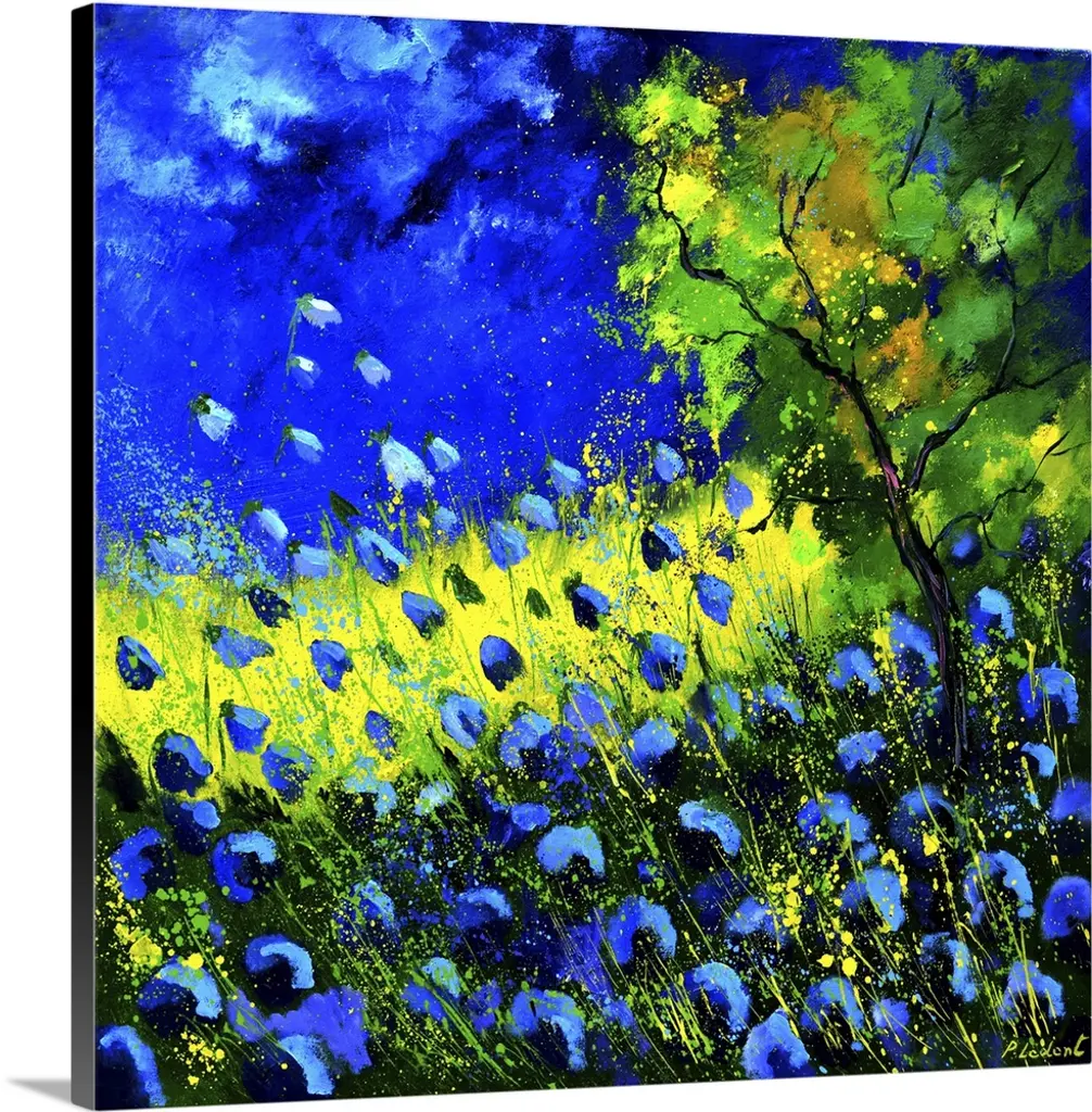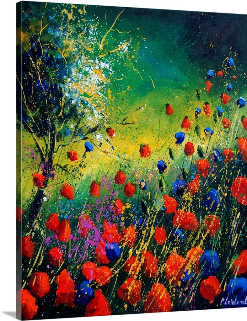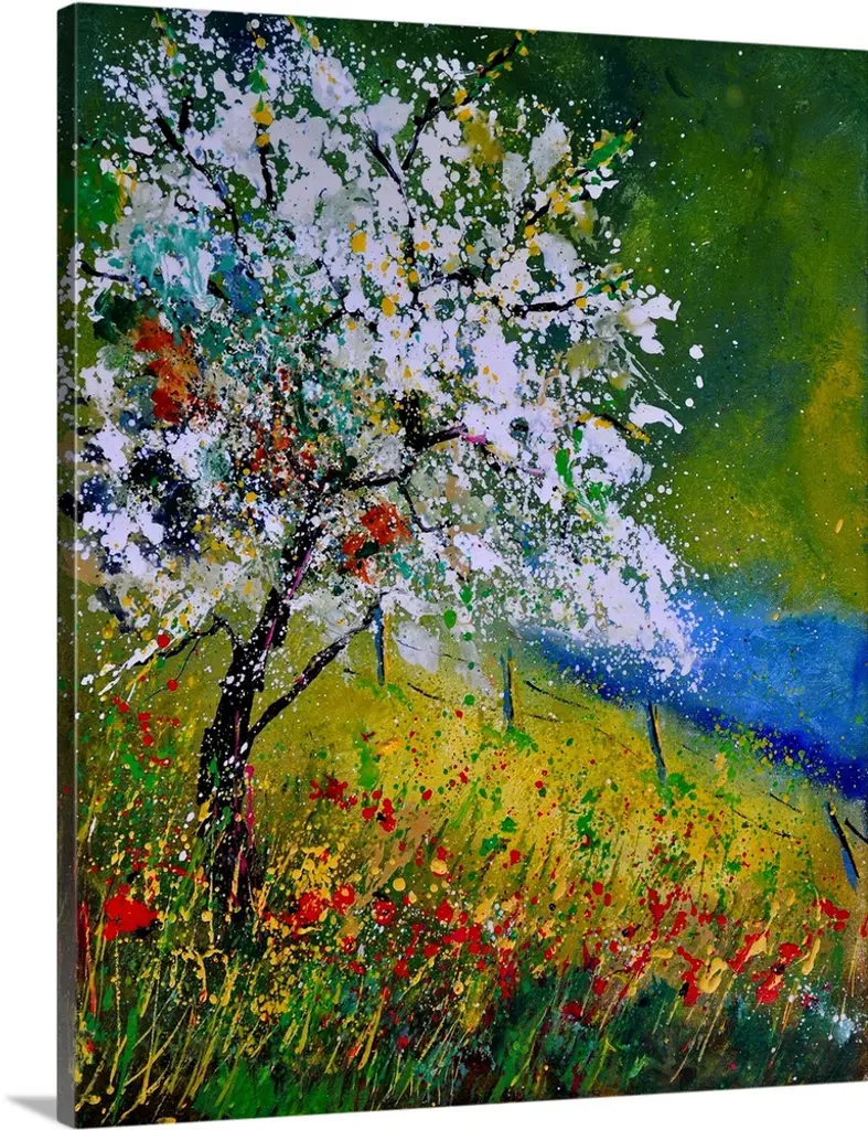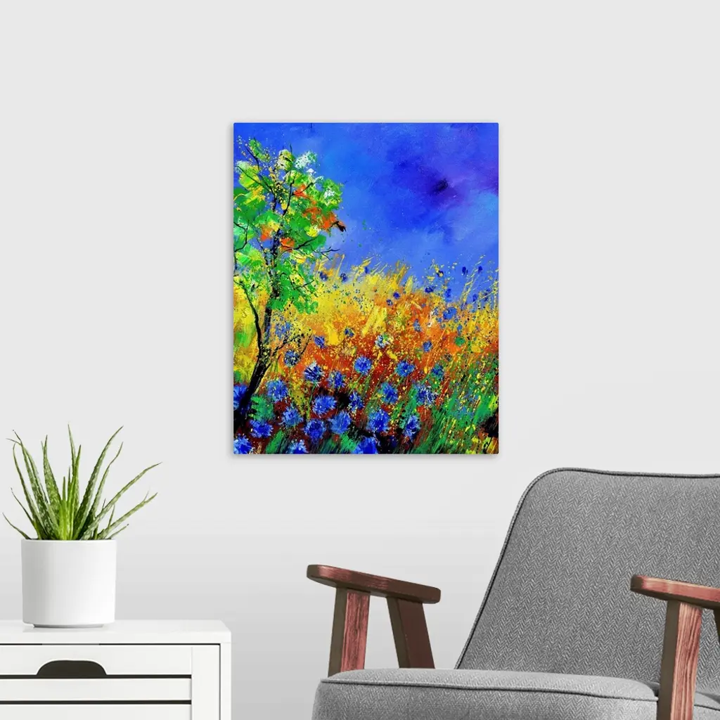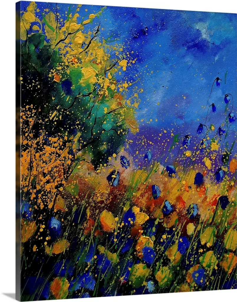Vertical painting of colorful flowers in a garden and a bright blue sky with small speckles of paint overlapping.