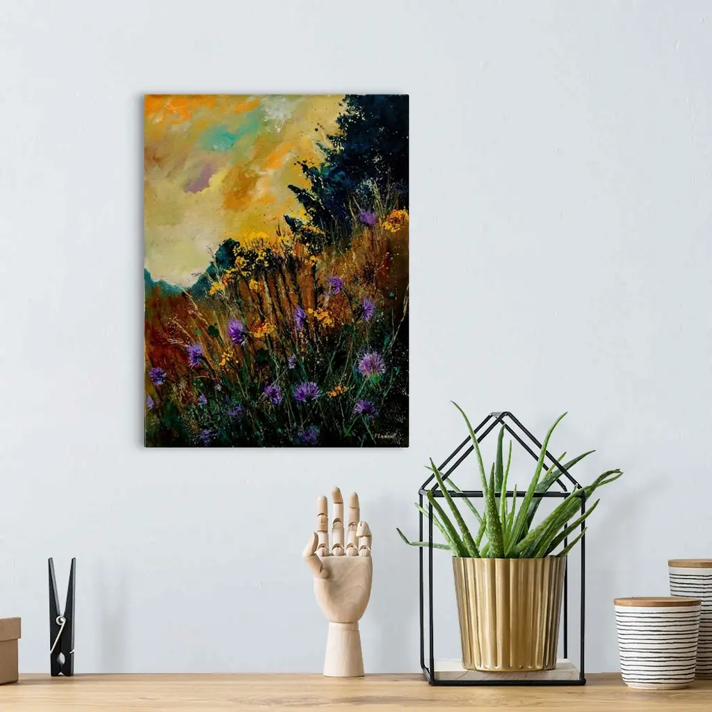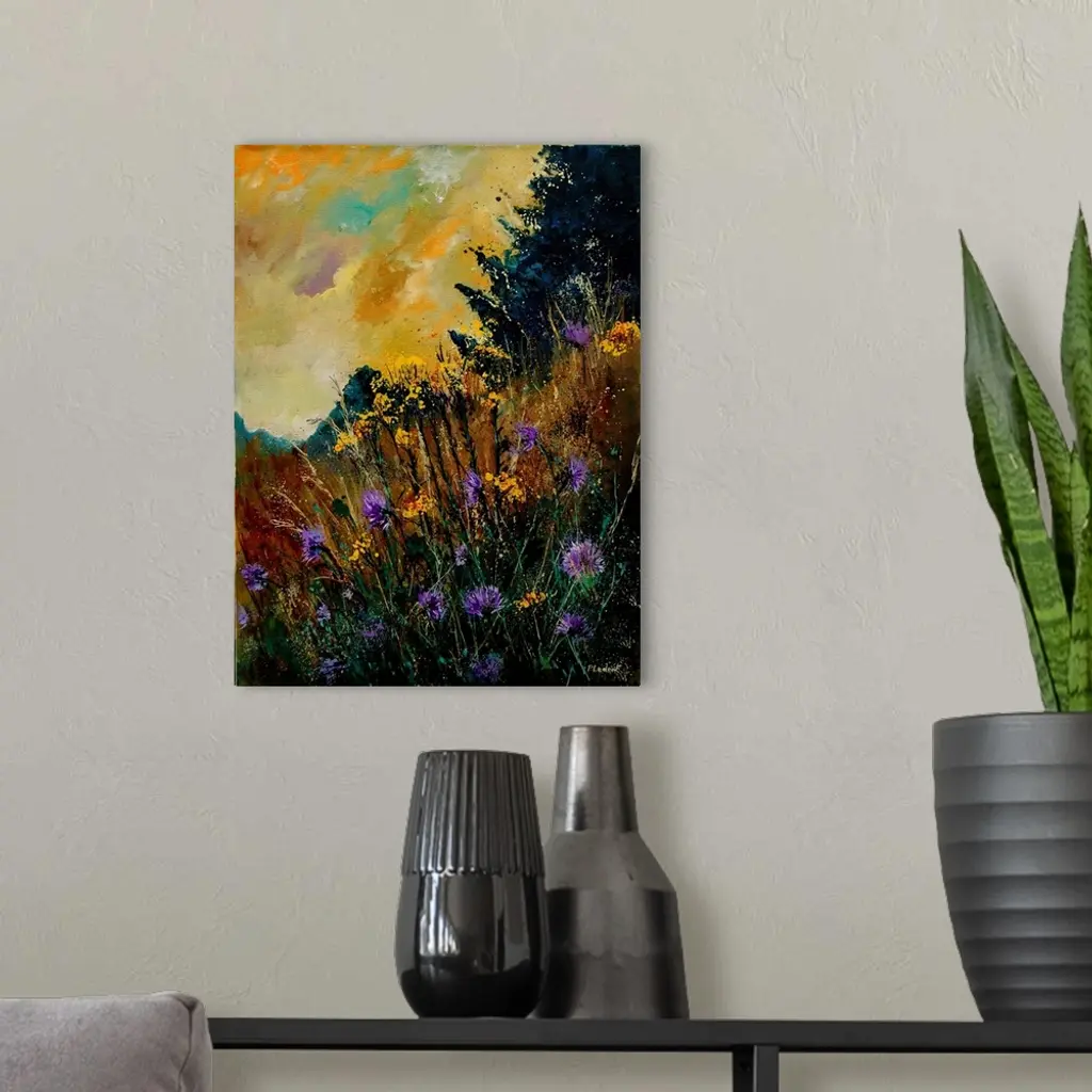 Contemporary painting of a field of purple cornflowers aligned with trees with a vibrant yellow sky.