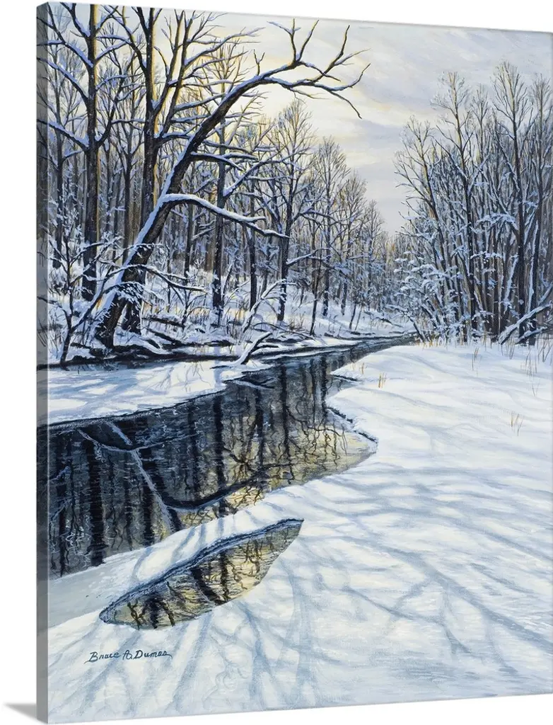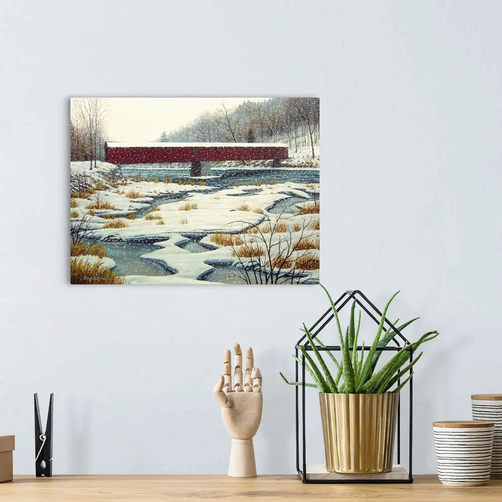 Contemporary artwork of a covered bridge over a stream in winter time.