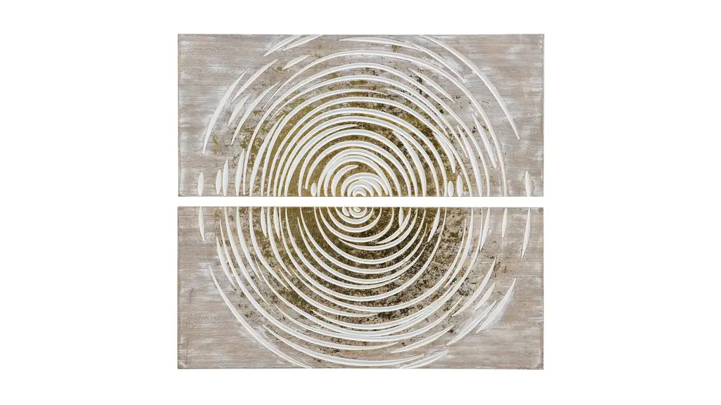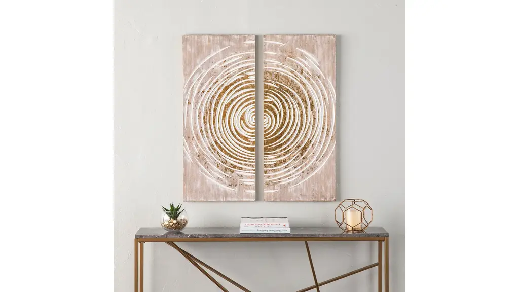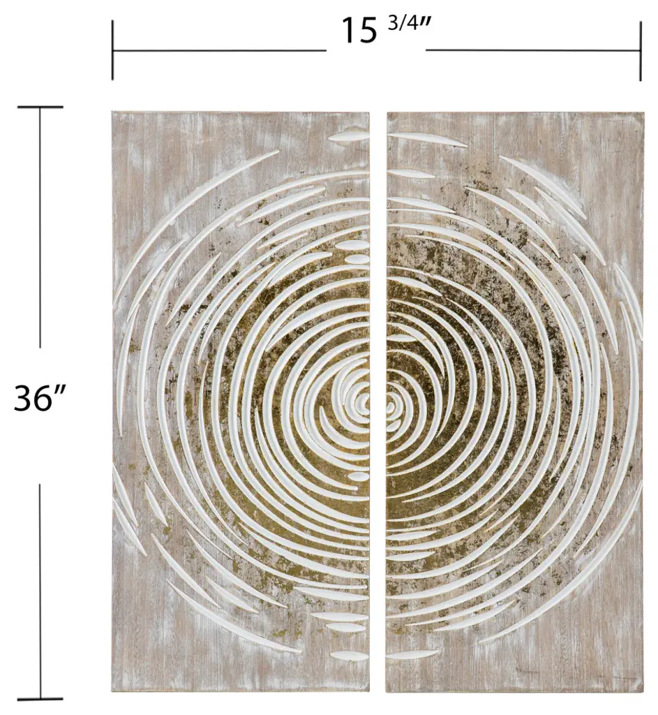 Transform your wall space with the Corsham 2-pc. Wall Panel Set. White paint highlights the carved, circular pattern, while gold foil accents add a bold pop of color. Separate panels to create a cohesive look throughout your open concept living space or hang together as an oversized accent piece in your entryway. Bring an organic feel to your home when you hang this wall d_cor set in your living room or dining room.