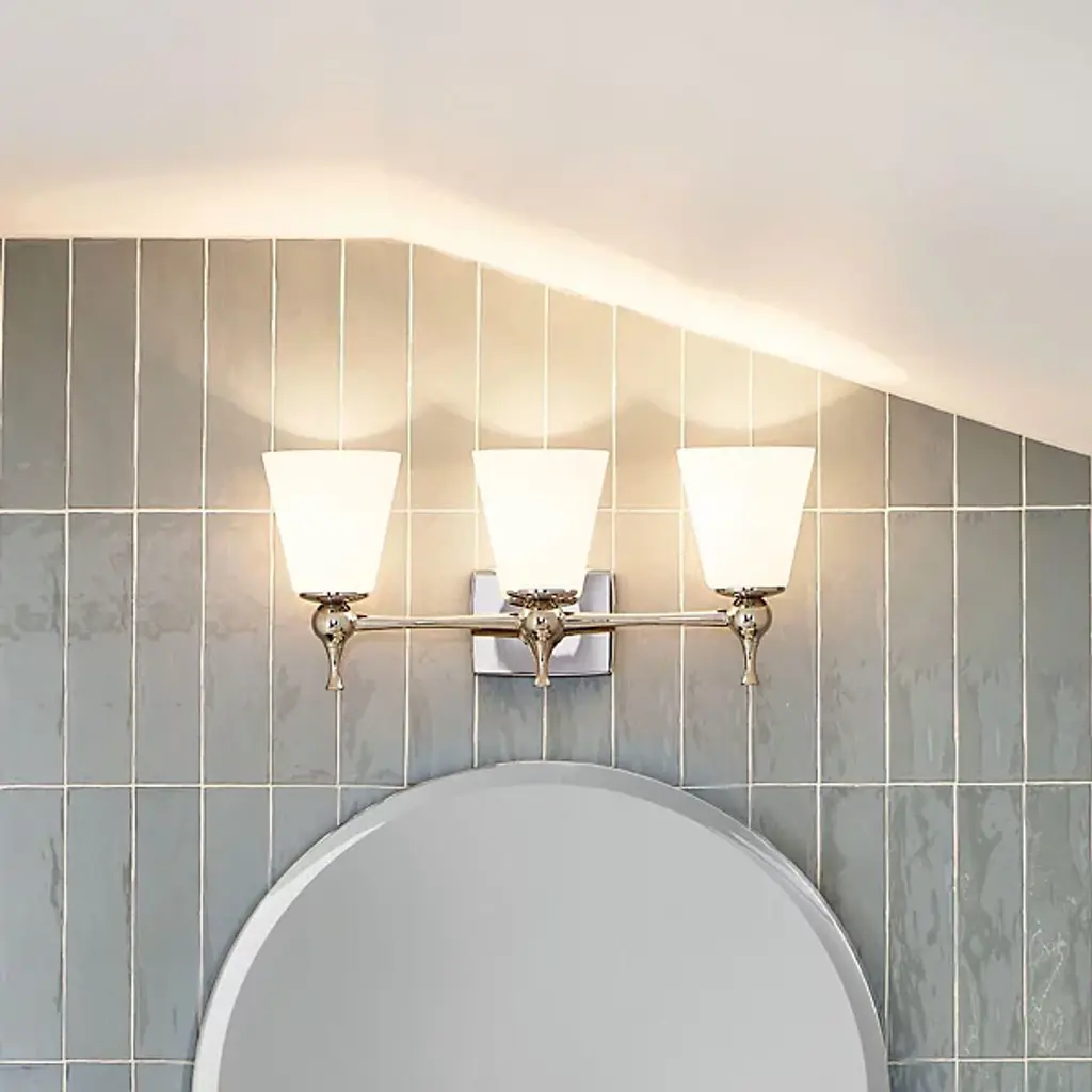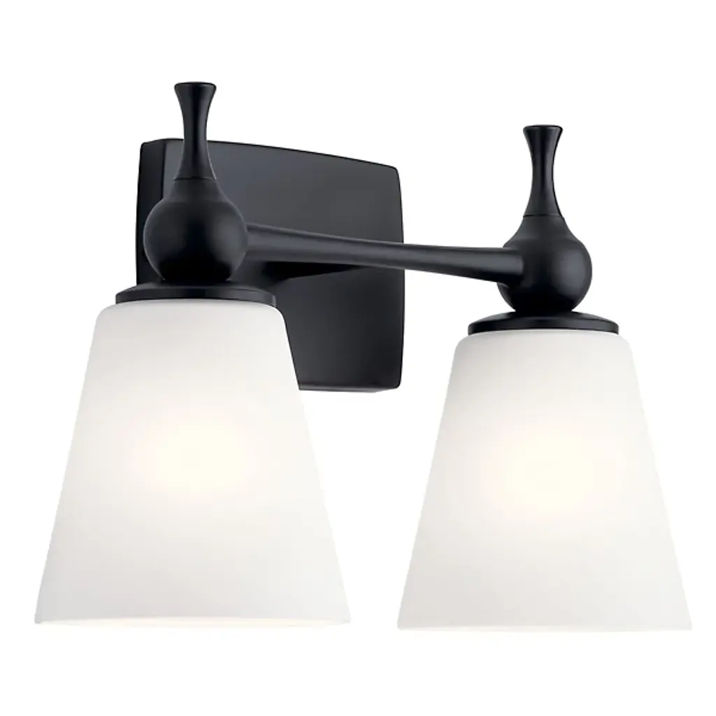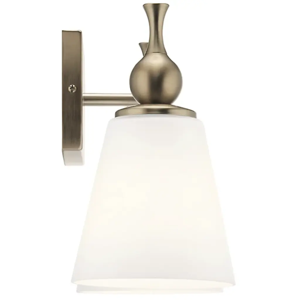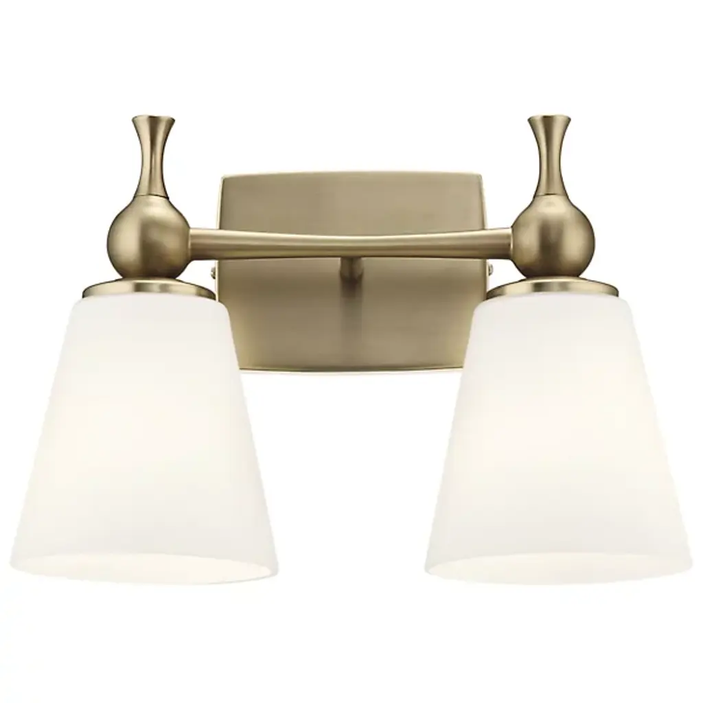 Bring a stylish appeal to your bathroom spaces with the smooth and elegant lines of the Cosabella Vanity Light from Kichler. A refined blend of stylistic elements able to work well with décor ranging from contemporary or mid-century design, it’s ideal when emplaced over a bathroom mirror to illuminate it, relying on a rounded backplate in matte metal to secure a tapered crossbar that extends a lamp from each end. The fixture can be installed in either an up or downward orientation, while its damp-listed lamping is gentled by flared shades of etched opal glass that mellow bright glare into a warm glow. The Champagne Bronze finish offers a warm, muted brushed gold style and pairs beautifully with coordinating Delta® plumbing fixtures by Delta Faucet.