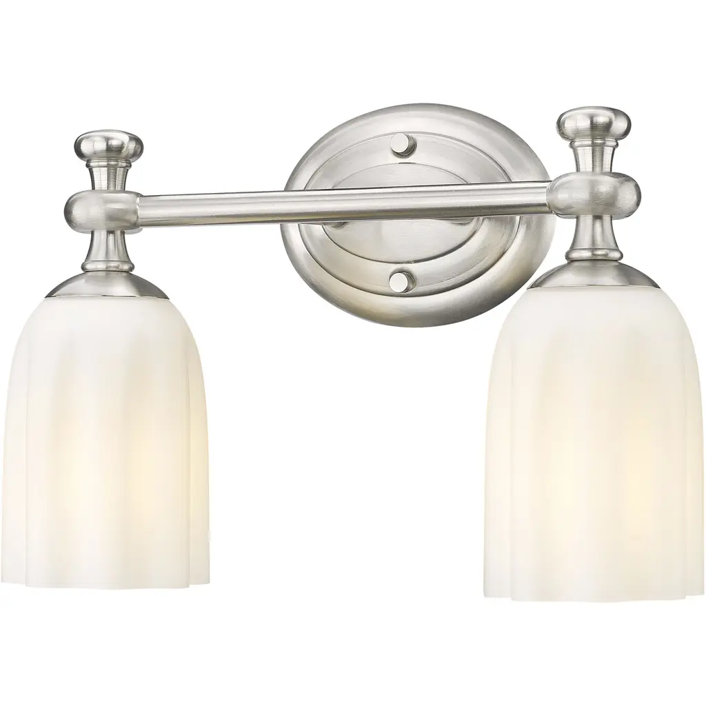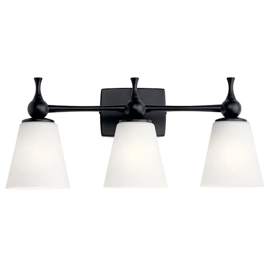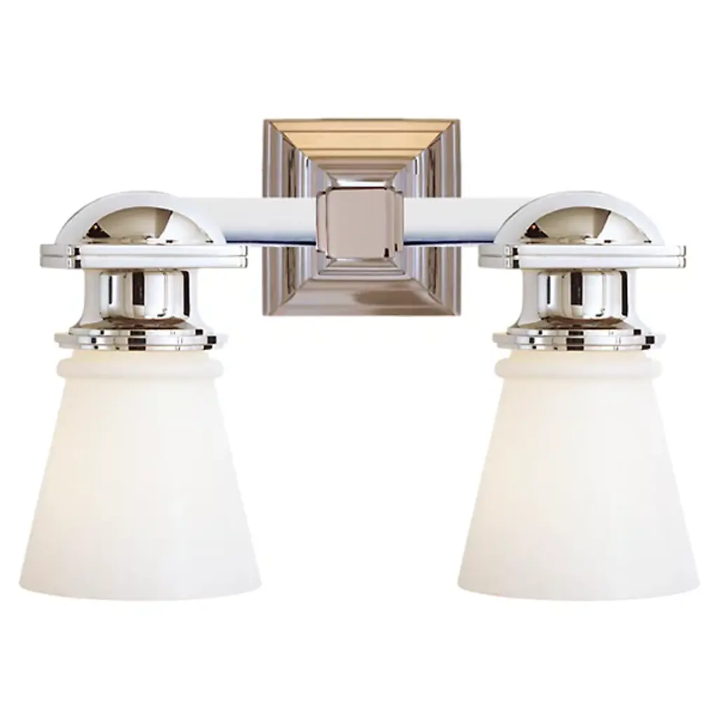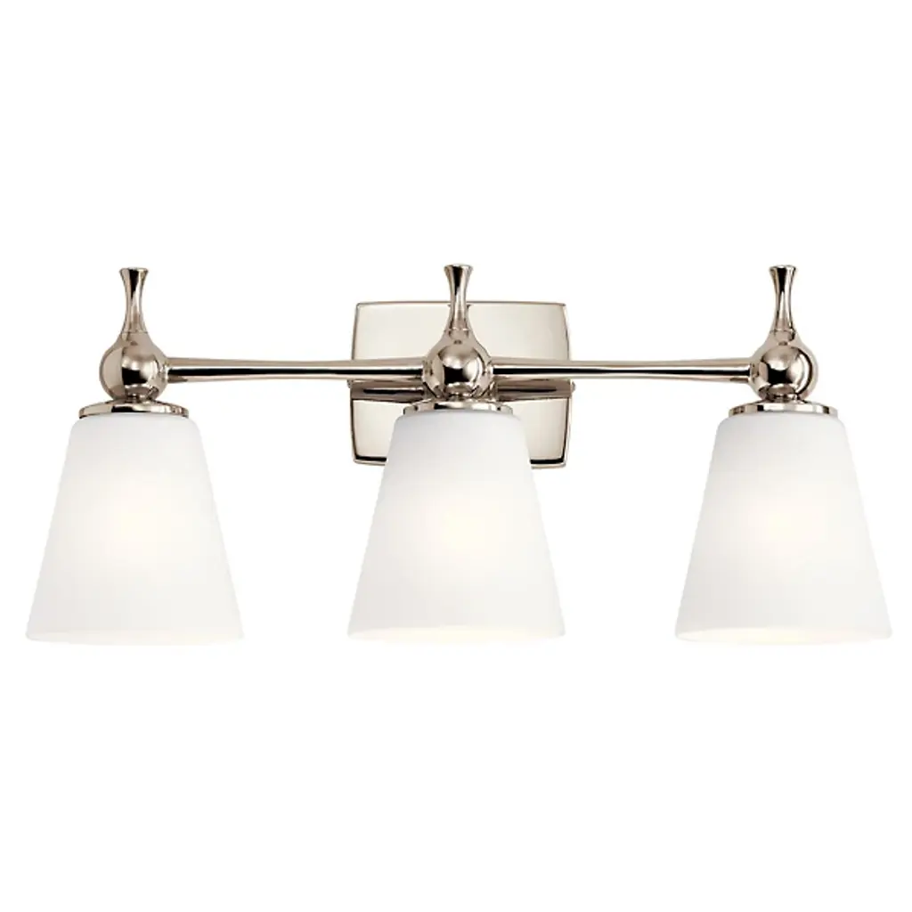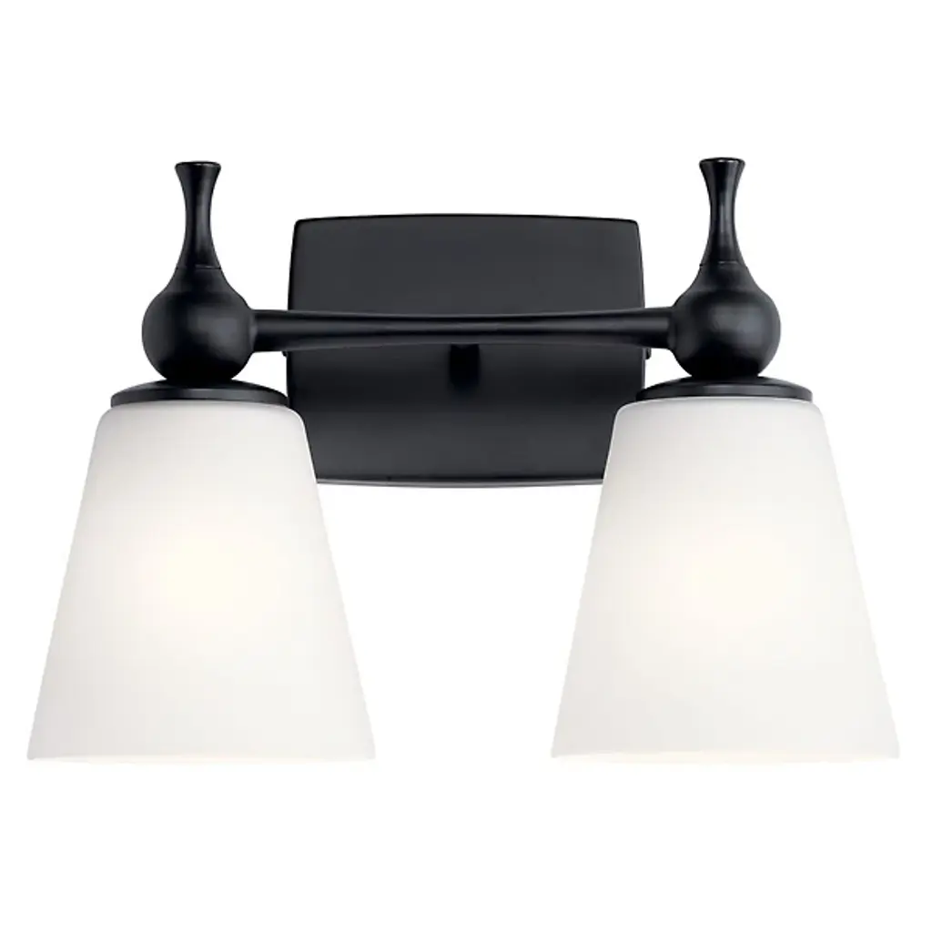 Bring a stylish appeal to your bathroom spaces with the smooth and elegant lines of the Cosabella Vanity Light from Kichler. A refined blend of stylistic elements able to work well with décor ranging from contemporary or mid-century design, it’s ideal when emplaced over a bathroom mirror to illuminate it, relying on a rounded backplate in matte metal to secure a tapered crossbar that extends a lamp from each end. The fixture can be installed in either an up or downward orientation, while its damp-listed lamping is gentled by flared shades of etched opal glass that mellow bright glare into a warm glow. The Champagne Bronze finish offers a warm, muted brushed gold style and pairs beautifully with coordinating Delta® plumbing fixtures by Delta Faucet.