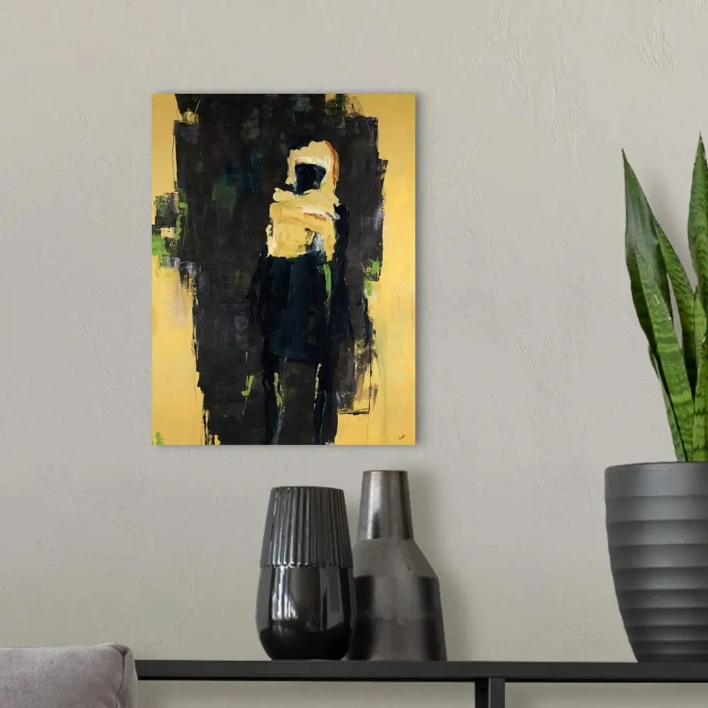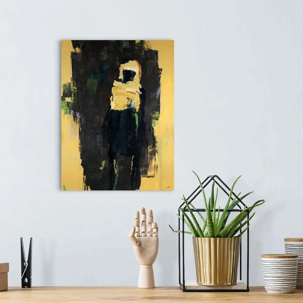 Abstract painting of a cosmic figure stepping out of a black mass of thickly painted brushstrokes, on a golden background.