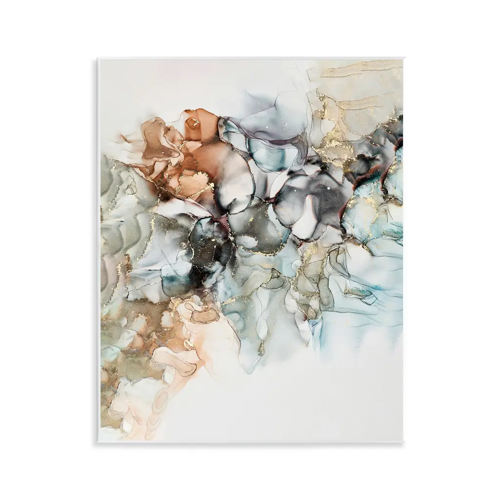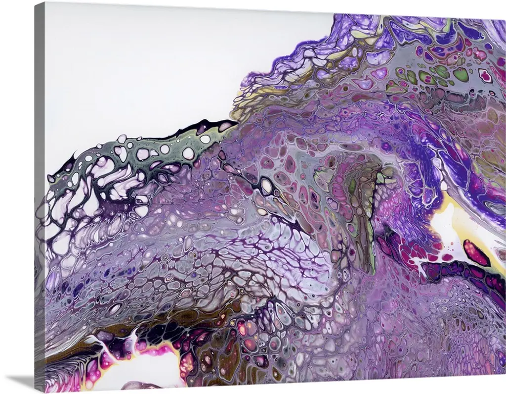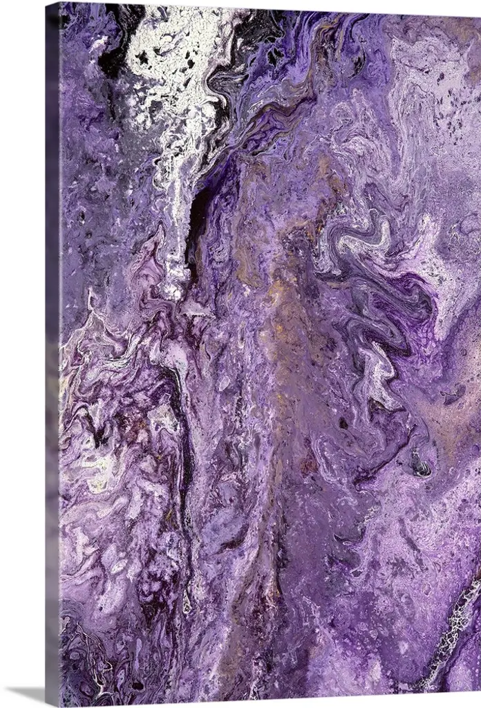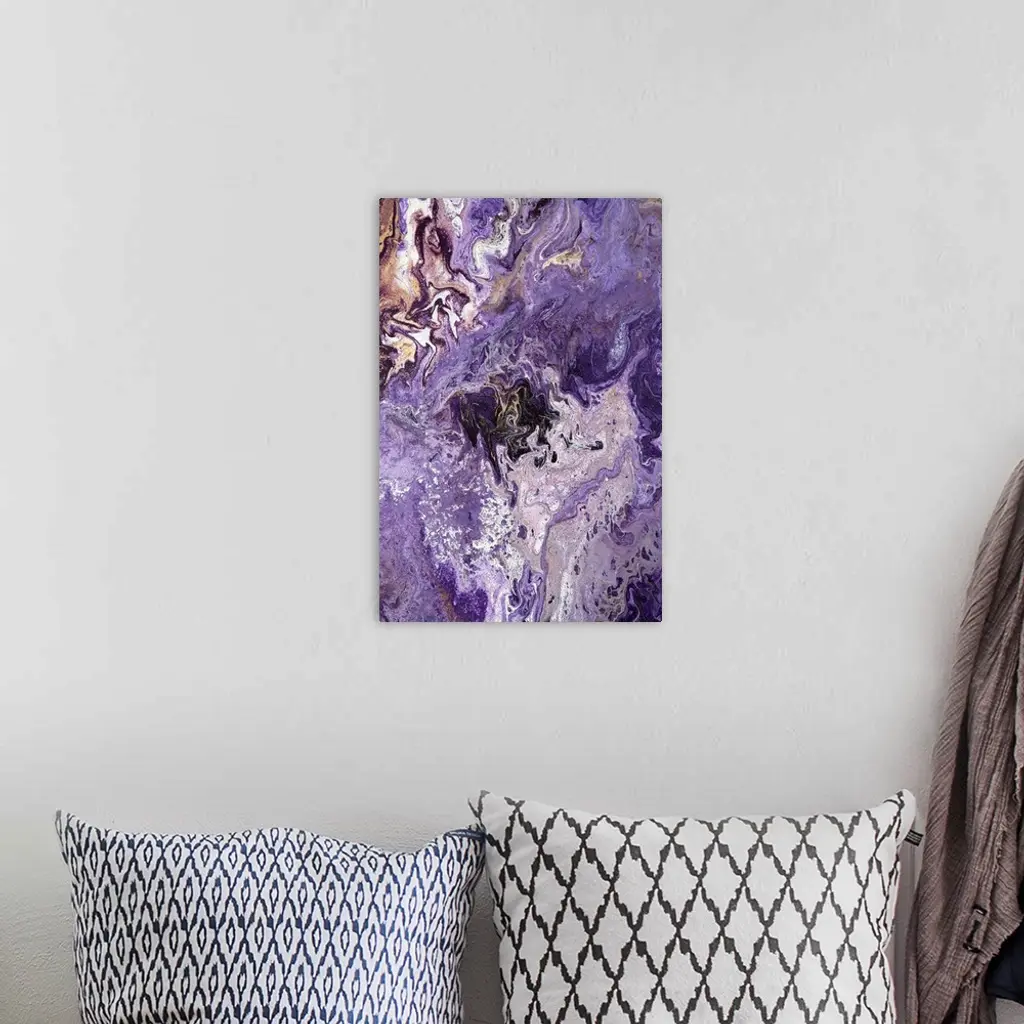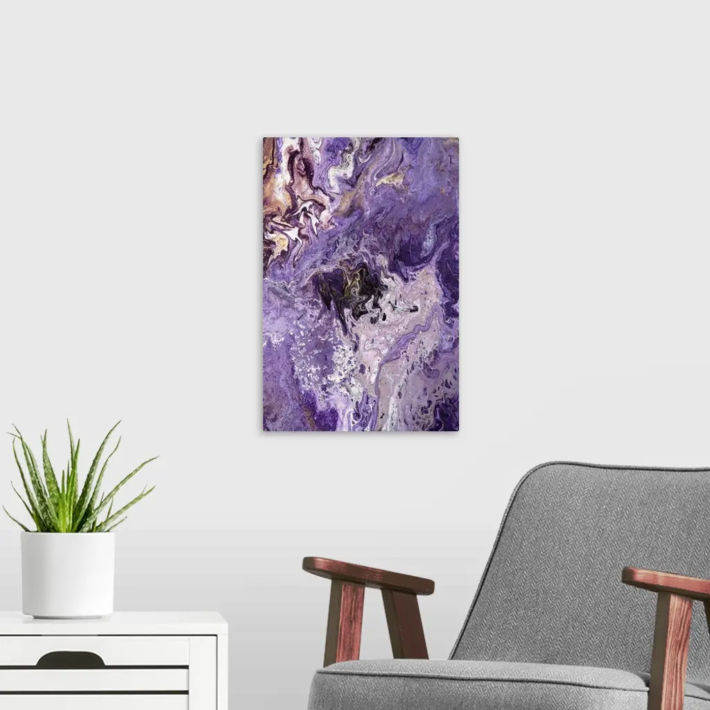 Abstract contemporary painting in brown, white and purple tones, in a marbling effect.
