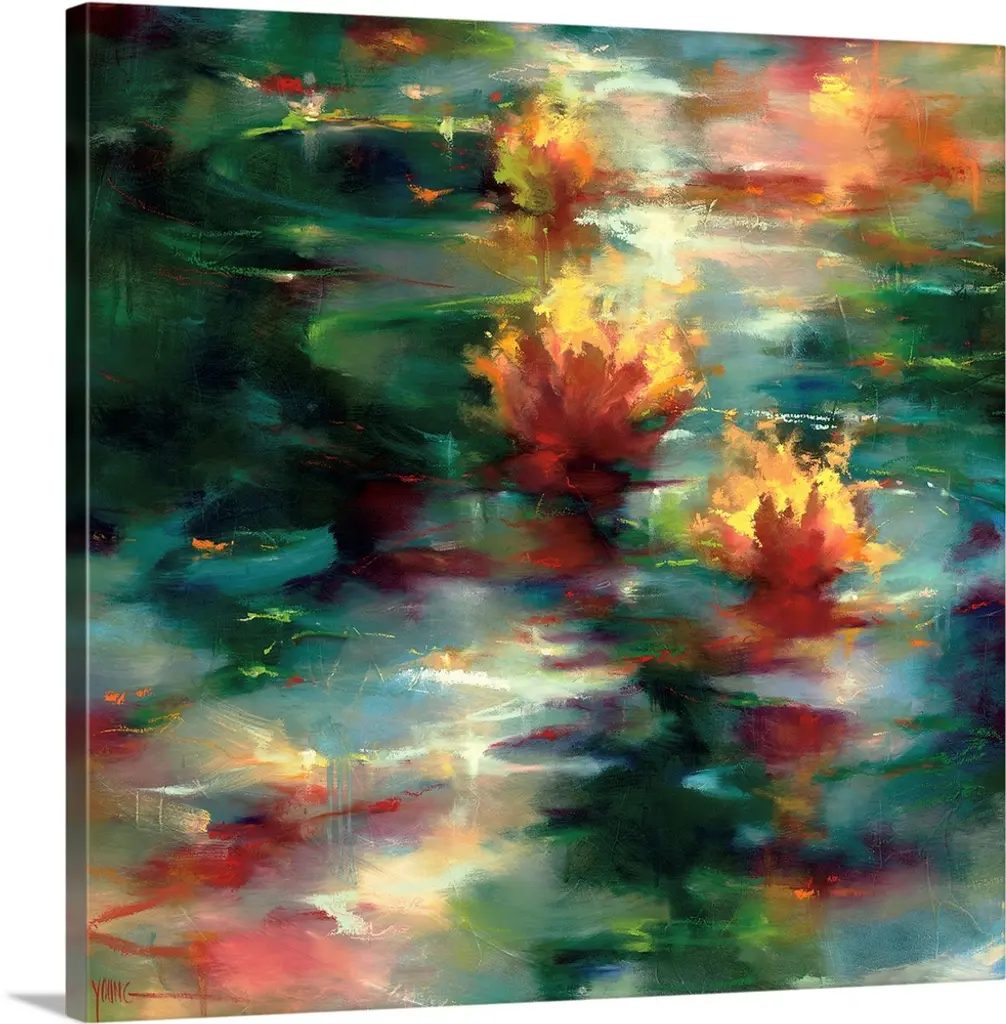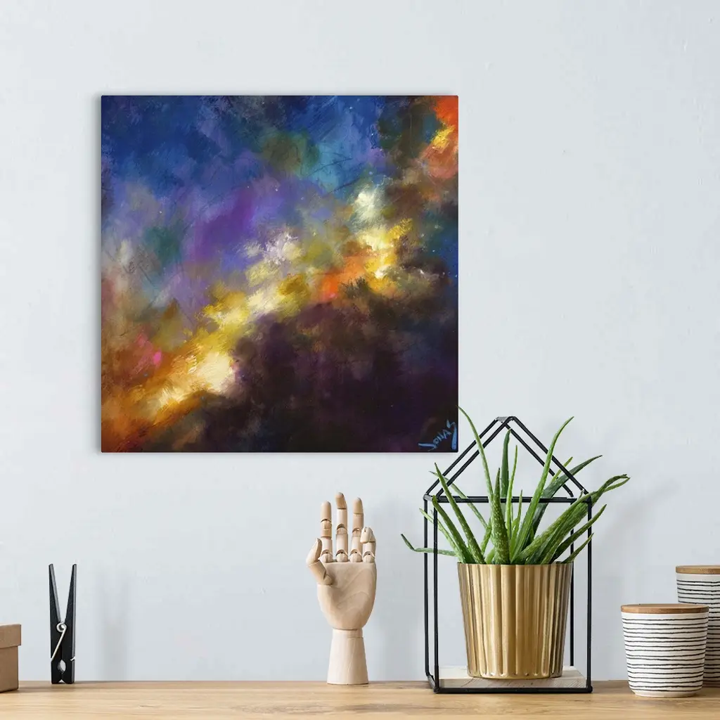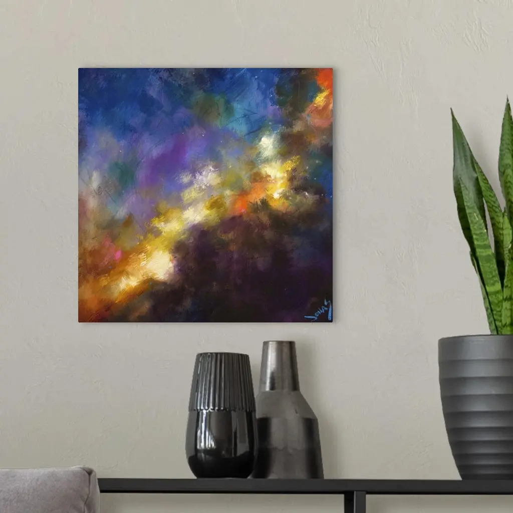 Contemporary abstract painting using wild and vivid colors resembling a nebulae.
