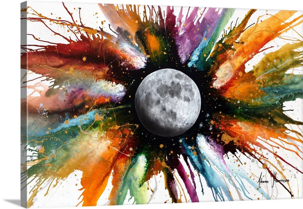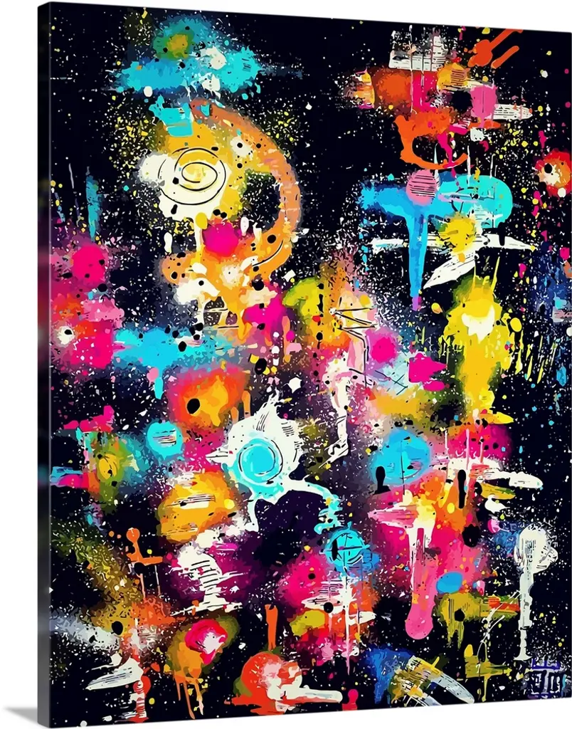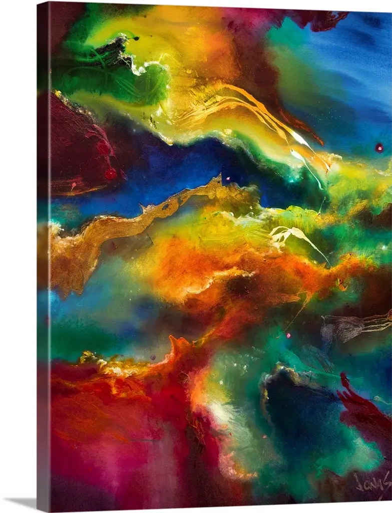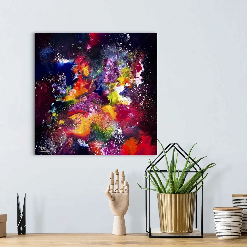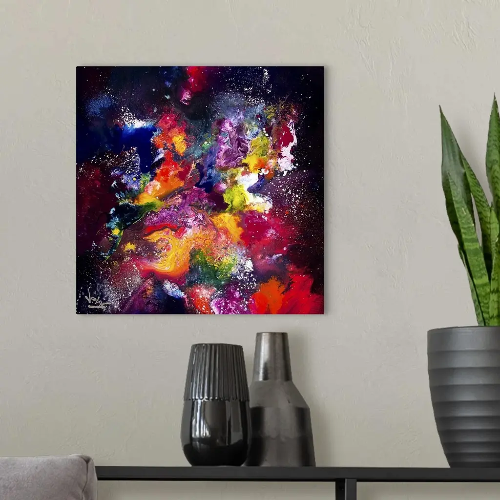 Contemporary abstract painting using a spectrum of color and spattered paint resembling a cosmic nebula.