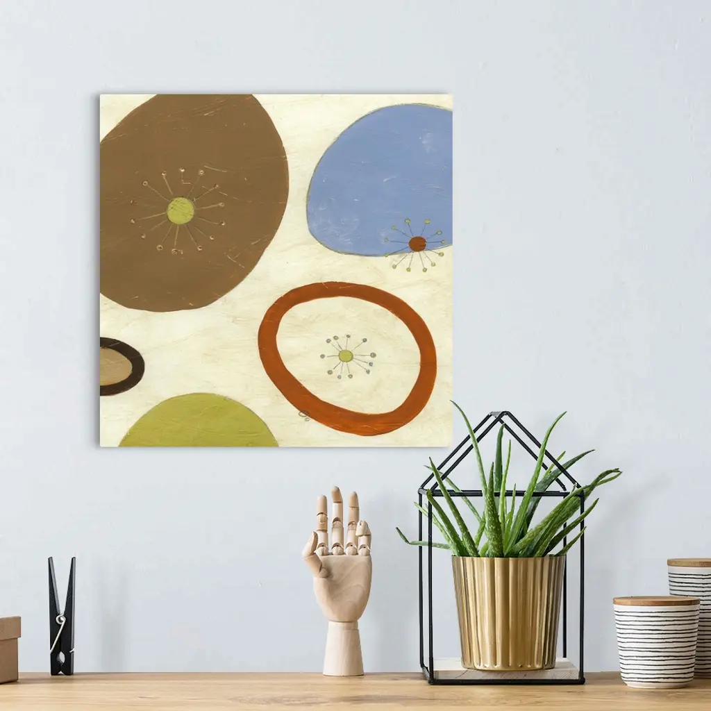 Contemporary retro inspired abstract painting of organic shapes against a cream toned background.