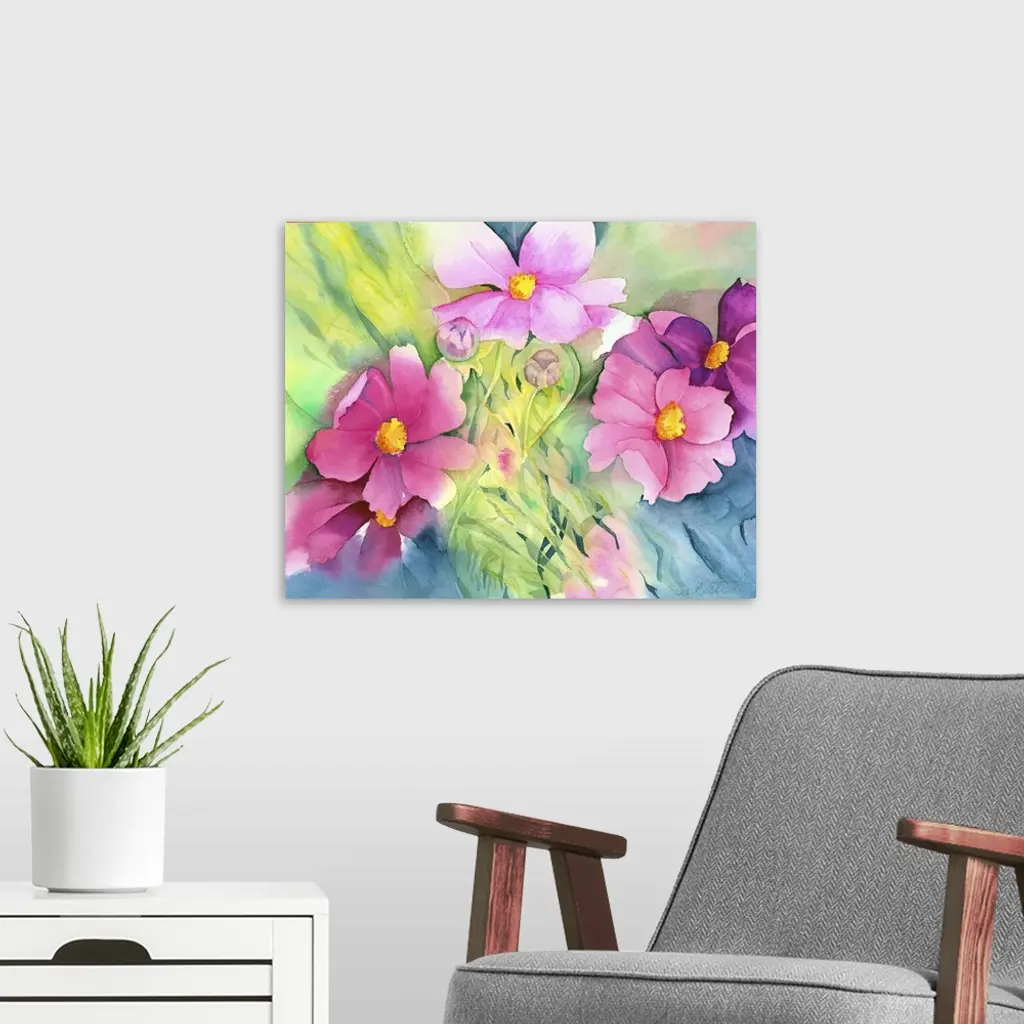 Contemporary watercolor painting of brightly colored flowers.