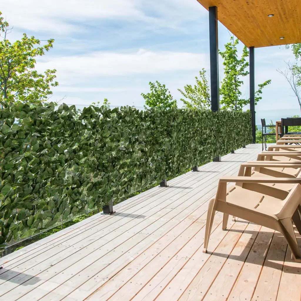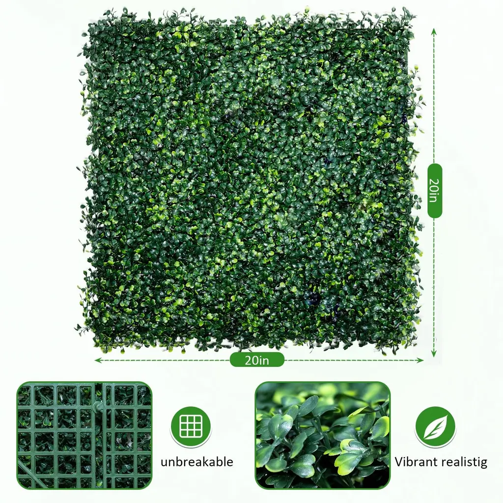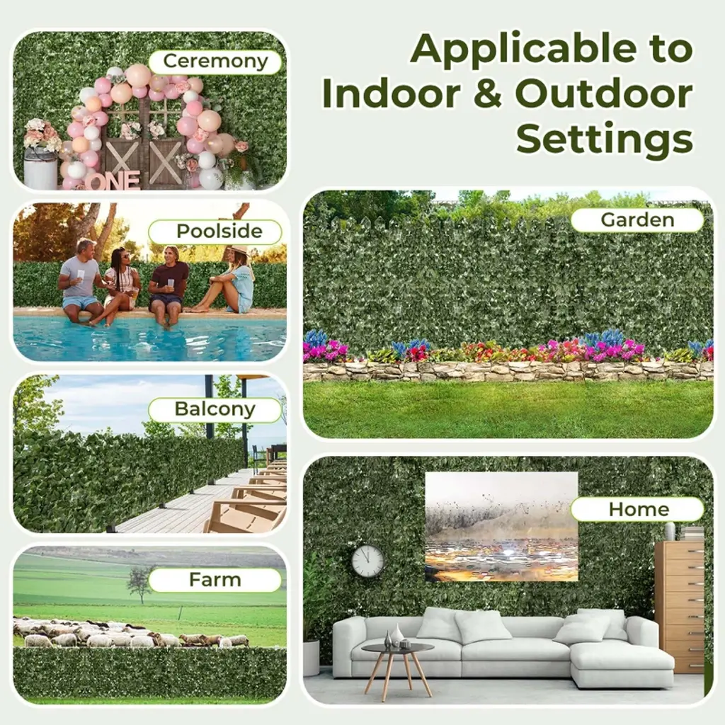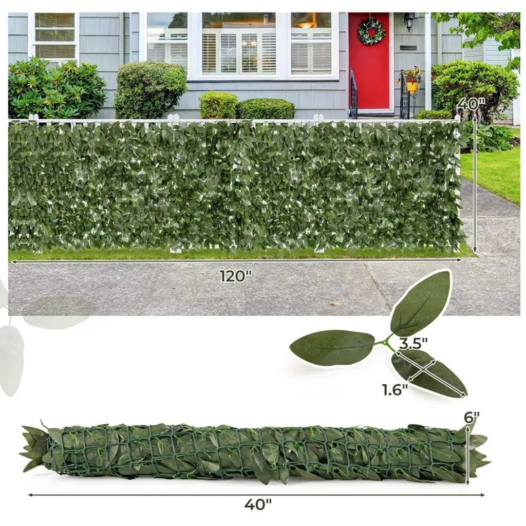 Brighten up any space with the artificial plant fence! Our premium privacy fence doubles as a decorative backdrop, offering both functionality and style in one package. The privacy fence features premium polyester fabric that is non-fading and long-lasting. The 2 pack green wall backdrop features 2 ways to secure. Securing the artificial plant wall roll is a breeze thanks to the included zip ties. For indoor wall decoration, nails can be used to anchor the fence(not included). Whether you're setting up for a special event or simply enhance the privacy for garden and backyard, the faux leaf covering wall decoration offers perfect solution. The dense lily/ivy leaves, complete with a simulated texture, bring life and vitality to any space without the need for maintenance. Moreover, the artificial ivy/plant privacy fence features rolling design, allows for compact storage for next use!FeaturesDouble as a privacy fence and a decorative backdrop Premium polyester fabric is non-fading and long-lasting Easy to secure with included zip ties or use nails(not provided) to anchor Dense lily/ivy leafs with simulated texture brings vitality to your space Foldable design make the faux leaf hedge easy to transport and store No pruning, watering and sunlight required for all year vibrancy Applicable to indoor & outdoor settings, including ceremony, garden , homeColor: Dark Green Material: Polyester Fabric Each Panel Product Dimensions: 120" x 40"(L x W) Rolling Size: 40" x 6"(L x Dia.) Each Leaf Size: 3.5" x 1.6"(L x W) Net Weight: 7.5 lbs Package Includes: 2 x Artificial Privacy Fence 20 x Zip Tie 1 x User’s Manual