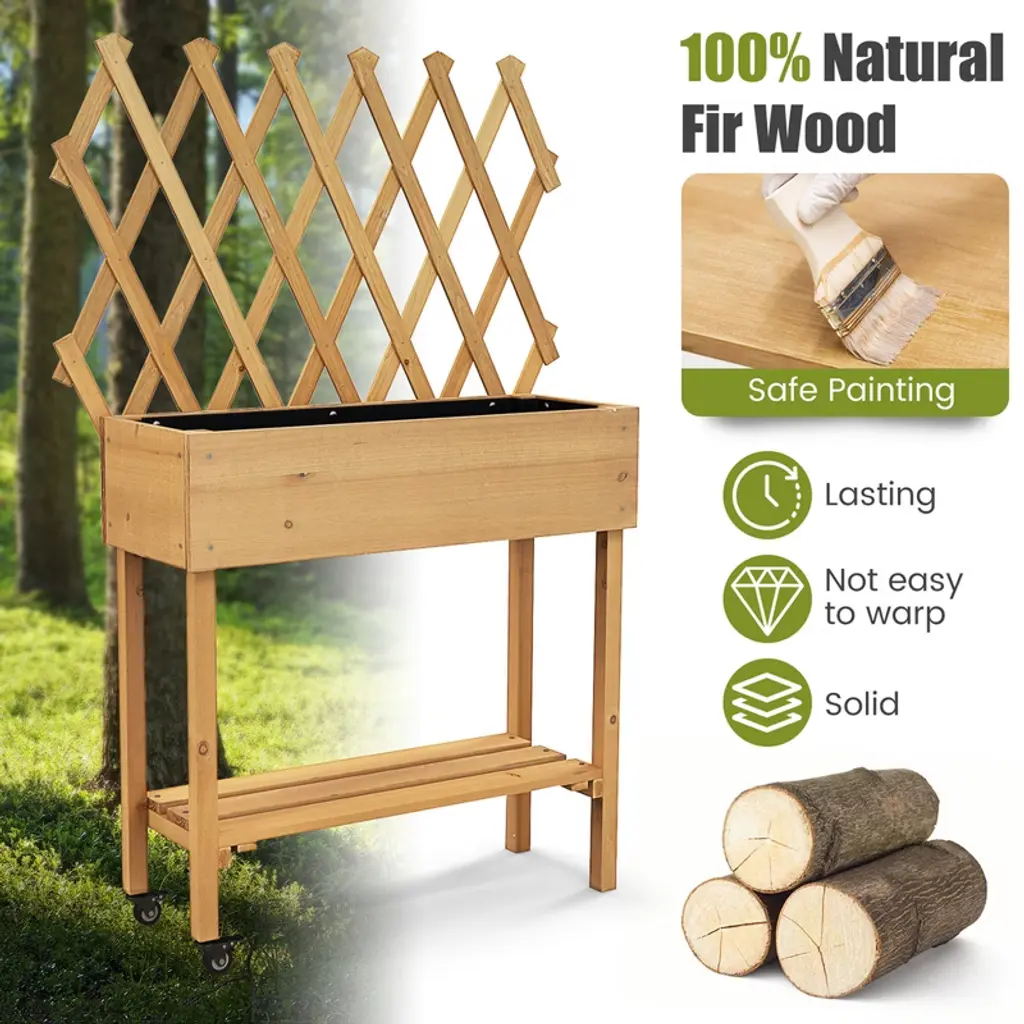 Revolutionize your planting experience with the wood raised garden bed! This 3-in-1 wood garden planter provides a practical solution for growing a variety of plants. The planter box features drainage gaps to prevent water-logging and promote airflow. Additionally, there is a non-woven liner to prevent the board from swelling. The built-in trellis offers support for climbing plants, creating a stunning green backdrop. Additionally, the slatted storage shelf will keep your tools organized. Crafted from fir wood, the garden bed is sturdy and crack-resistant. With natural wood finish, the elevated garden planter can adapt to outdoor weathers for longer lifespan. With a height of 30", it protects your plants from animals and allows for easy access for watering. Plus, with lockable wheels, you can easily move your garden bed to the perfect spot for sunlight or shelter from bad weather.FeaturesThe large planter box provides ample space for growing vegetables, fruits or flowers Functional climbing trellis is suitable for growing climbing plants, or hanging basket plants and light strips Equipped with storage shelf for gardening tools 100% natural fir wood with safe painting is lasting and solid Non-woven liner can prevent soil leakage and keep soil humidity 4 corner drainage holes and drainage gaps promote ventilation Easier to reposition the planting bed for optimal sunlight with 2 lockable wheels Avoiding small animals from destroying plants with 30” ergonomic height Color: Natural Material: Fir Wood, Liner Fabric Overall Dimensions: 36" x 12" x 51" (L x W x H) Size of the Planter Box: 30" x 11" x 7.5" (L x W x H) Height of the Planter Box: 30" Interior Size of the Planter Box: 29" x 10" x 6" (L x W x H) Size of the Bottom Shelf: 26.5" x 10" (L x W) Height of the Bottom Shelf: 78" Weight Capacity of the Planter Box: 66 lbs Weight Capacity of the Bottom Shelf: 44 lbs Net Weight:13.5 lbs Package Includes: 1 x Wooden Raised Garden Bed 1 x User’s Manual
