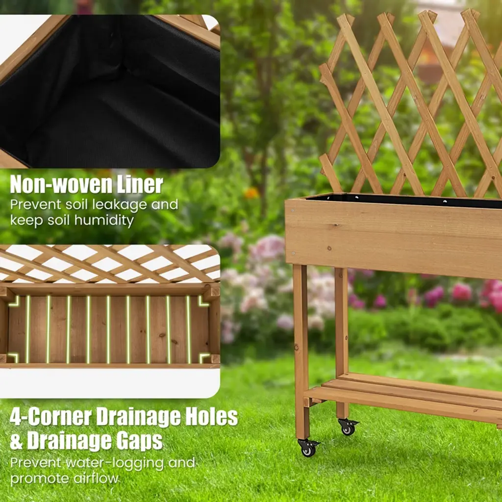 Costway Wood Raised Garden Bed With Trellis Storage Shelf Wheels Liner Drainage Holes
