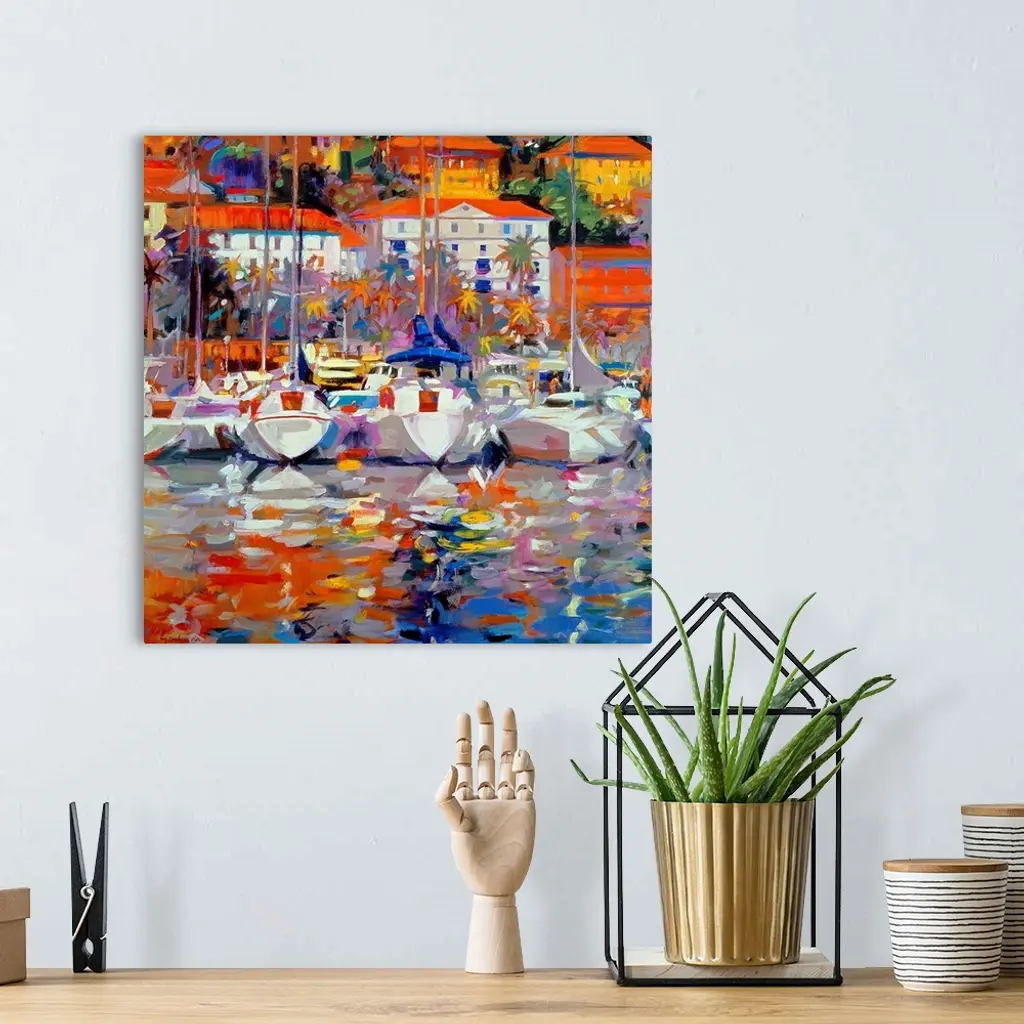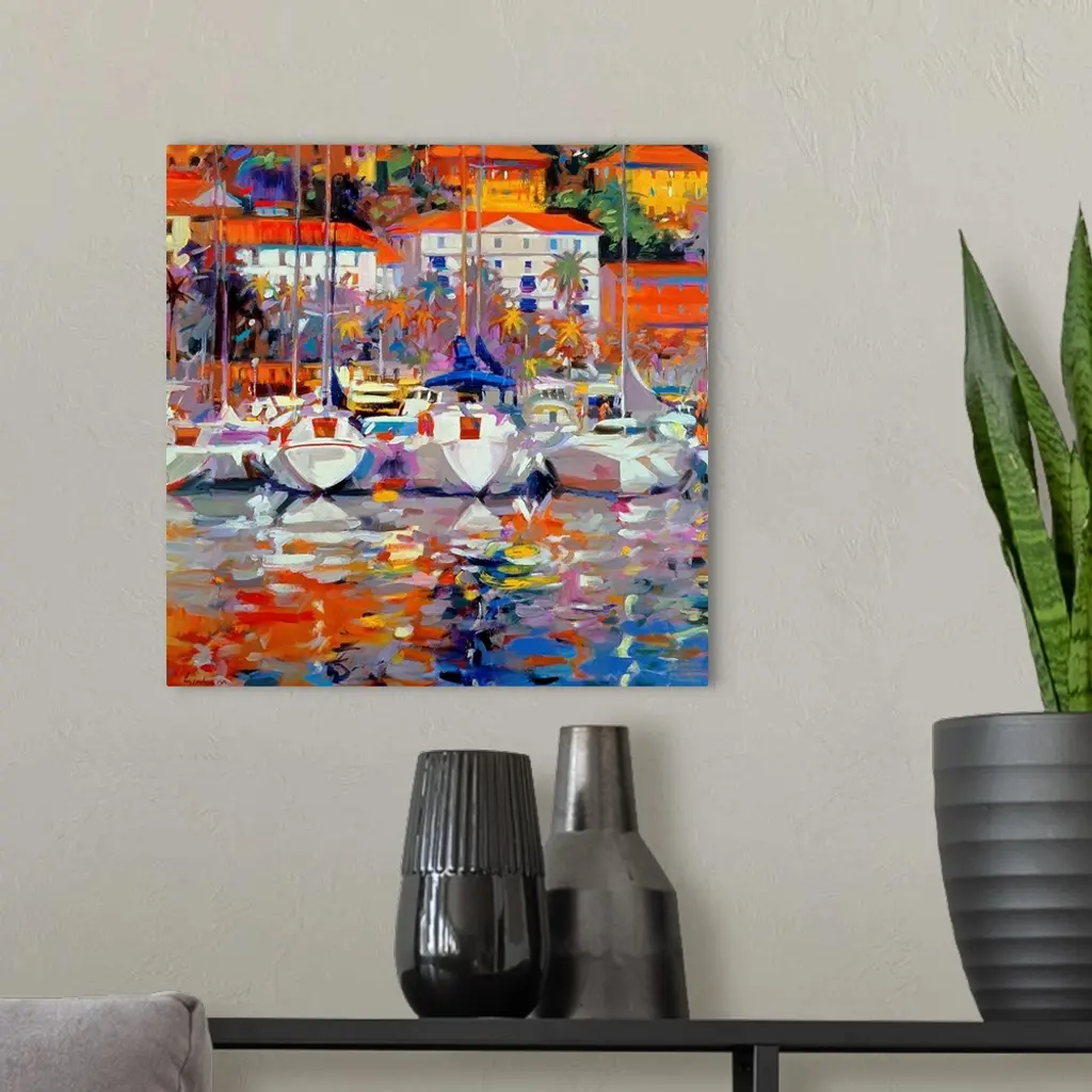 A landscape painting of dozens of beautiful yachts and sail boats docked in the harbor of a coastal town built on to a hill.