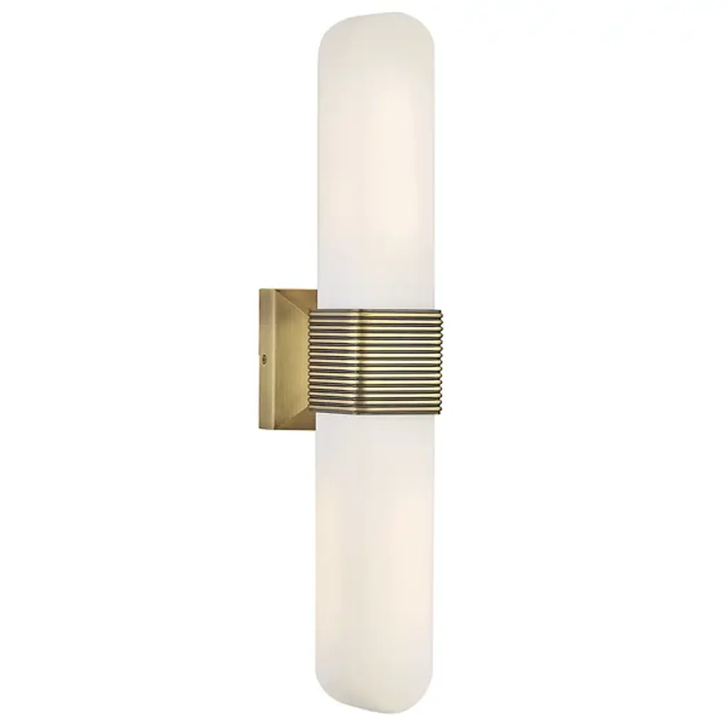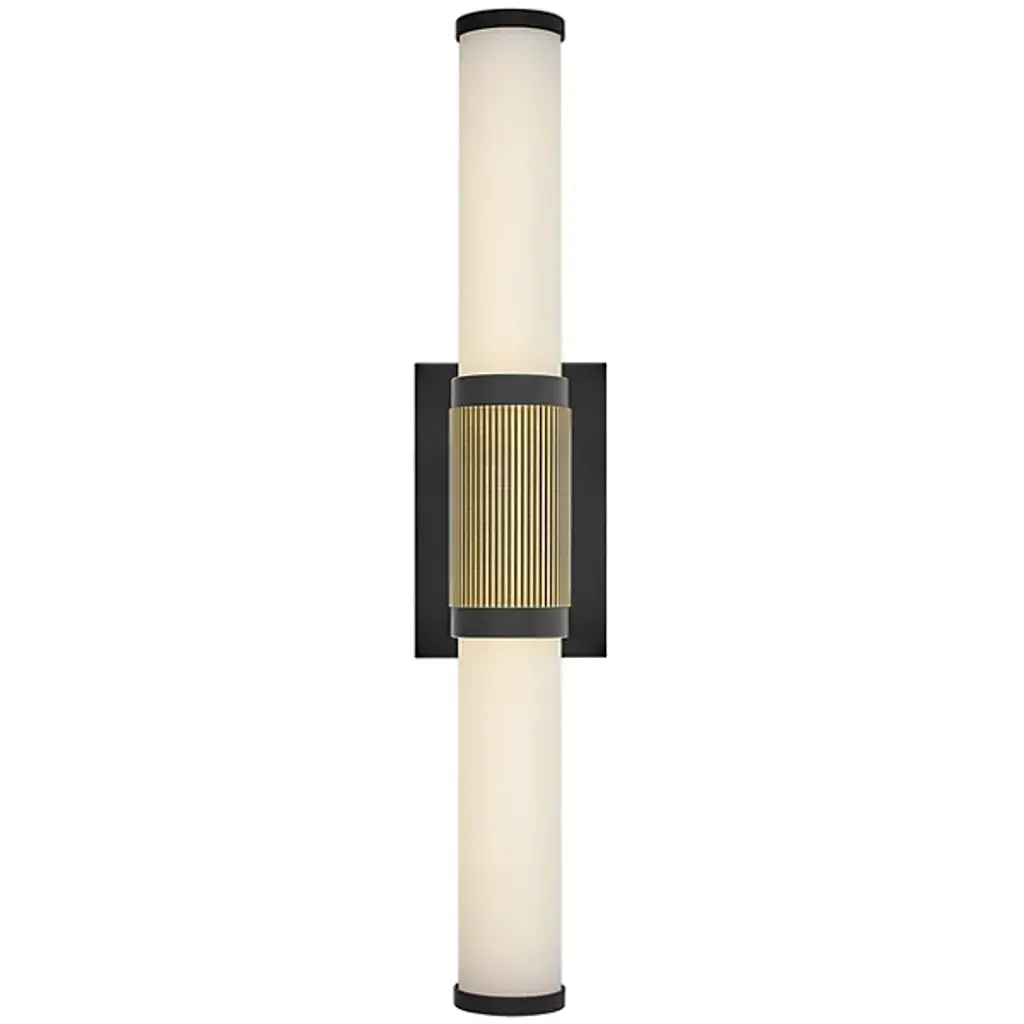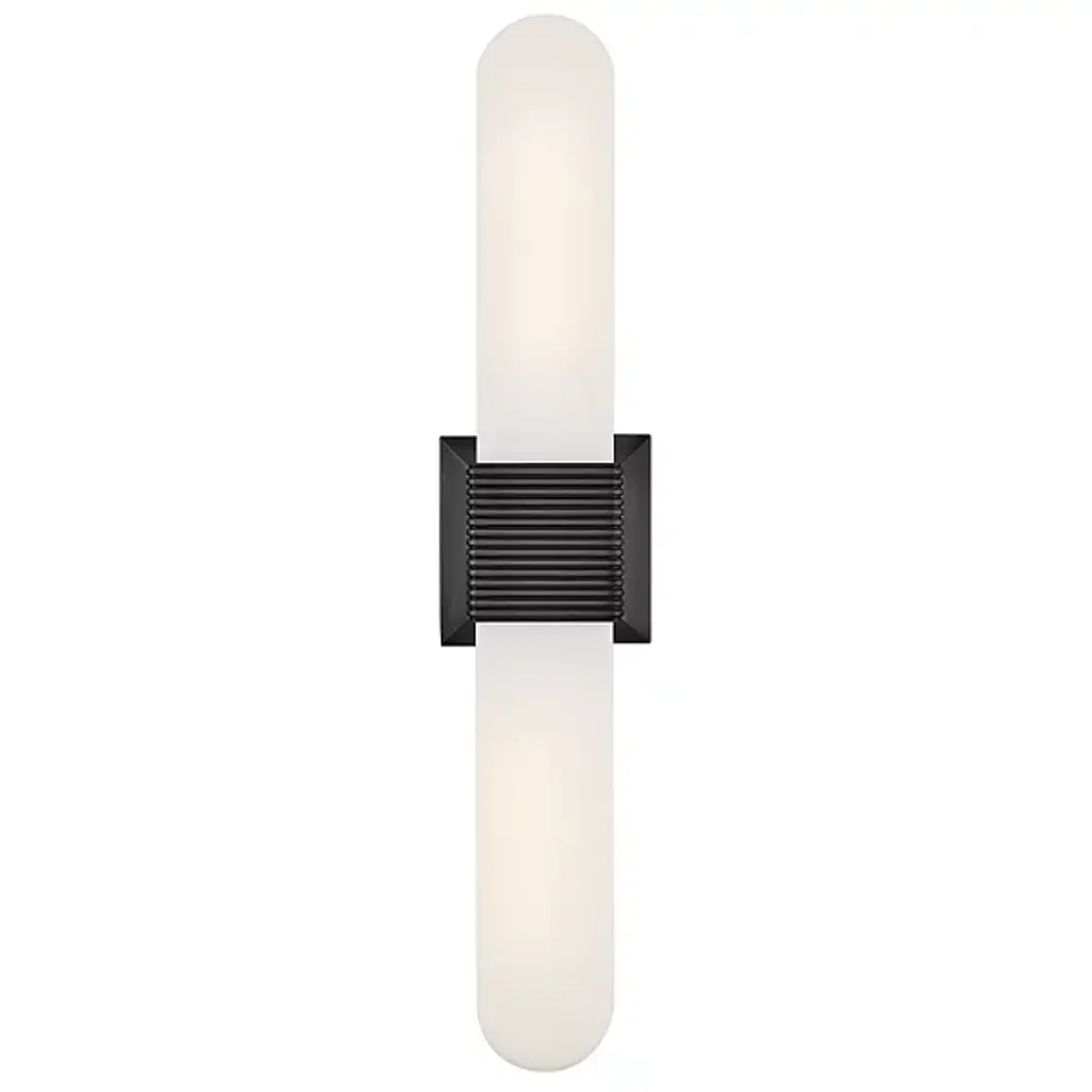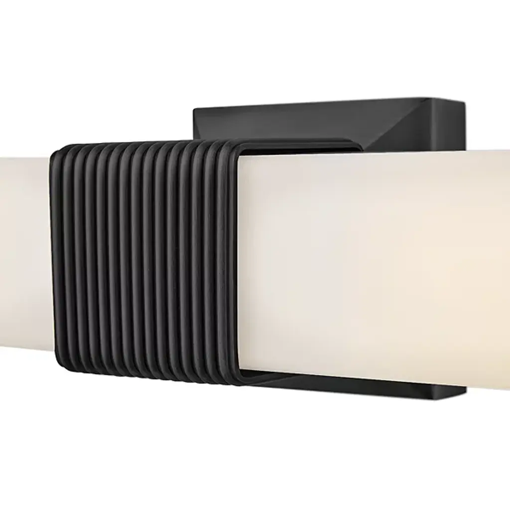 The Cotes Vanity Light from Hinkley integrates LED technology within an elongated form punctuated by a distinctive ribbed collar detail. Its etched opal glass diffuses light evenly, while the clean aluminum frame offers flexible mounting options - place it horizontally or vertically to suit your space. Square accents along the design provide architectural definition, making this light equally suited for bathrooms or living areas. Hidden mounting hardware maintains the pure lines of this adaptable fixture.