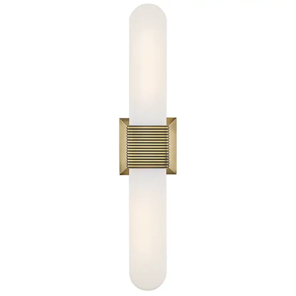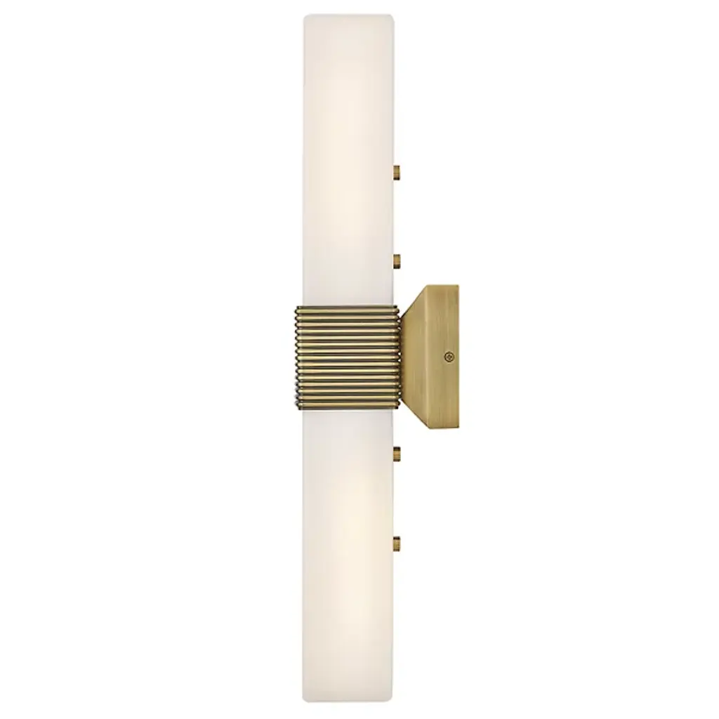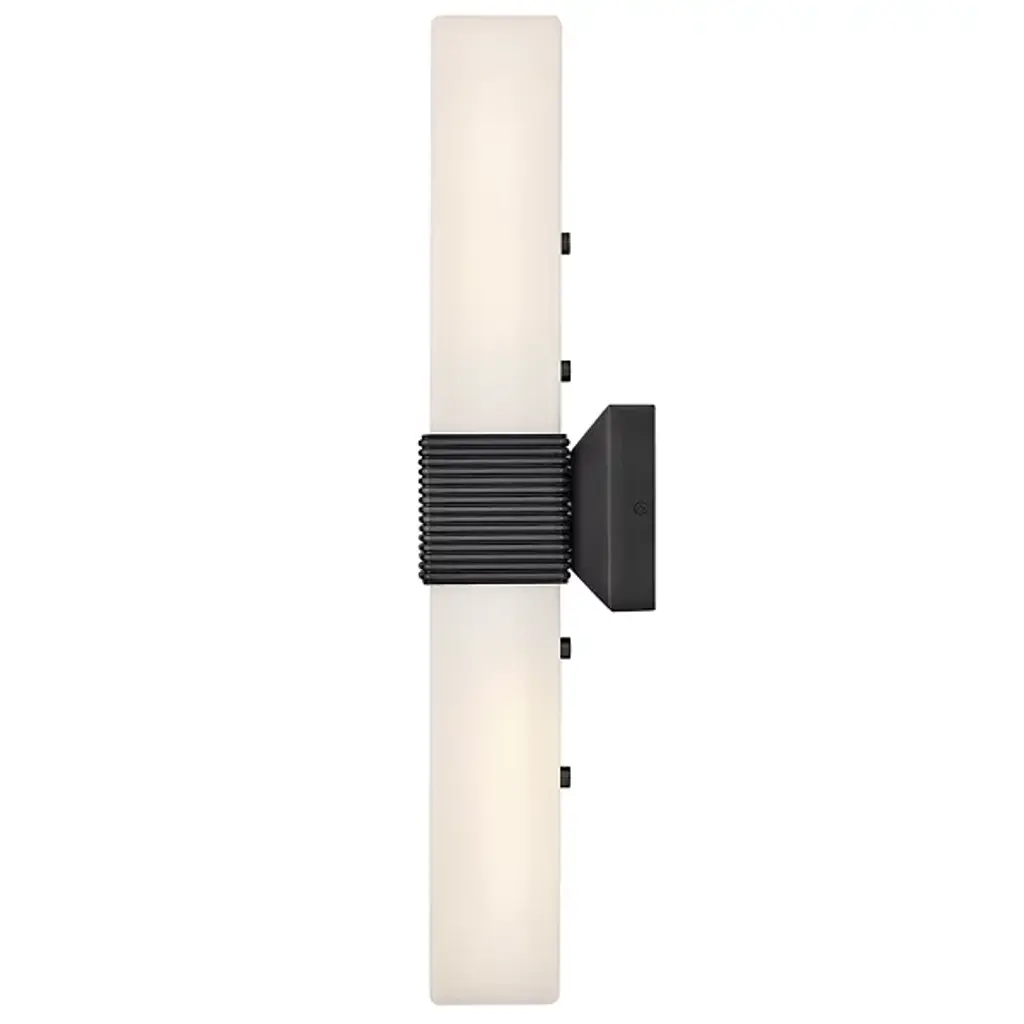 The Cotes Vanity Light from Hinkley integrates LED technology within an elongated form punctuated by a distinctive ribbed collar detail. Its etched opal glass diffuses light evenly, while the clean aluminum frame offers flexible mounting options - place it horizontally or vertically to suit your space. Square accents along the design provide architectural definition, making this light equally suited for bathrooms or living areas. Hidden mounting hardware maintains the pure lines of this adaptable fixture.
